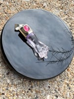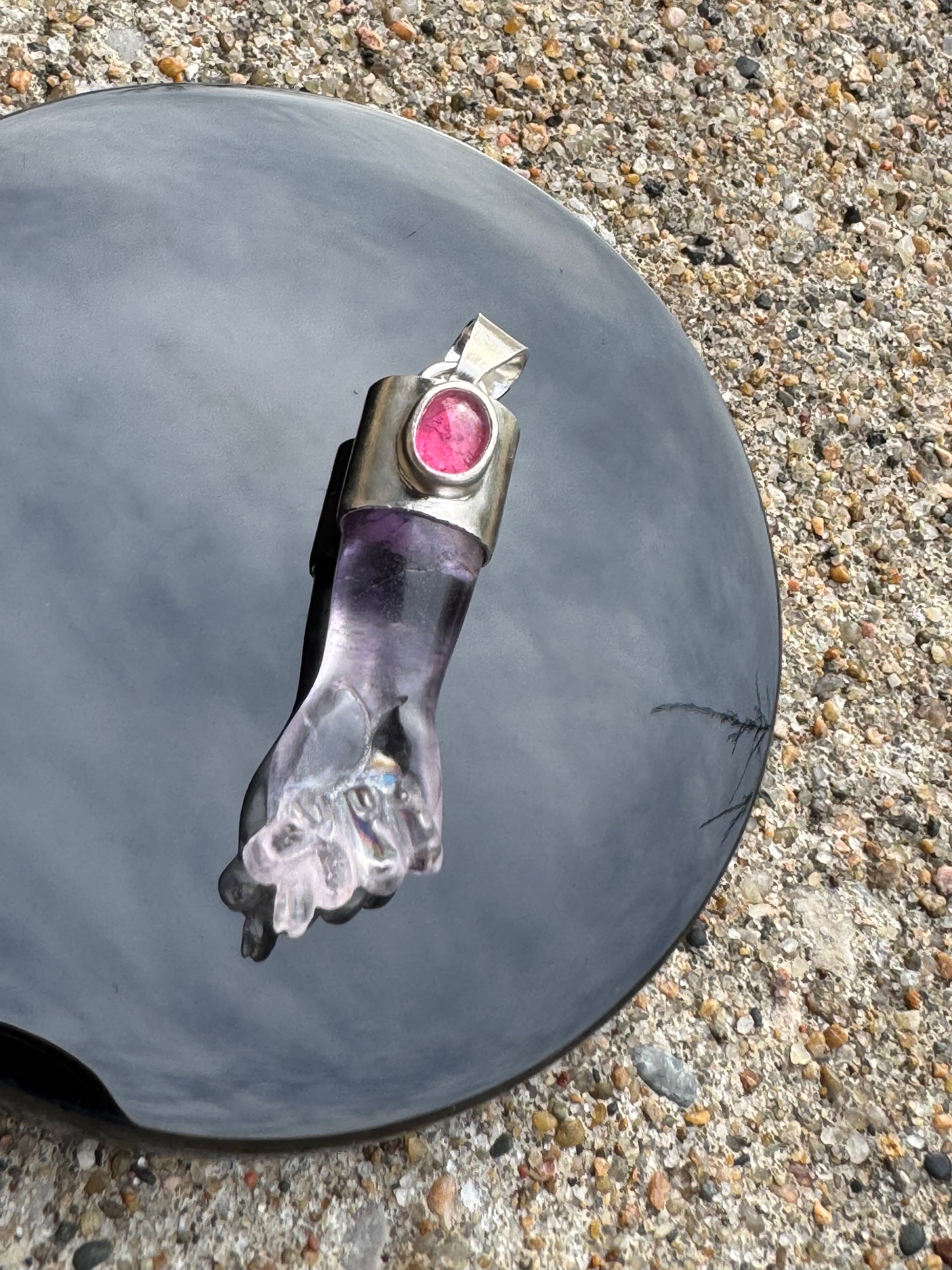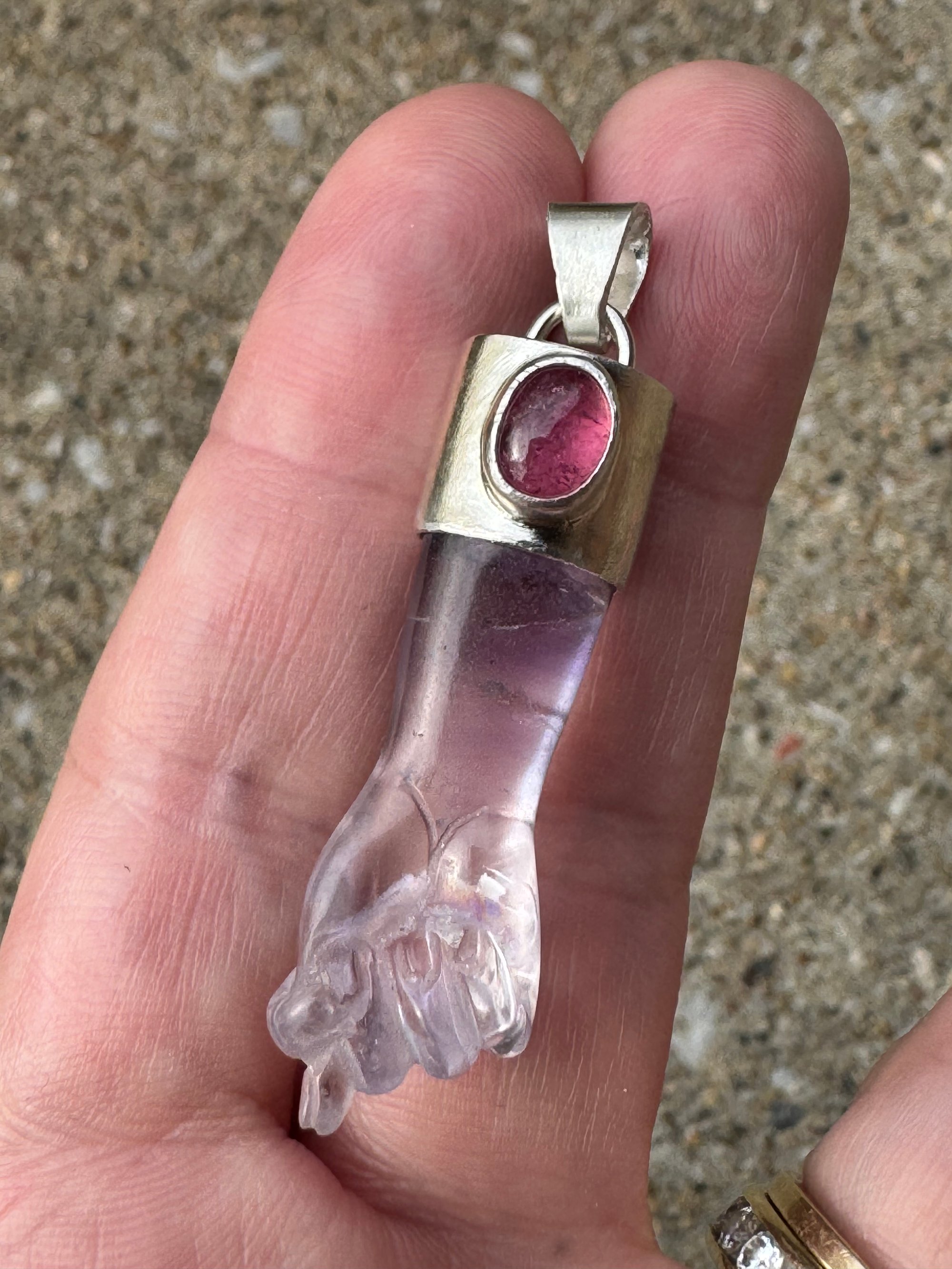 Amethyst mano figa with pink tourmaline accent set in Argentium silver. Measures approximately 1 7/8” x 1/2”