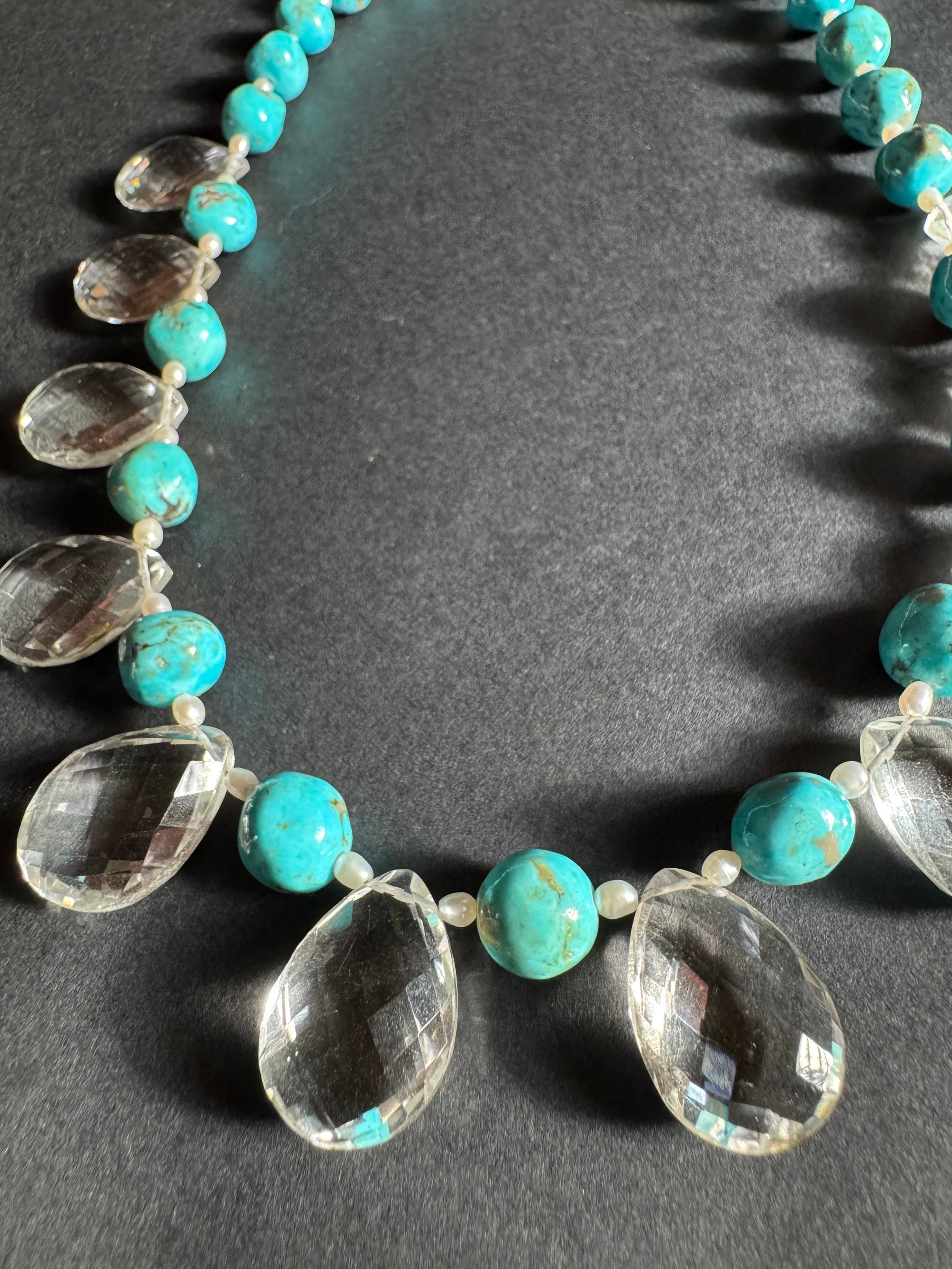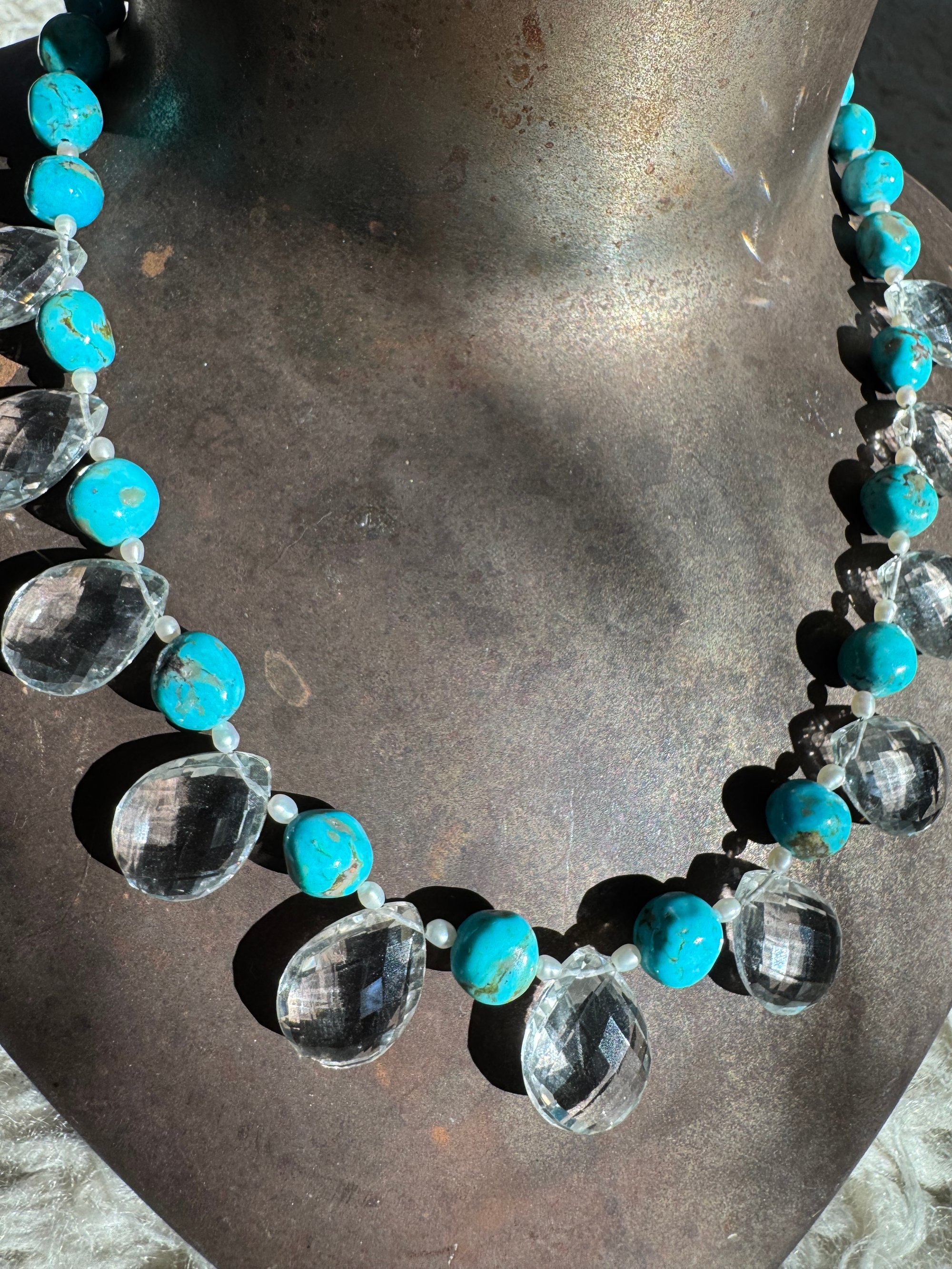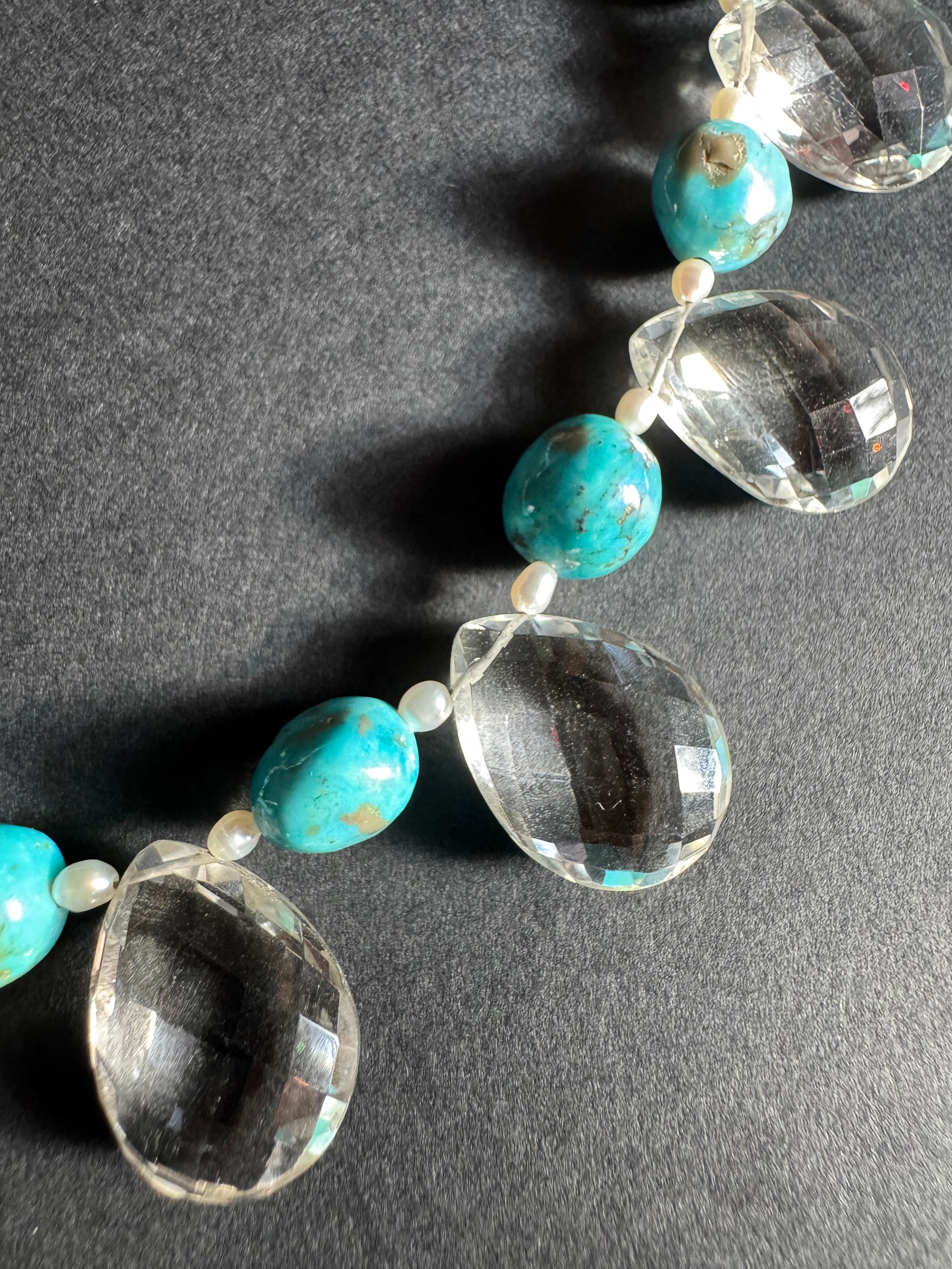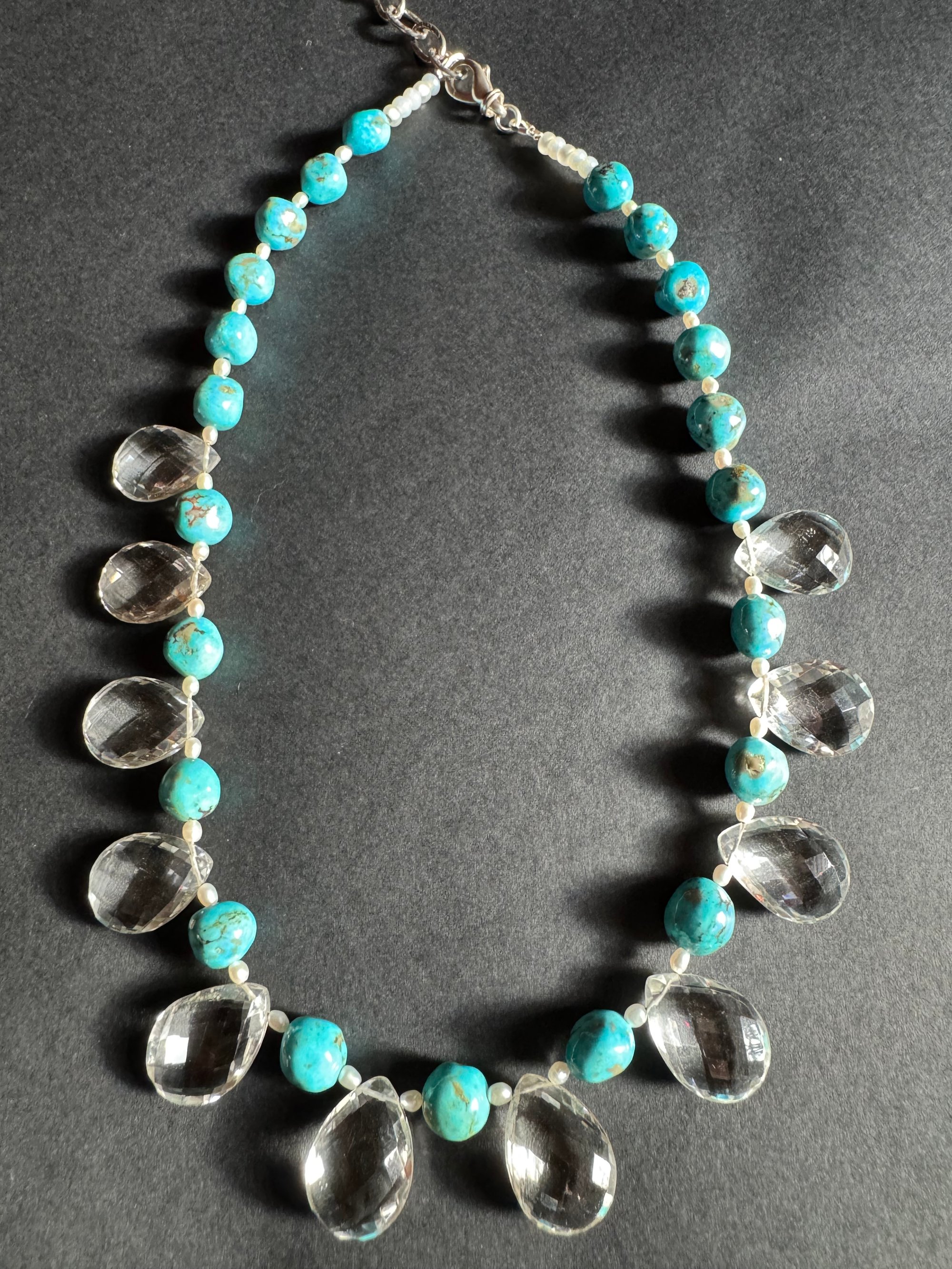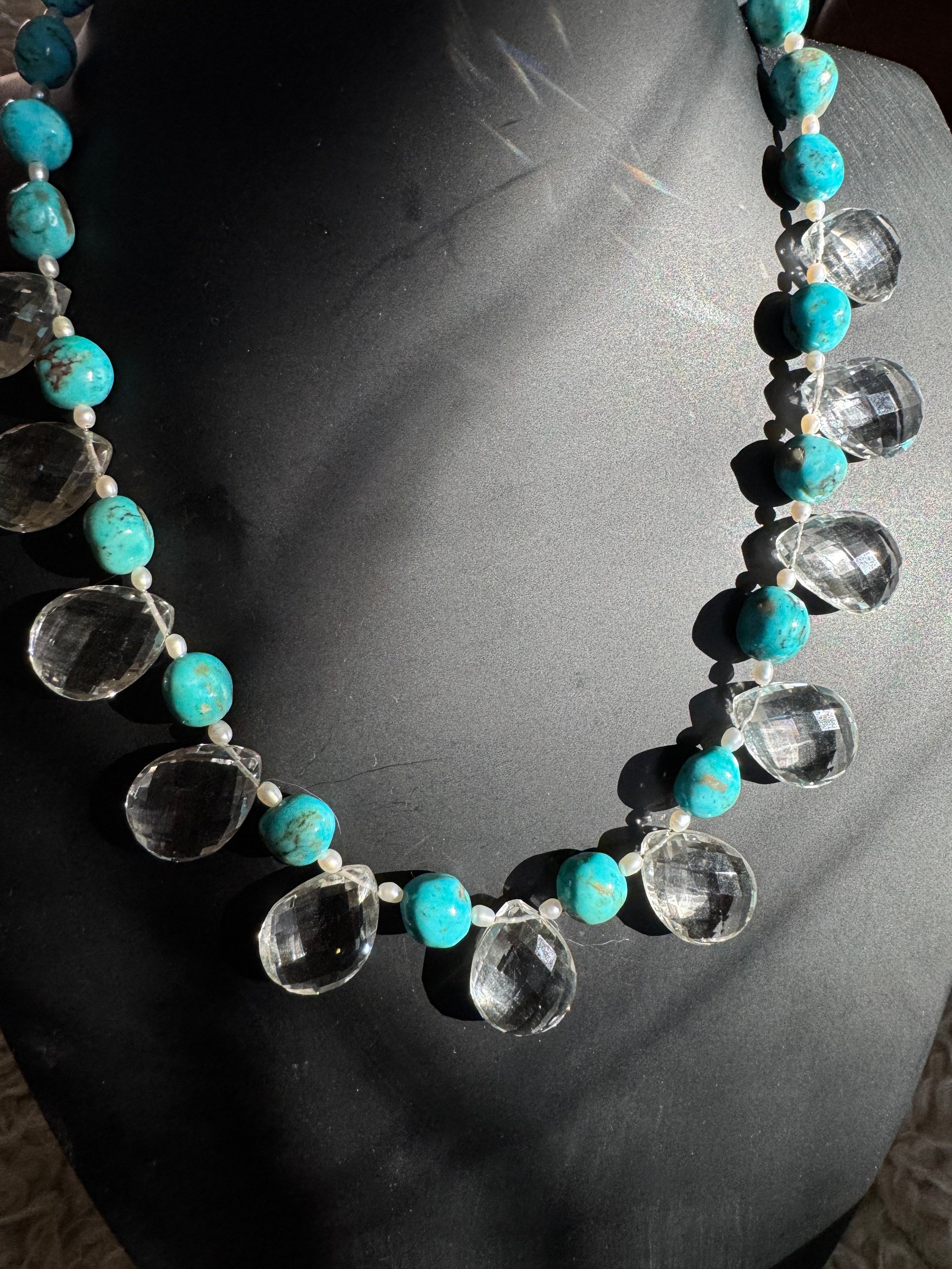 Quartz, turquoise, pearl, glass, sterling silver. Adjustable length 18.5”-20.5”
