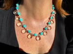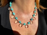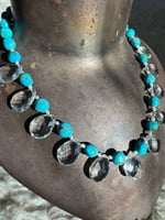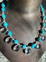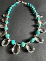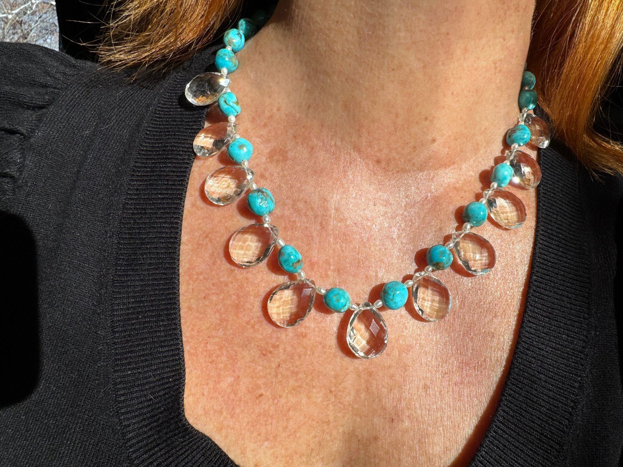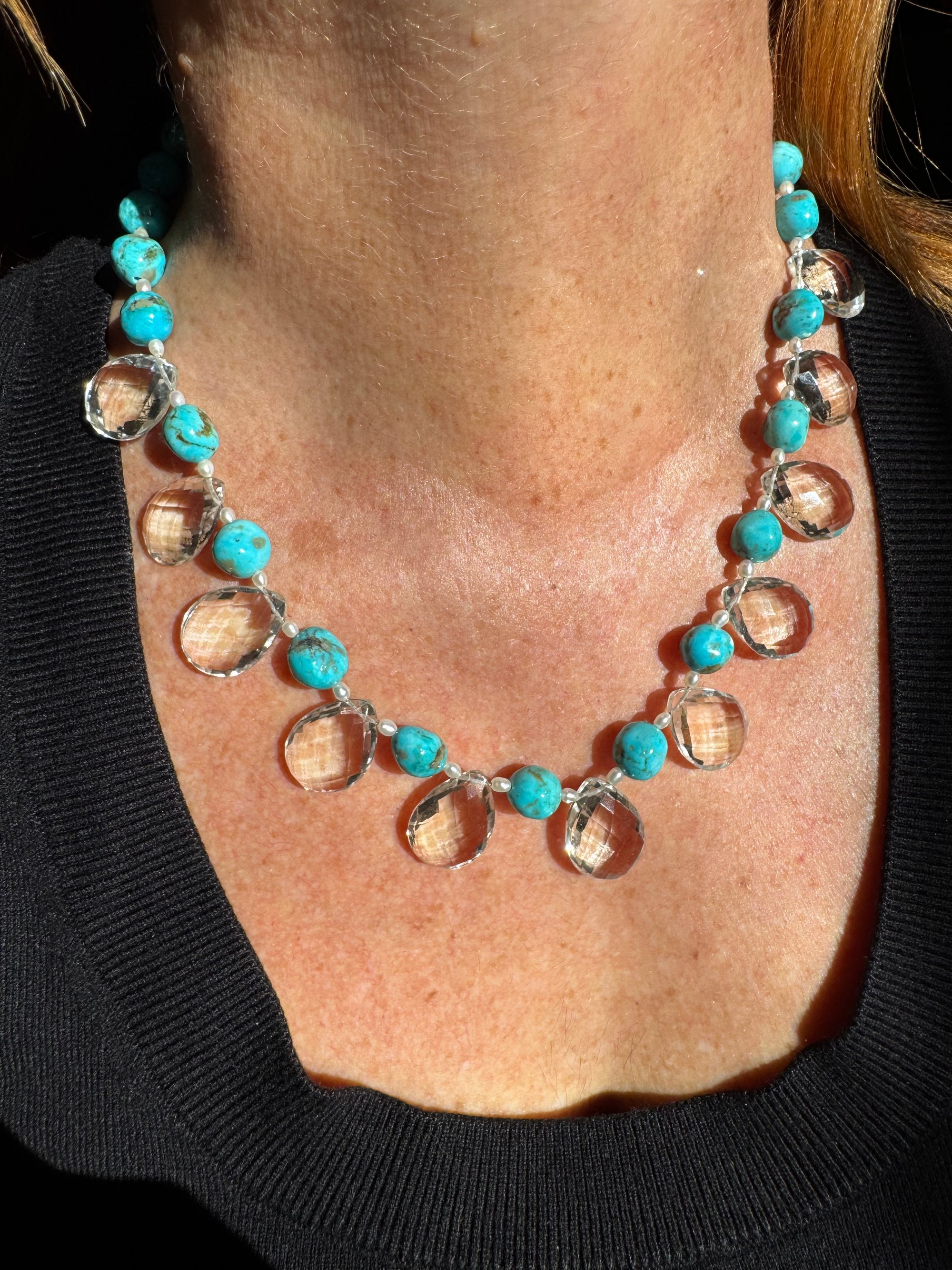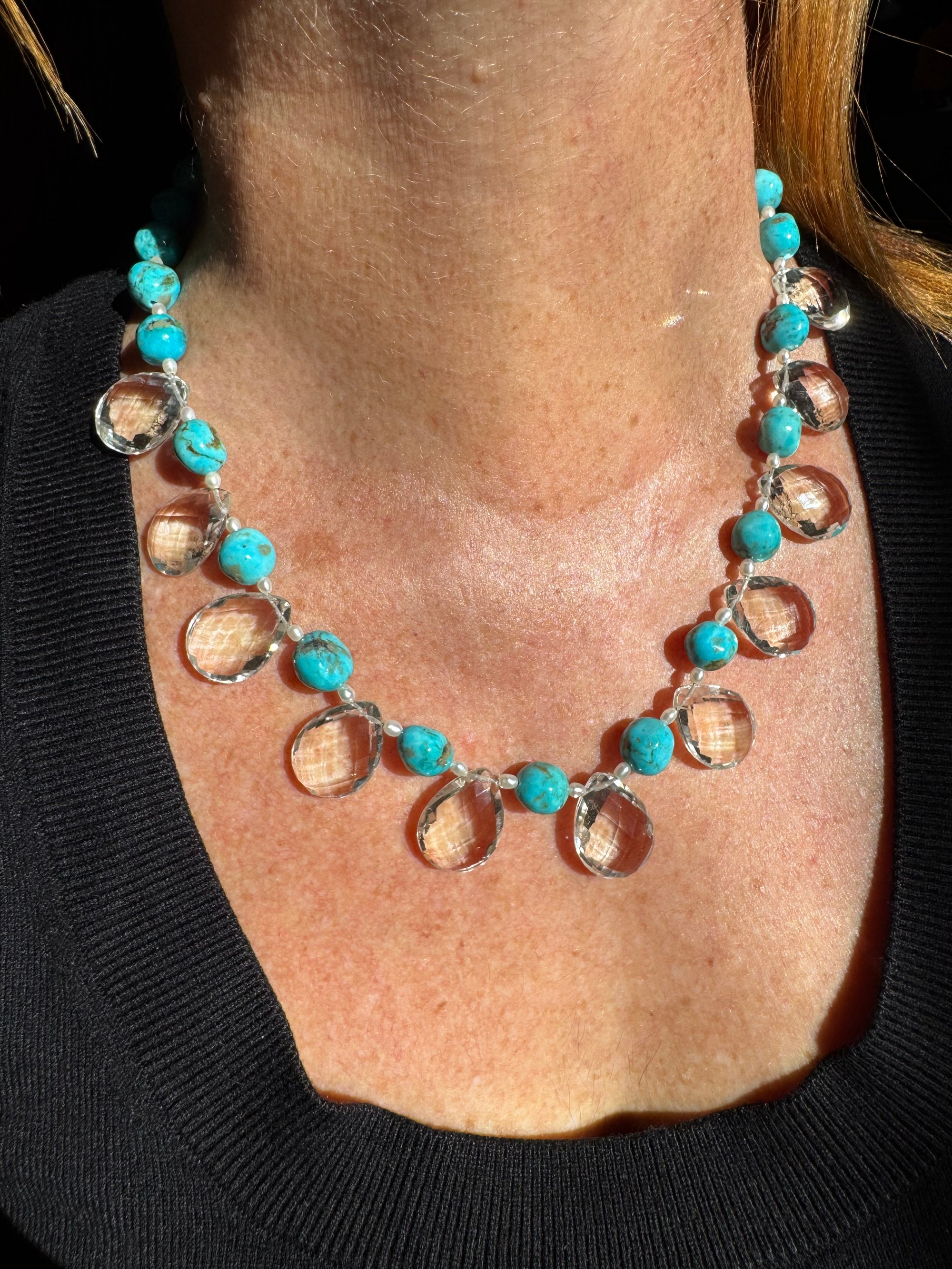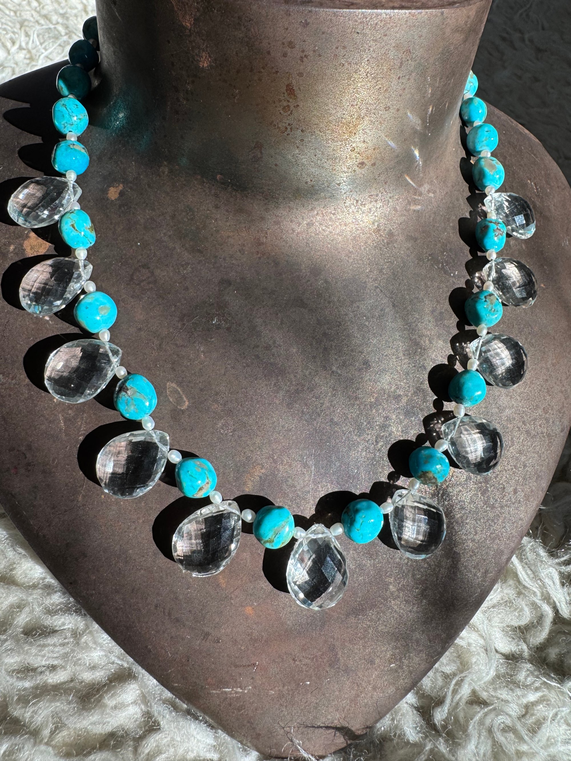 Quartz, turquoise, pearl, glass, sterling silver. Adjustable length 18.5”-20.5”