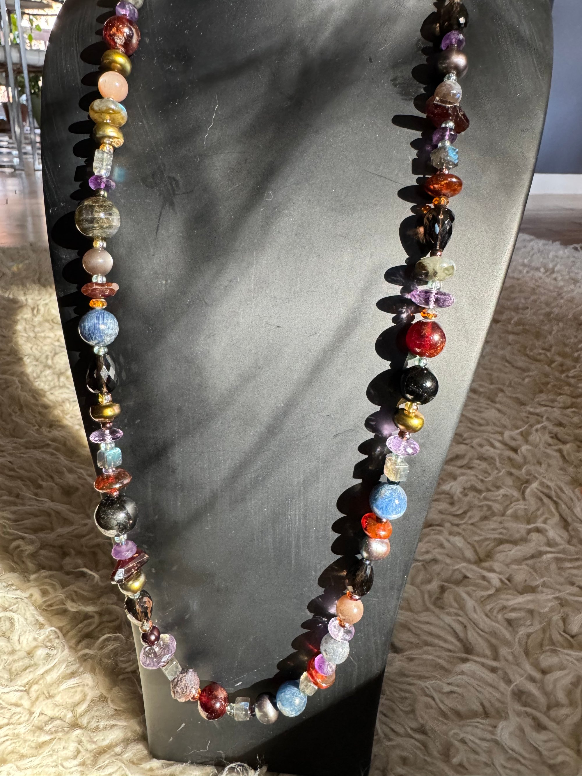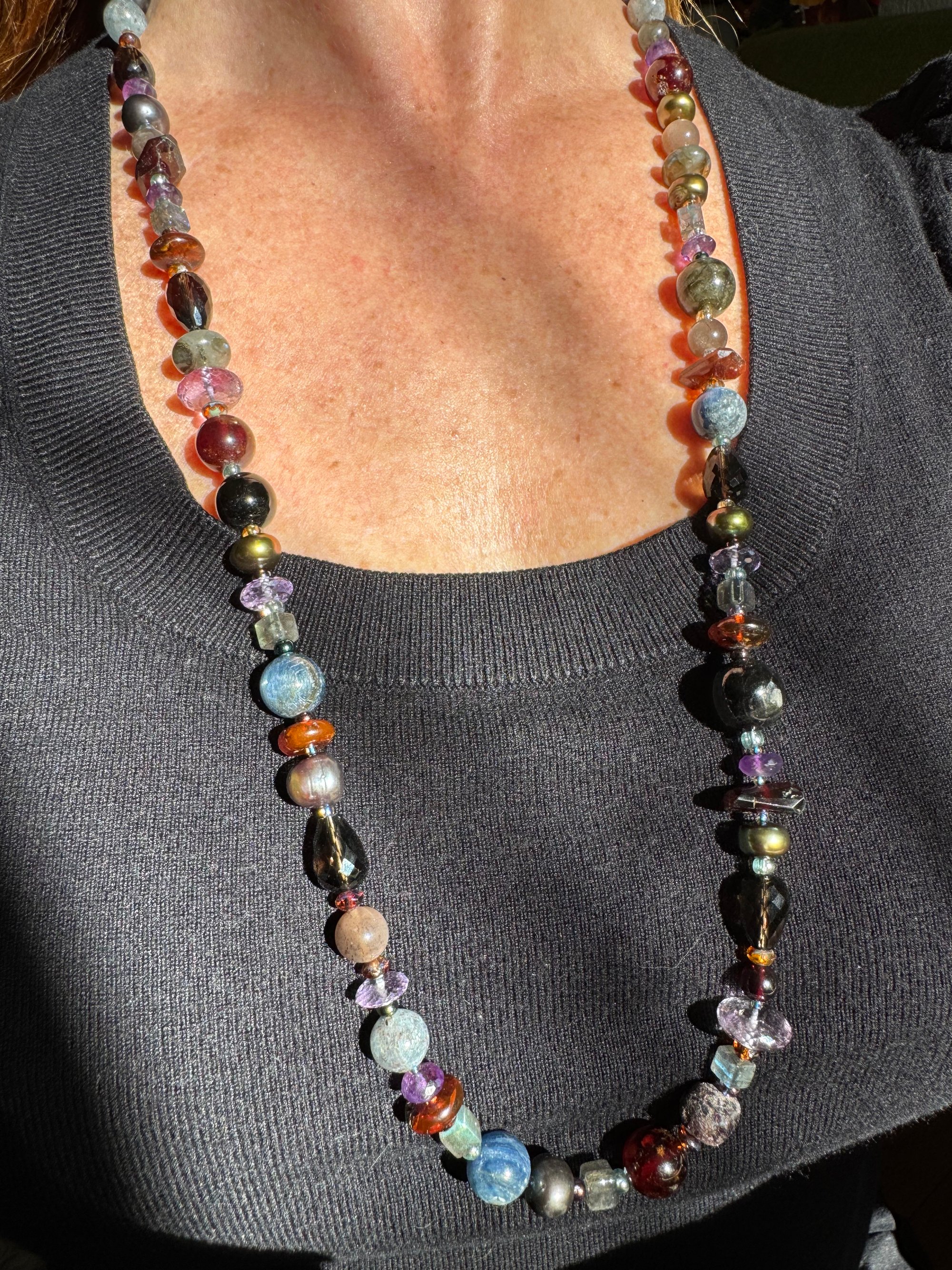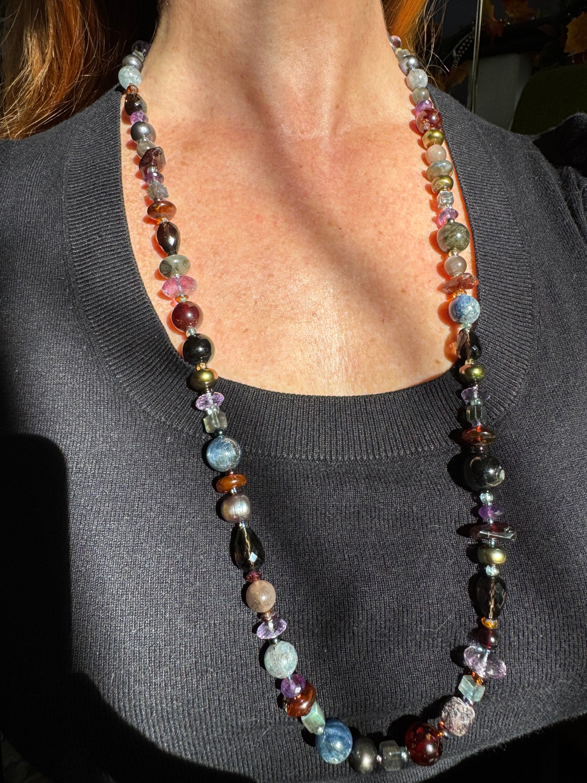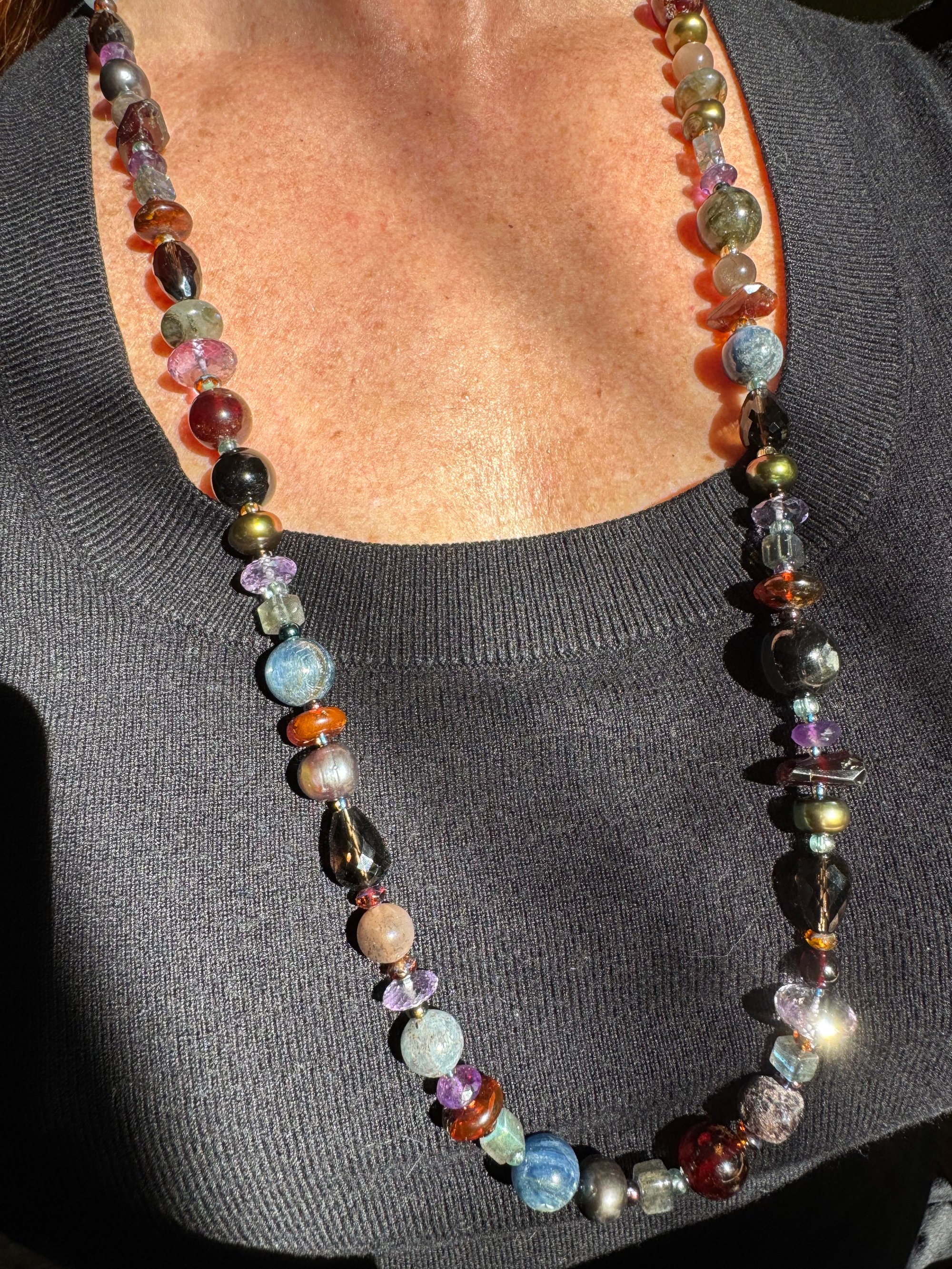 Garnet, amethyst, kyanite, hypersthene, smoky quartz, pearl, moonstone, amber, labradorite glass, sterling silver. 33.25” with fancy box clasp