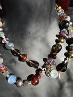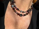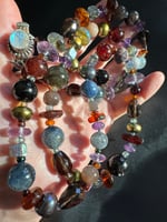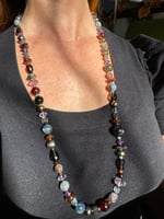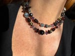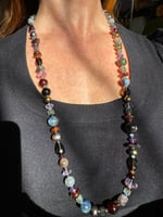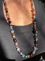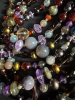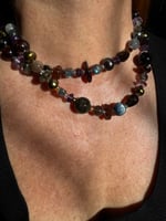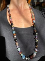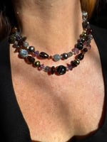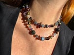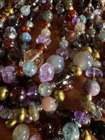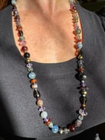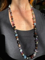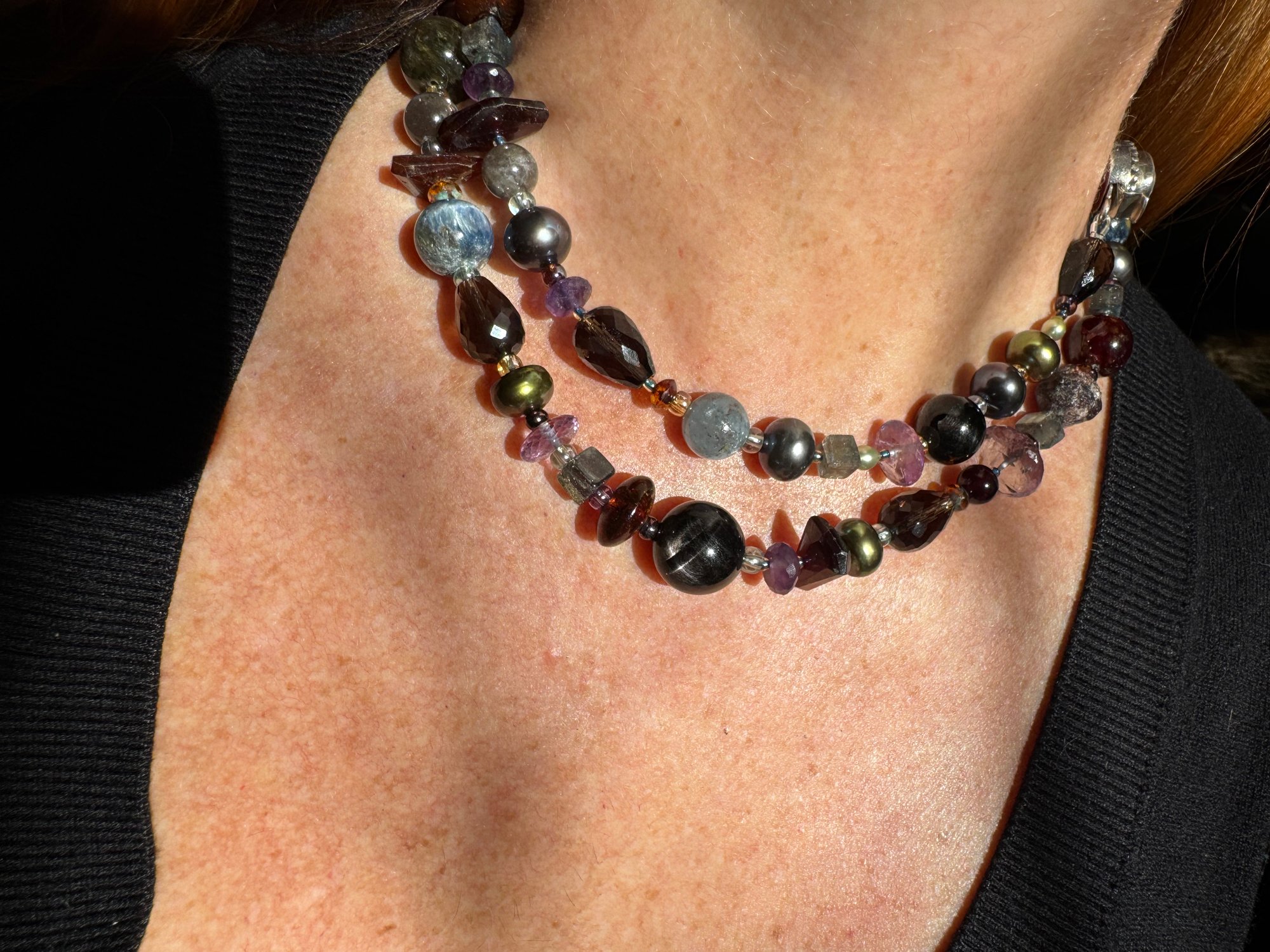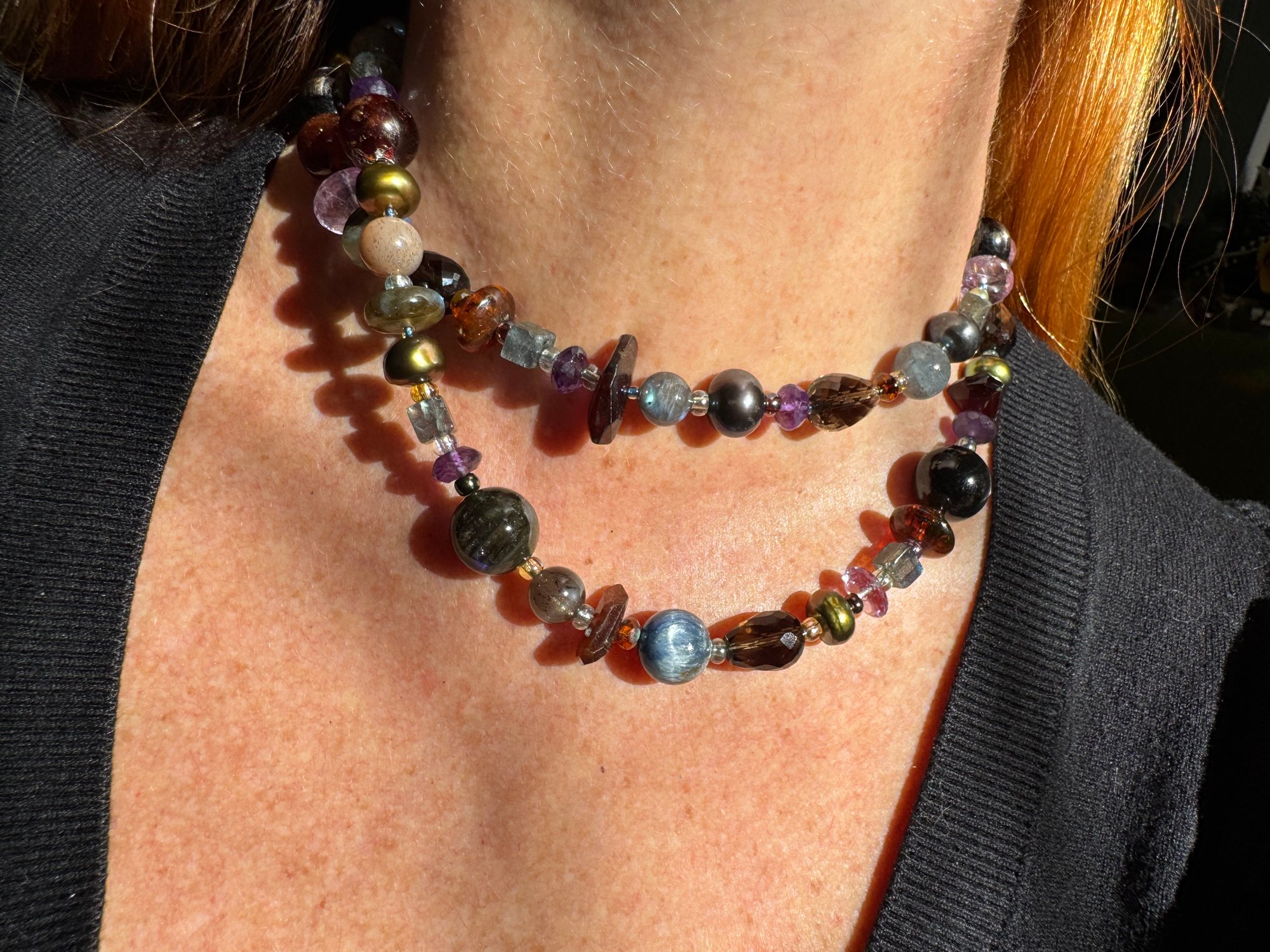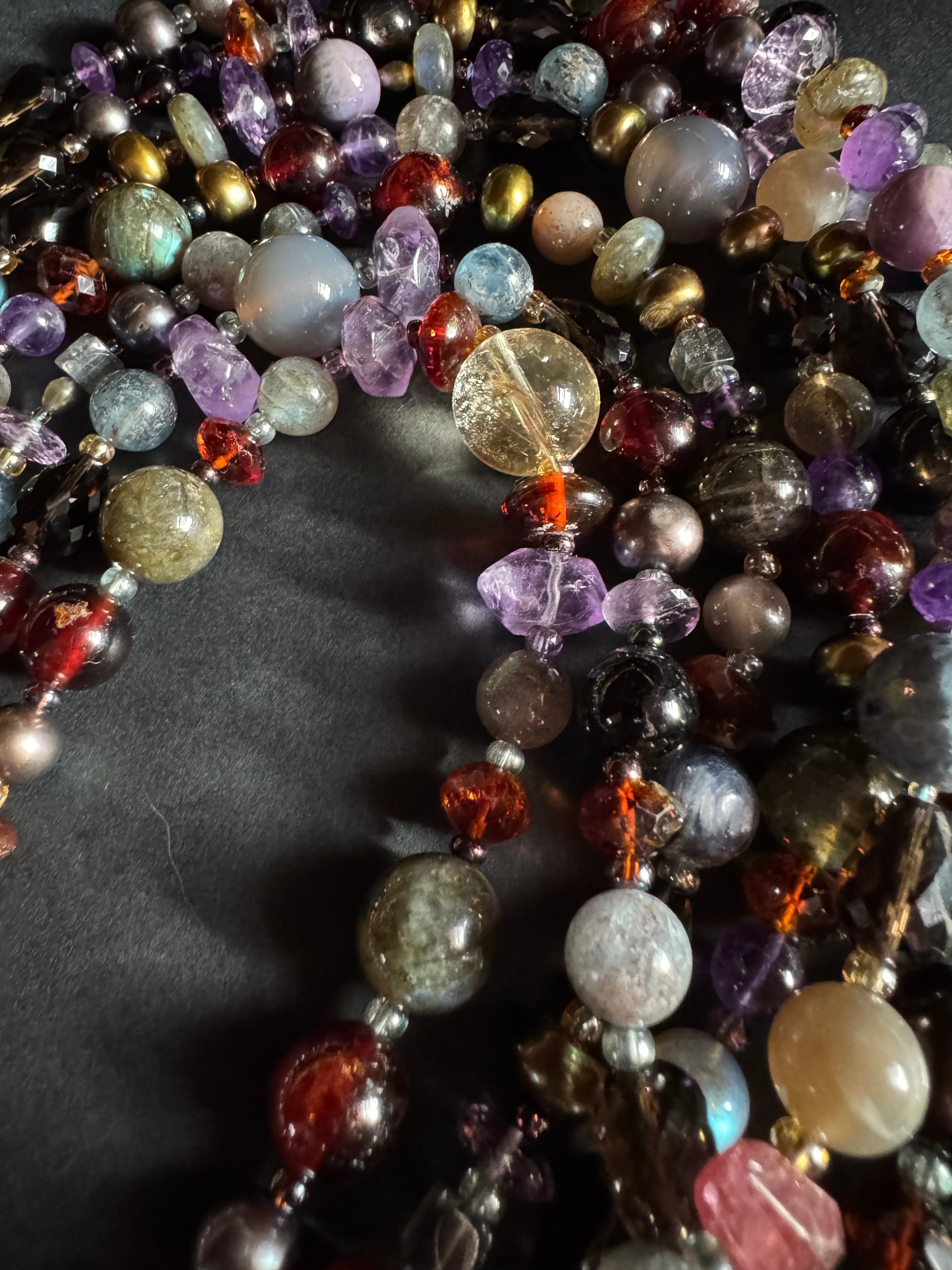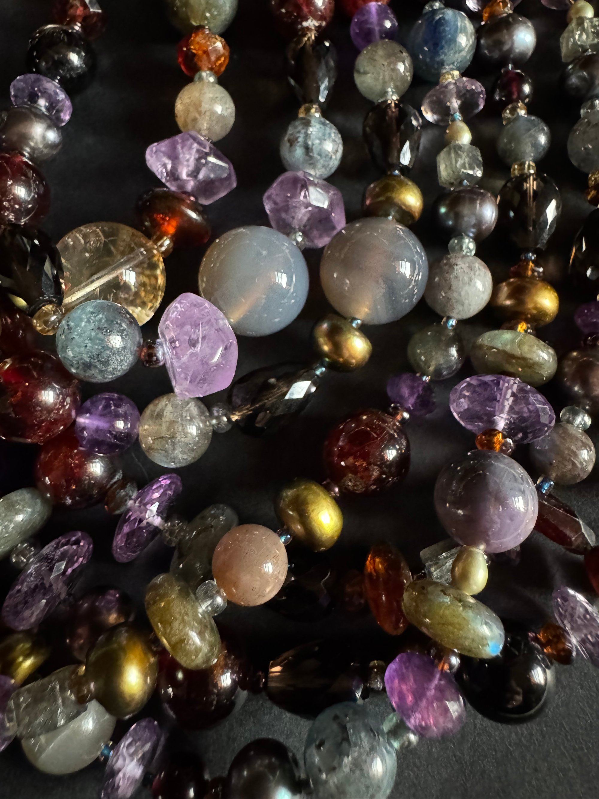 Garnet, amethyst, kyanite, hypersthene, smoky quartz, pearl, moonstone, amber, labradorite glass, sterling silver. 33.25” with fancy box clasp