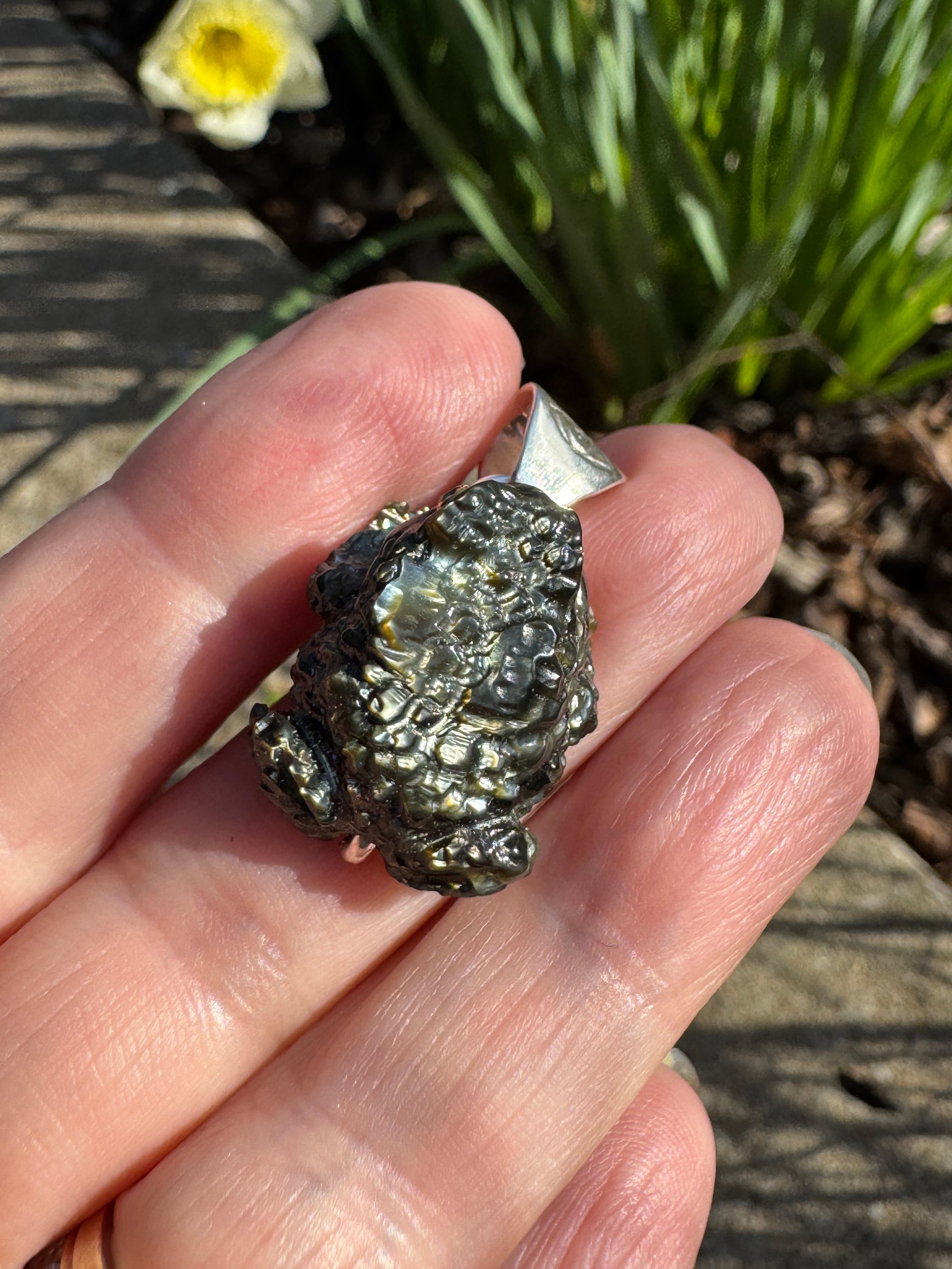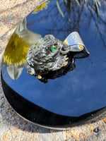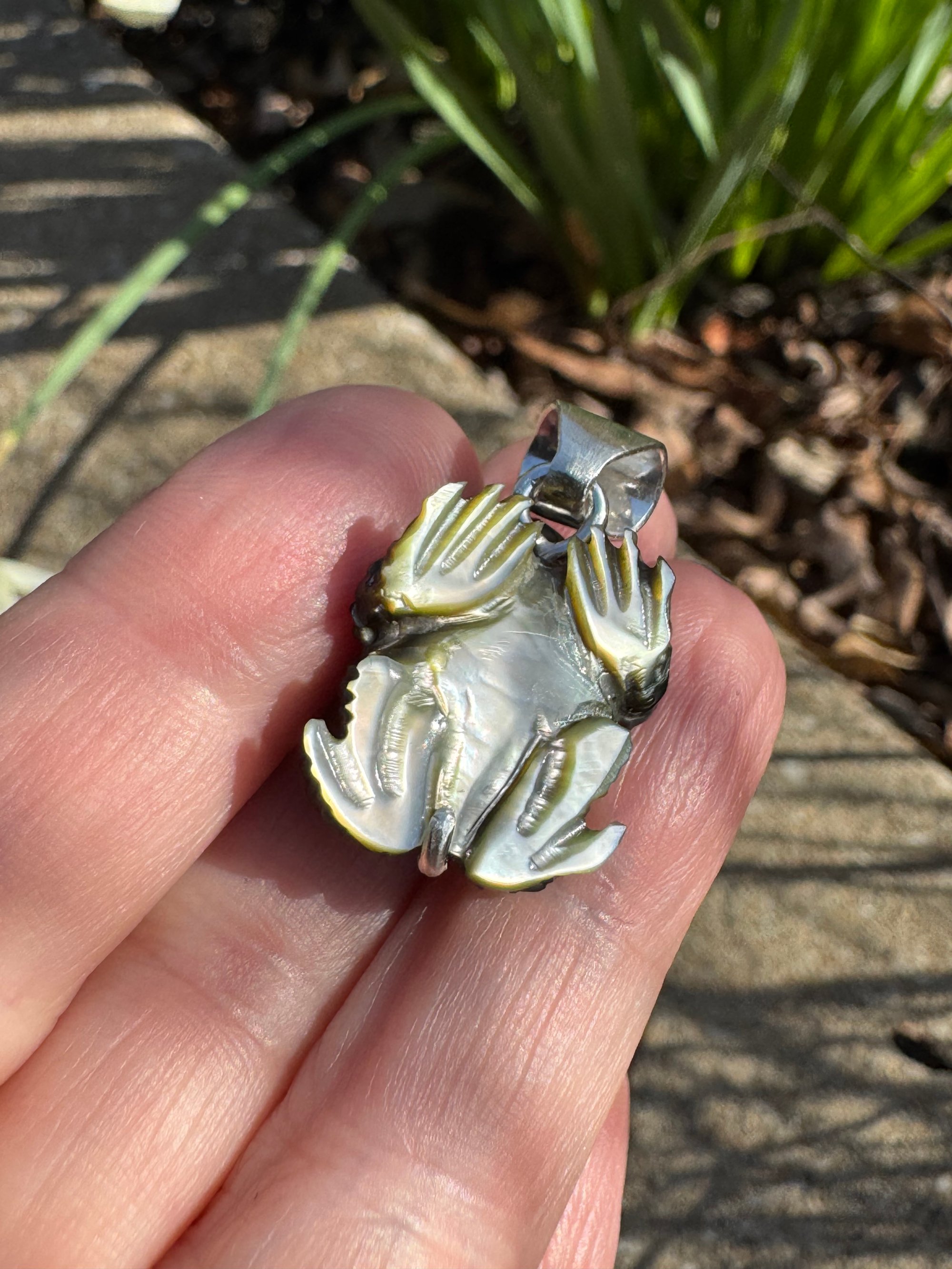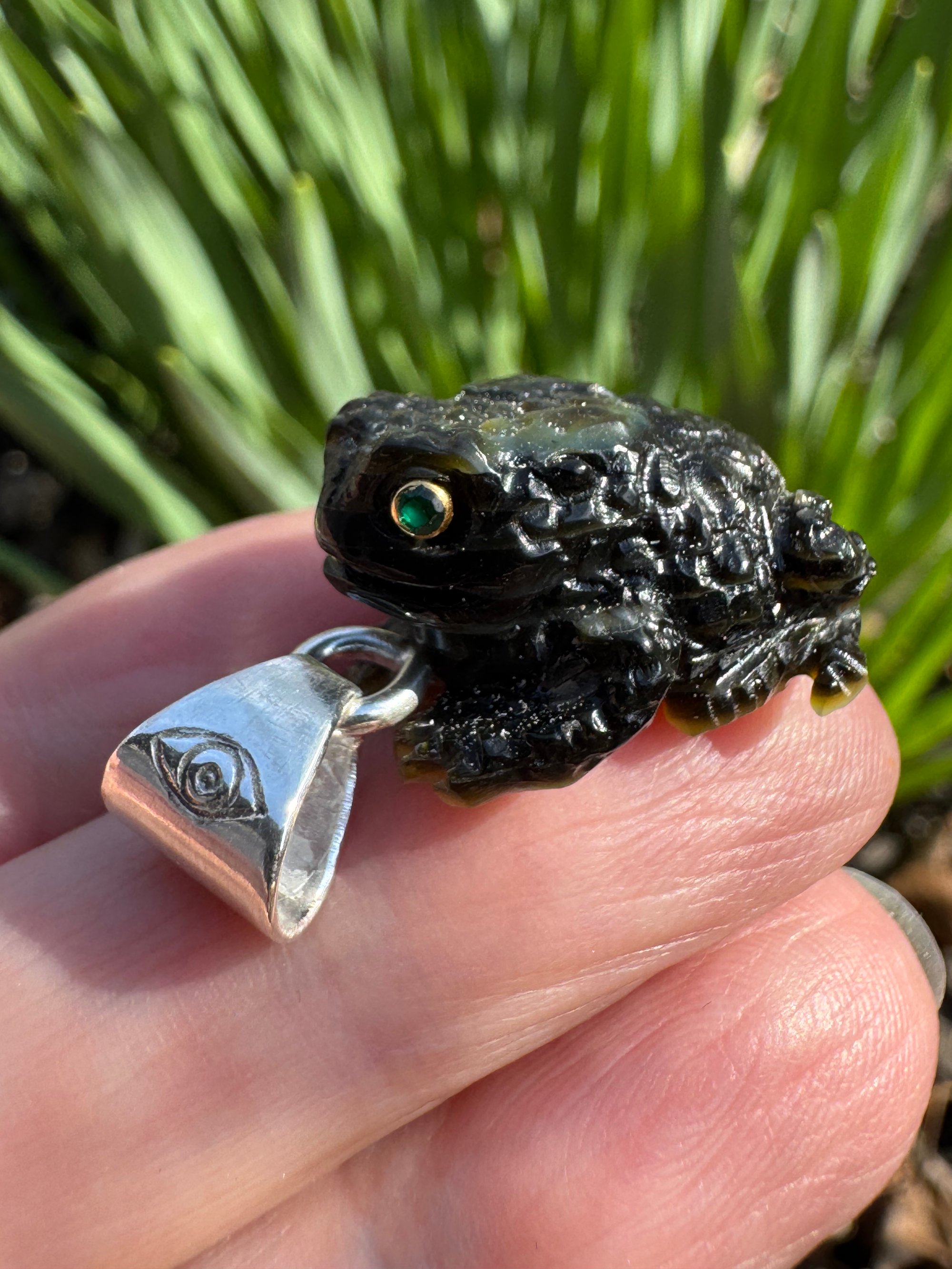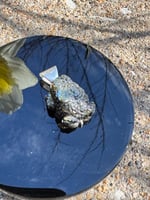 Mother of pearl toad with green gemstone eyes. Set in Argentium silver. Measures approximately 1 1/8” x 3/4” x 1/2”