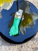 Chrysoprase mano figa set in argentium silver with moonstone accent. Measures approximately 1 7/8” x 1/2”