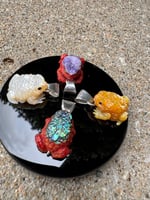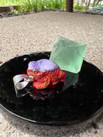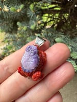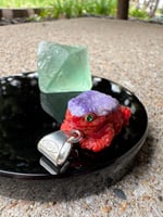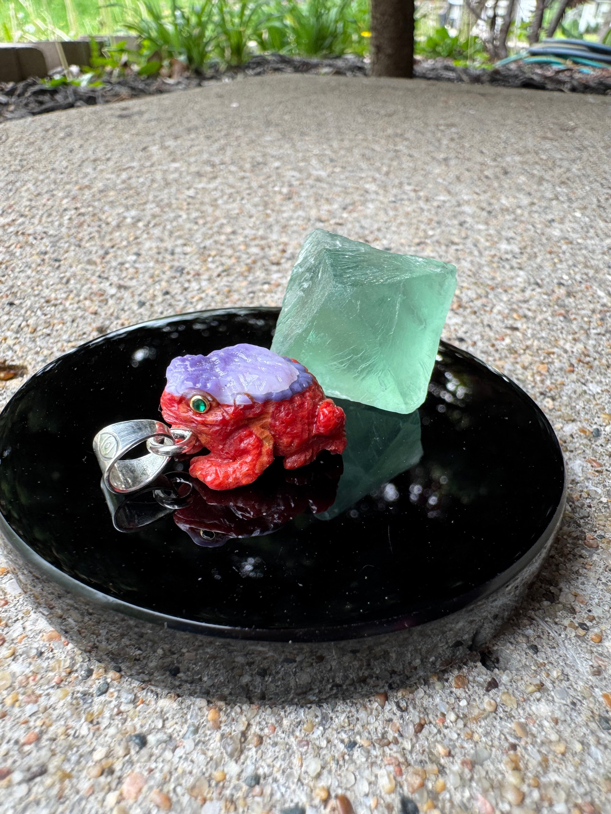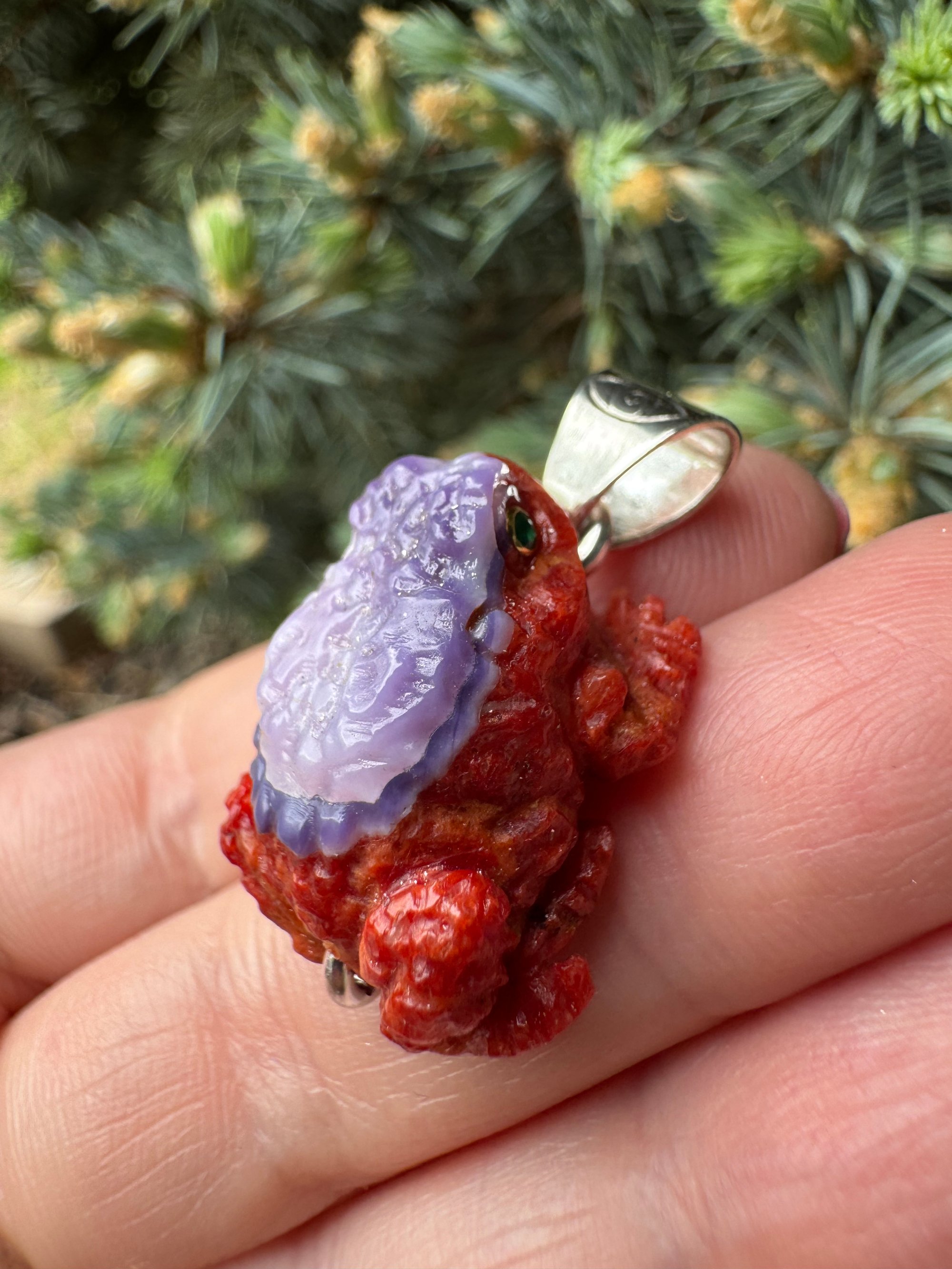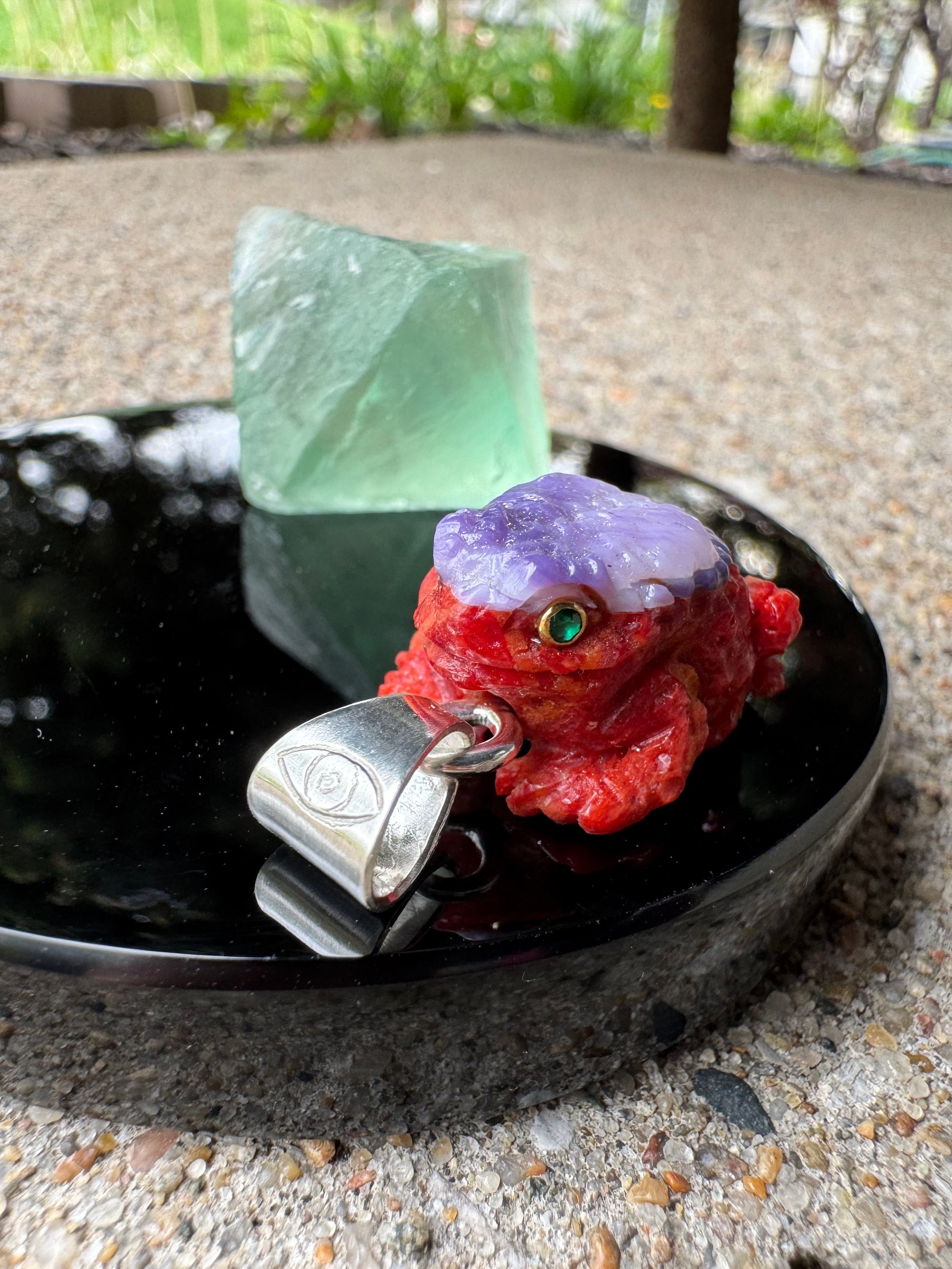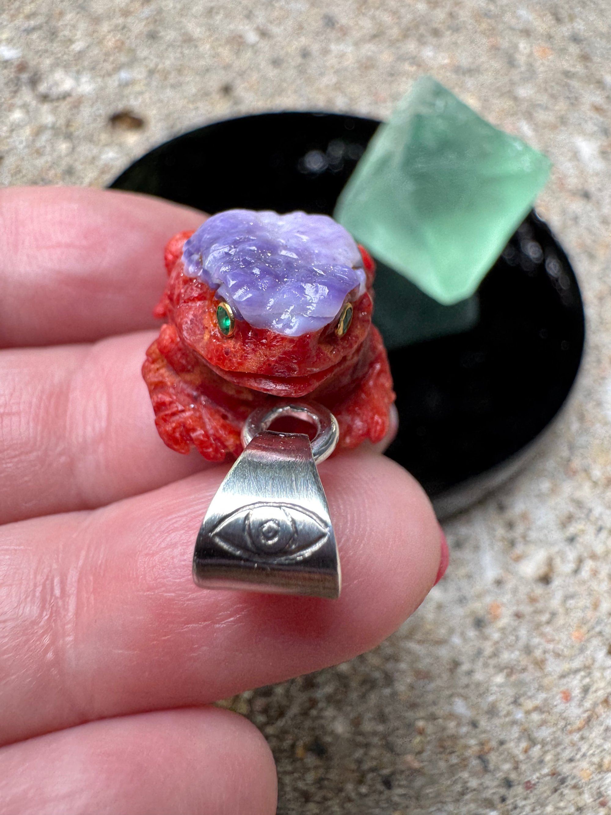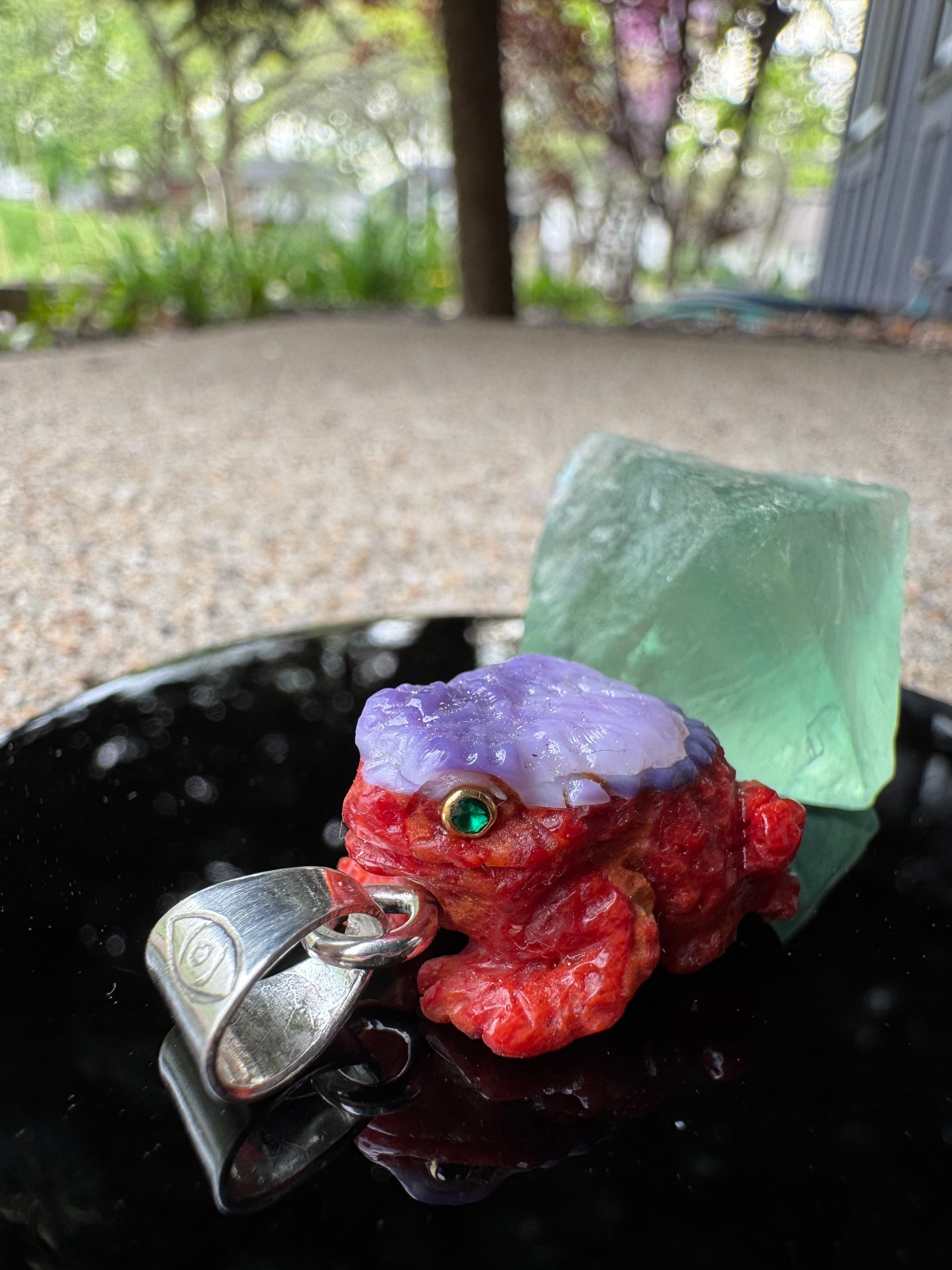 Coral and shell toad with emerald eyes. Argentium silver setting has carved eye detail. Measures approximately 1 1/16” x 13/16”