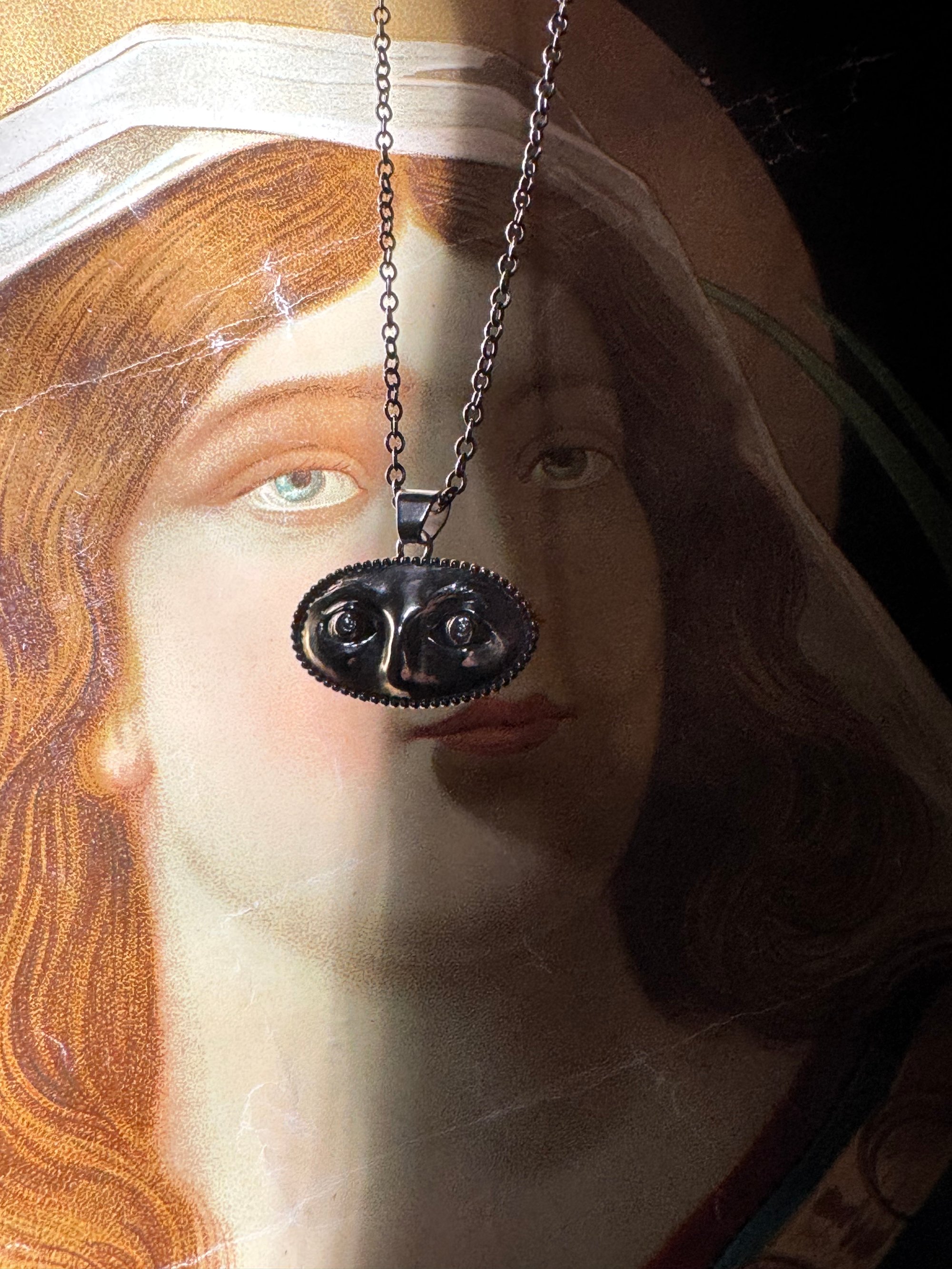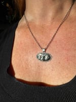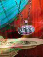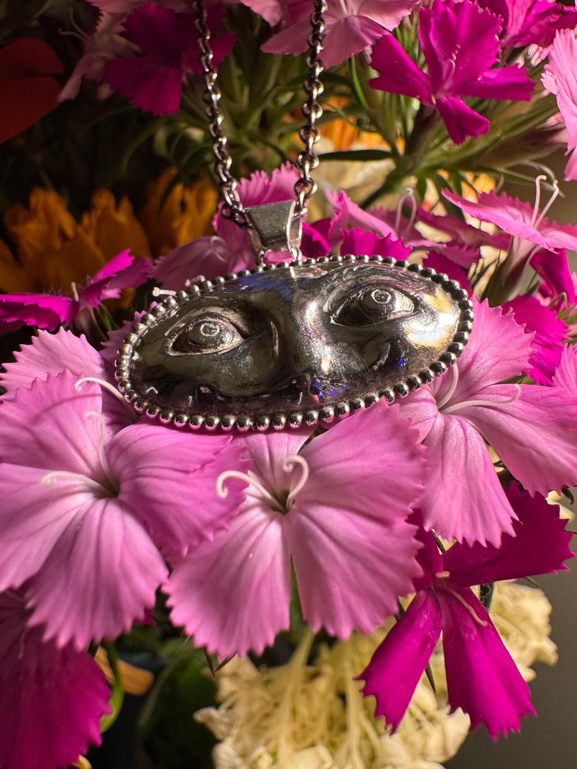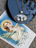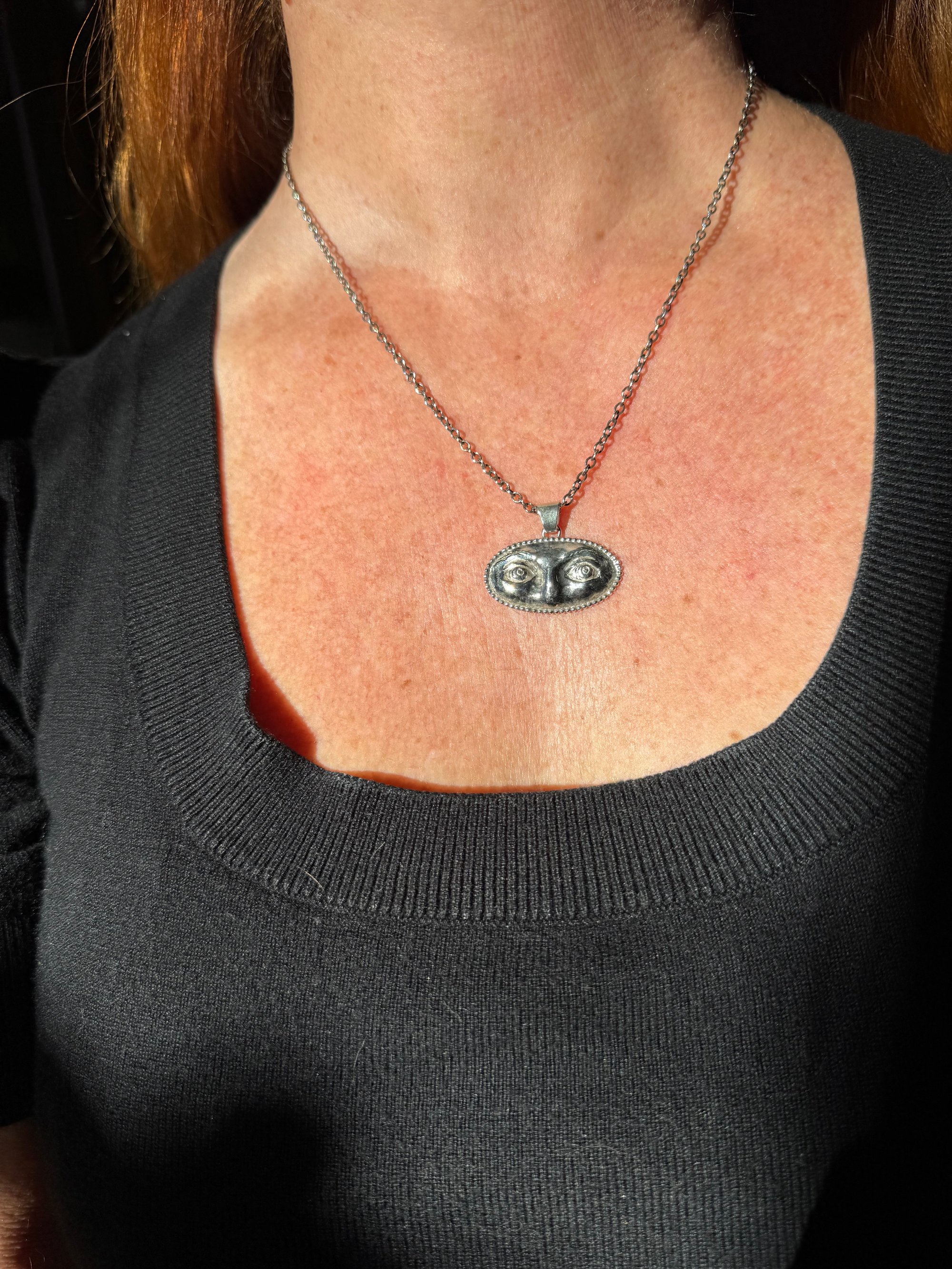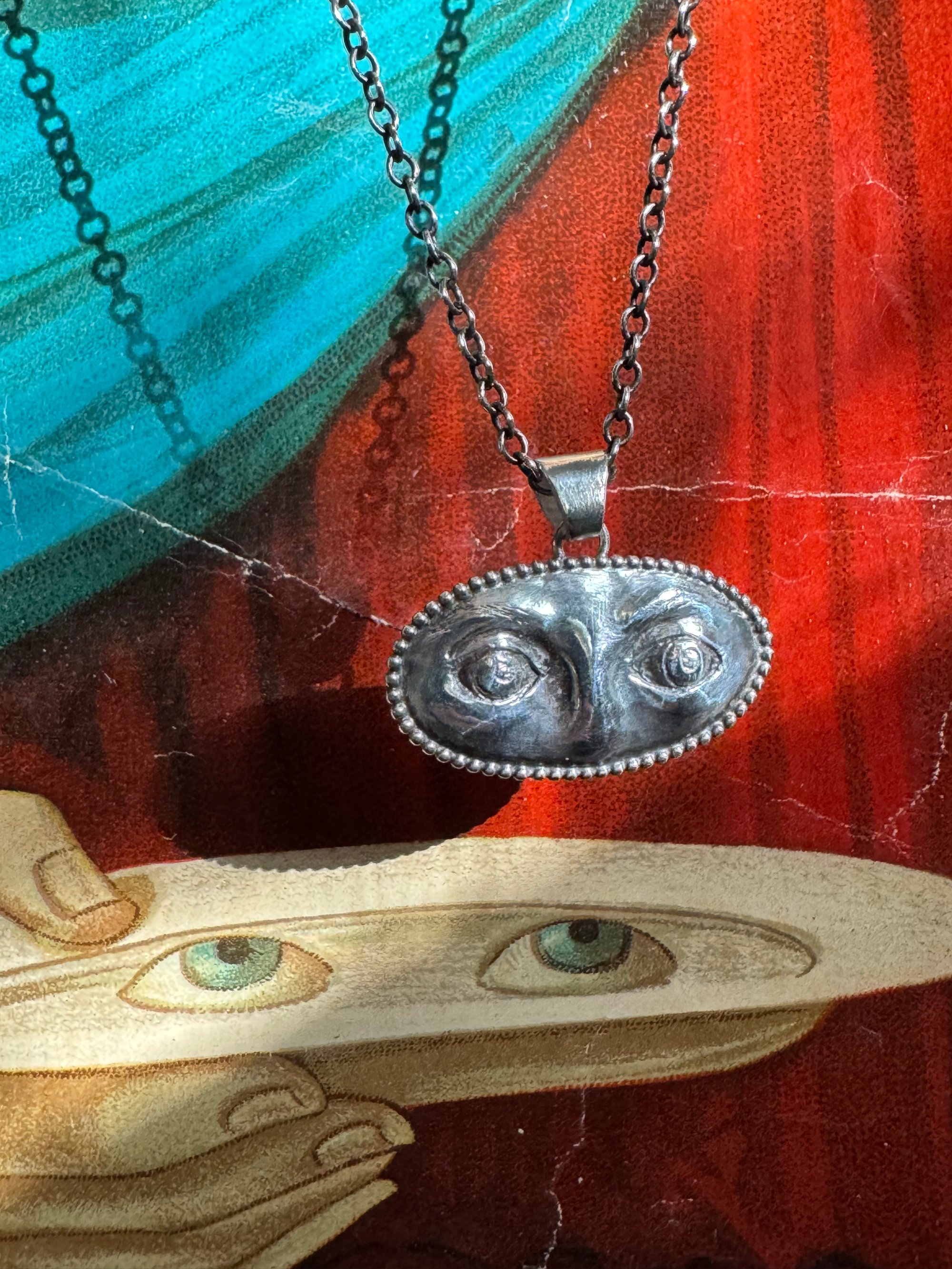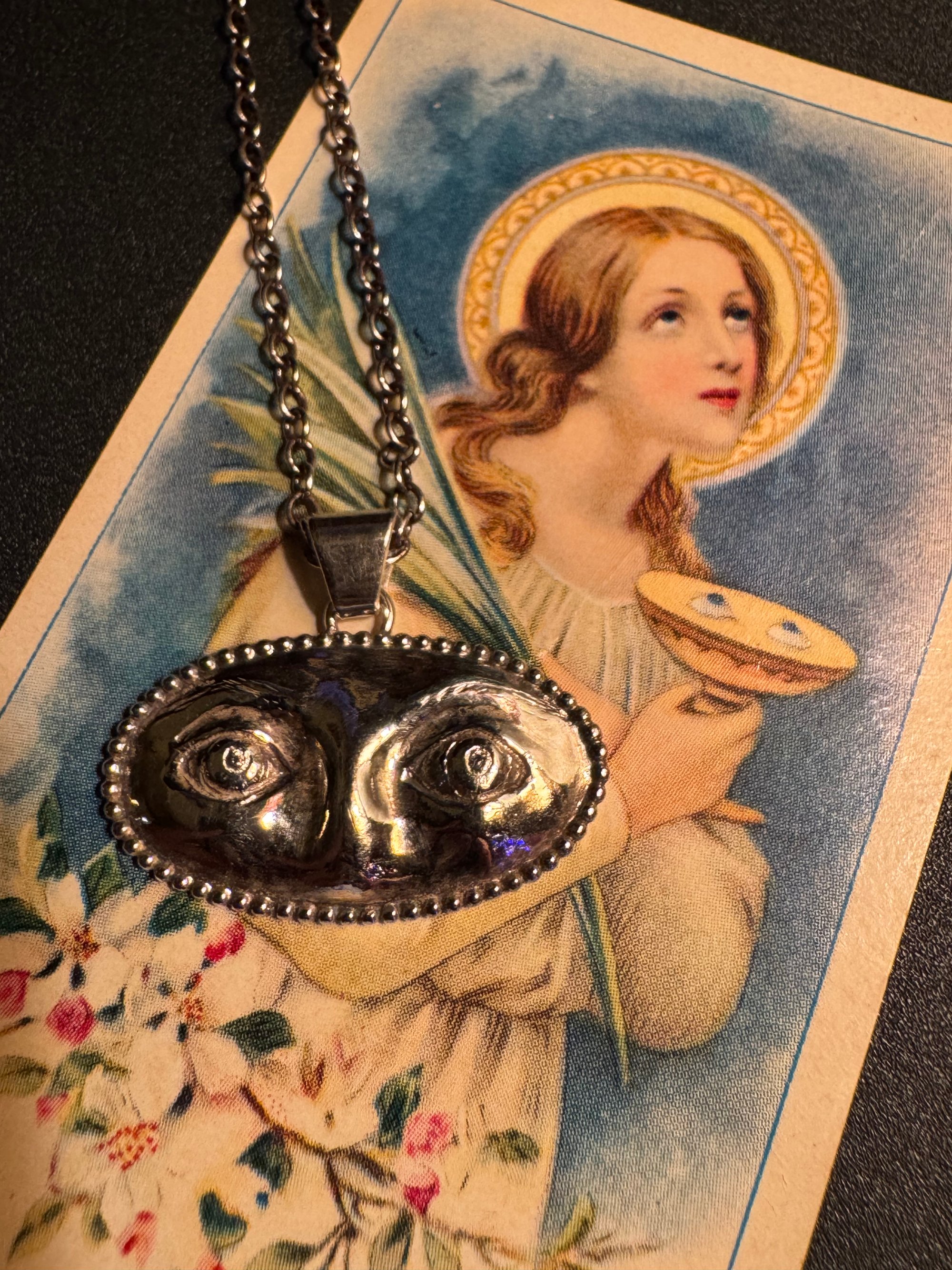 Fine silver and sterling silver Eyes of St. Lucia ex voto necklace. Hand fabricated using chasing and repousee. Modeled after a necklace I saw in Italy. Pendant measures 1 1/4” x 5/8” on 18” chain