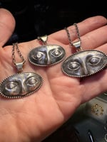 Fine silver and sterling silver Eyes of St. Lucia ex voto necklace. Hand fabricated using chasing and repousee . One of a kind. Pendant measures on 18” chain. Inspired by a necklace I saw in Italy.
