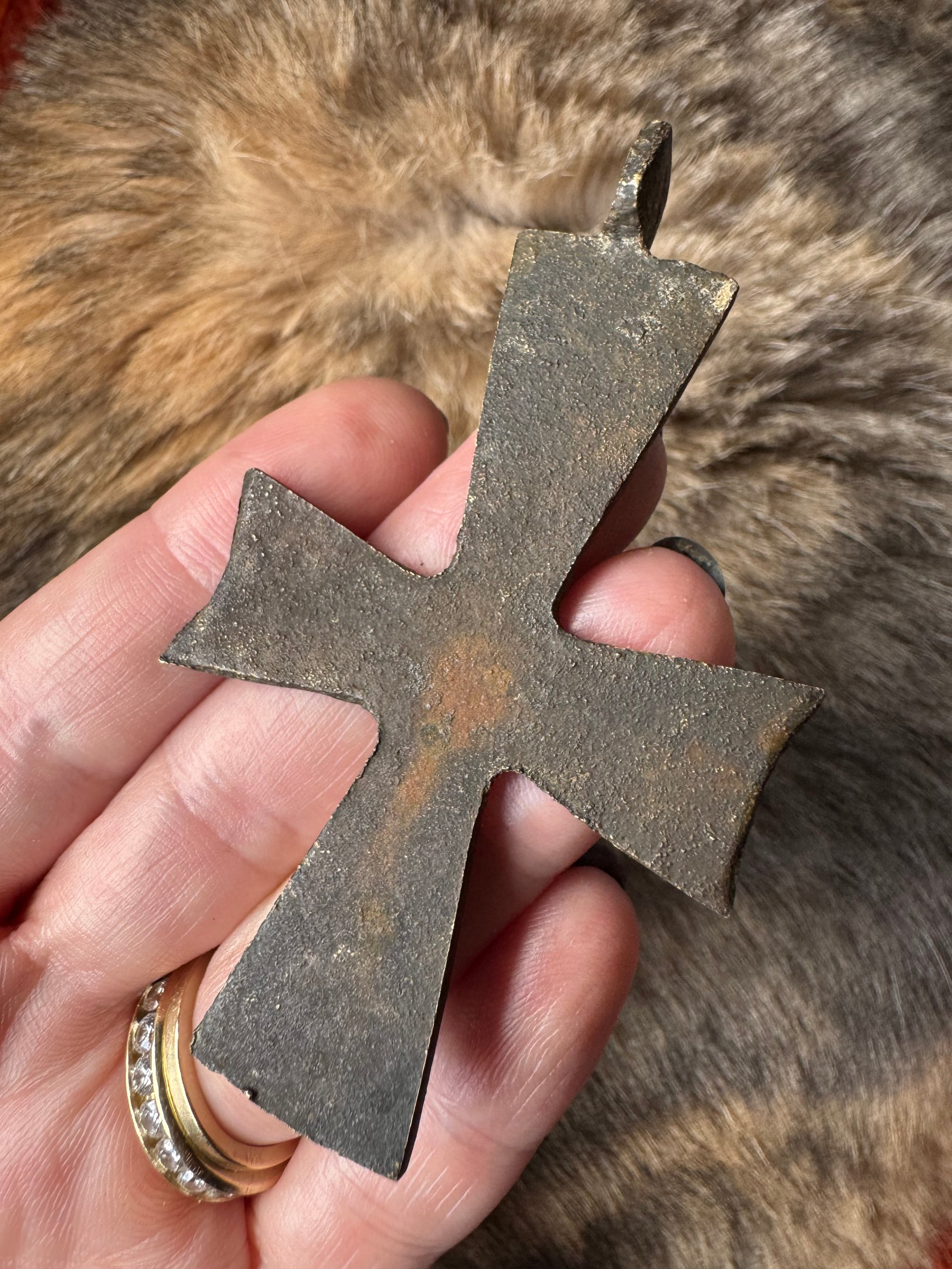 Fifth-sixth century AD (400s-500s) bronze cross. Christ wasn’t depicted on the cross until the twelfth century, before that, Christian crosses were decorated with circles. This is an example of the first Christian cross. Porchased from Chimera Antiques in Rome