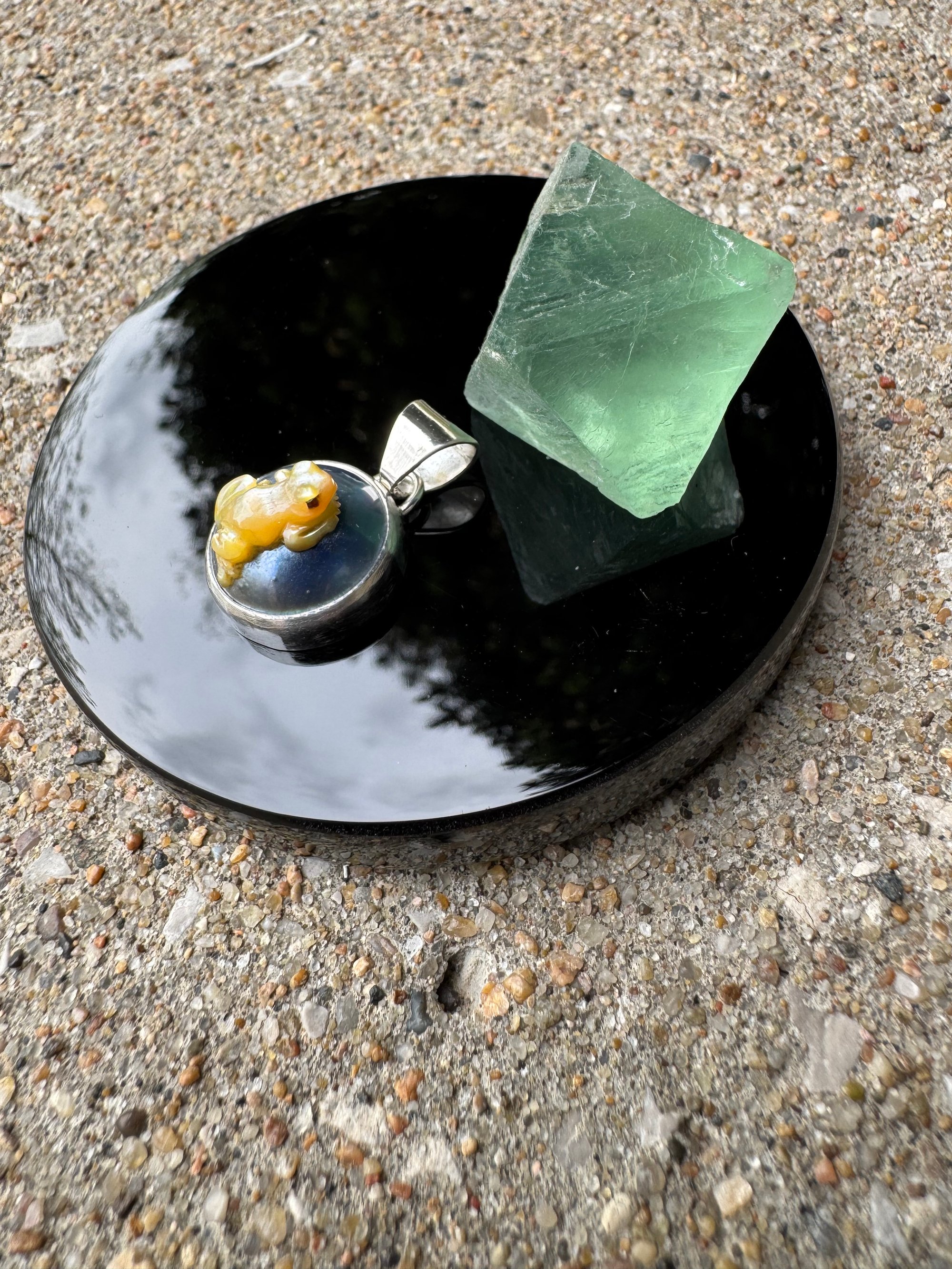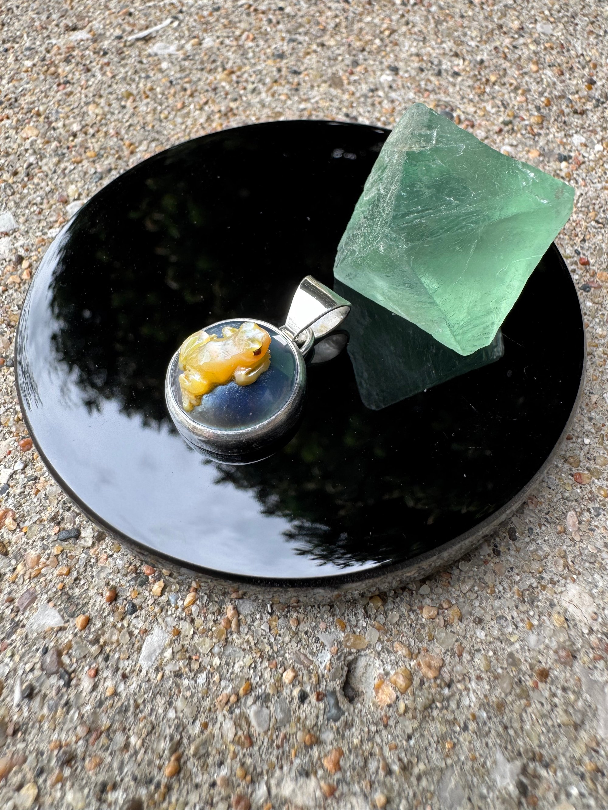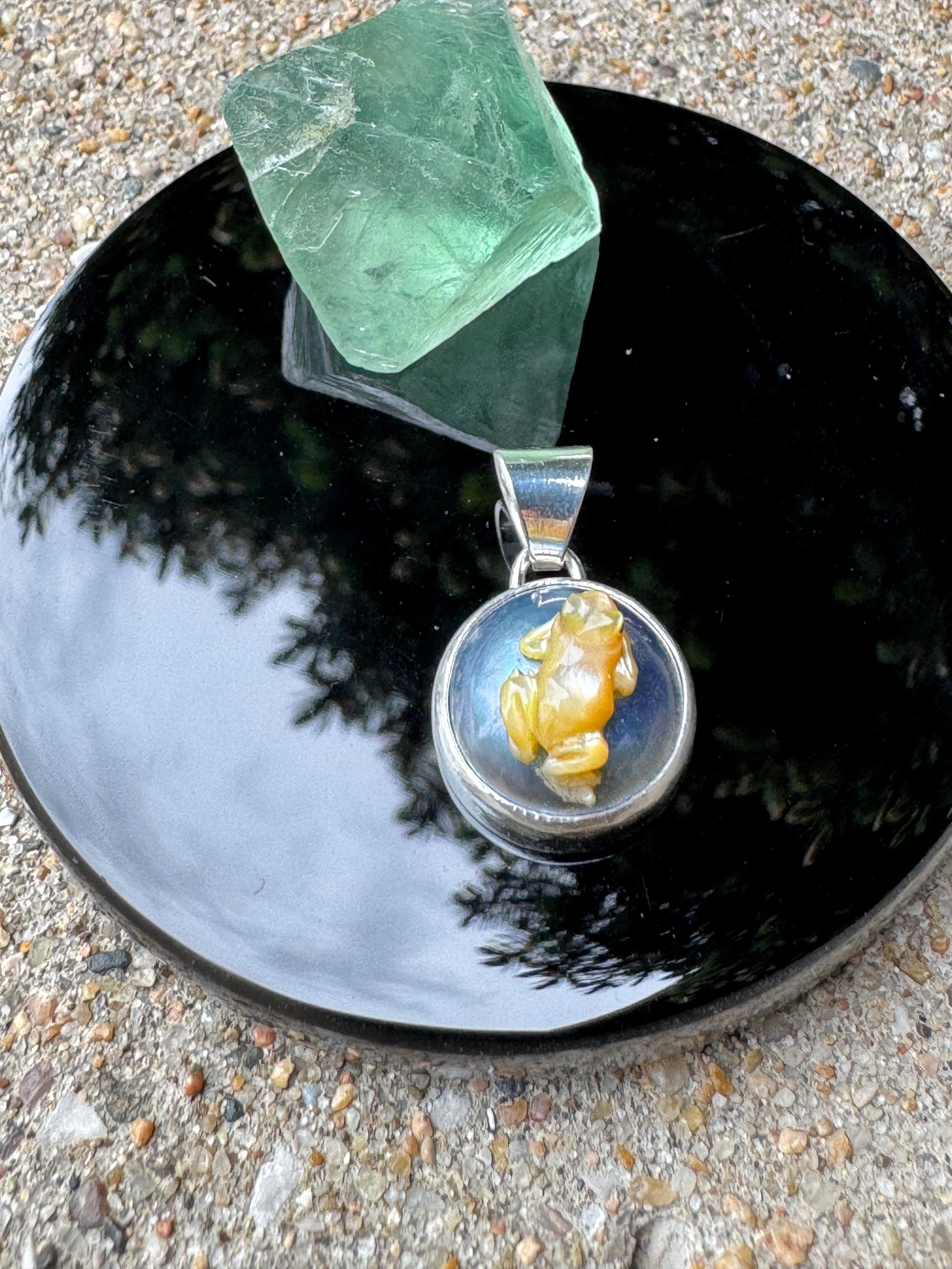 Single charm featuring mother of pearl frog on mabe pearl, set in Argentium silver.