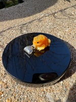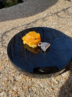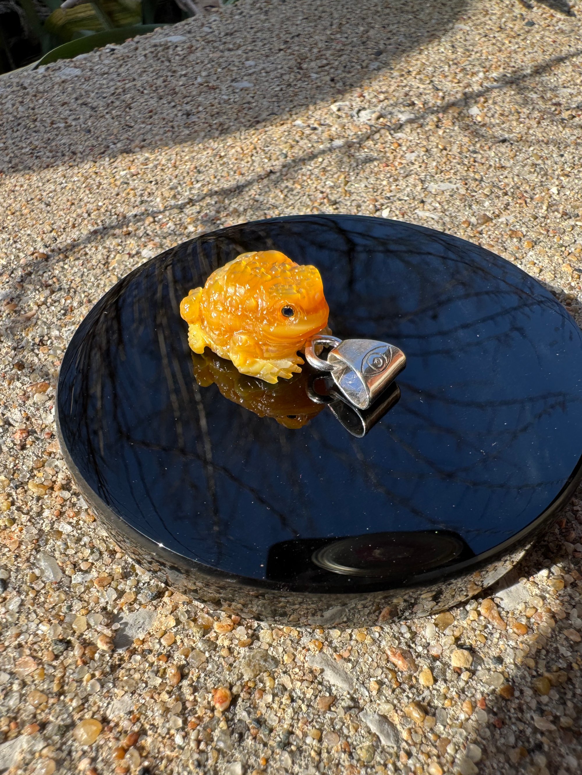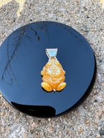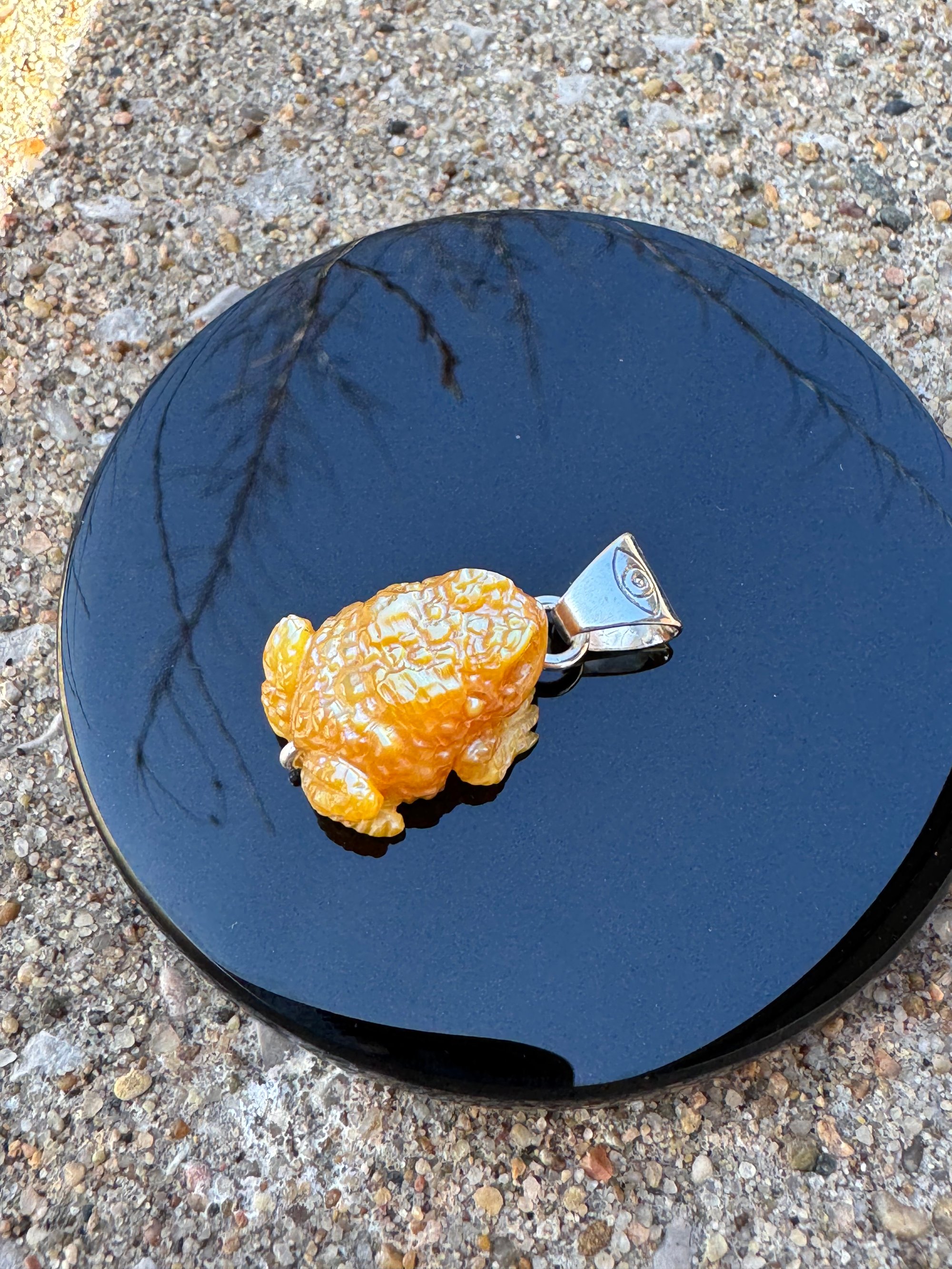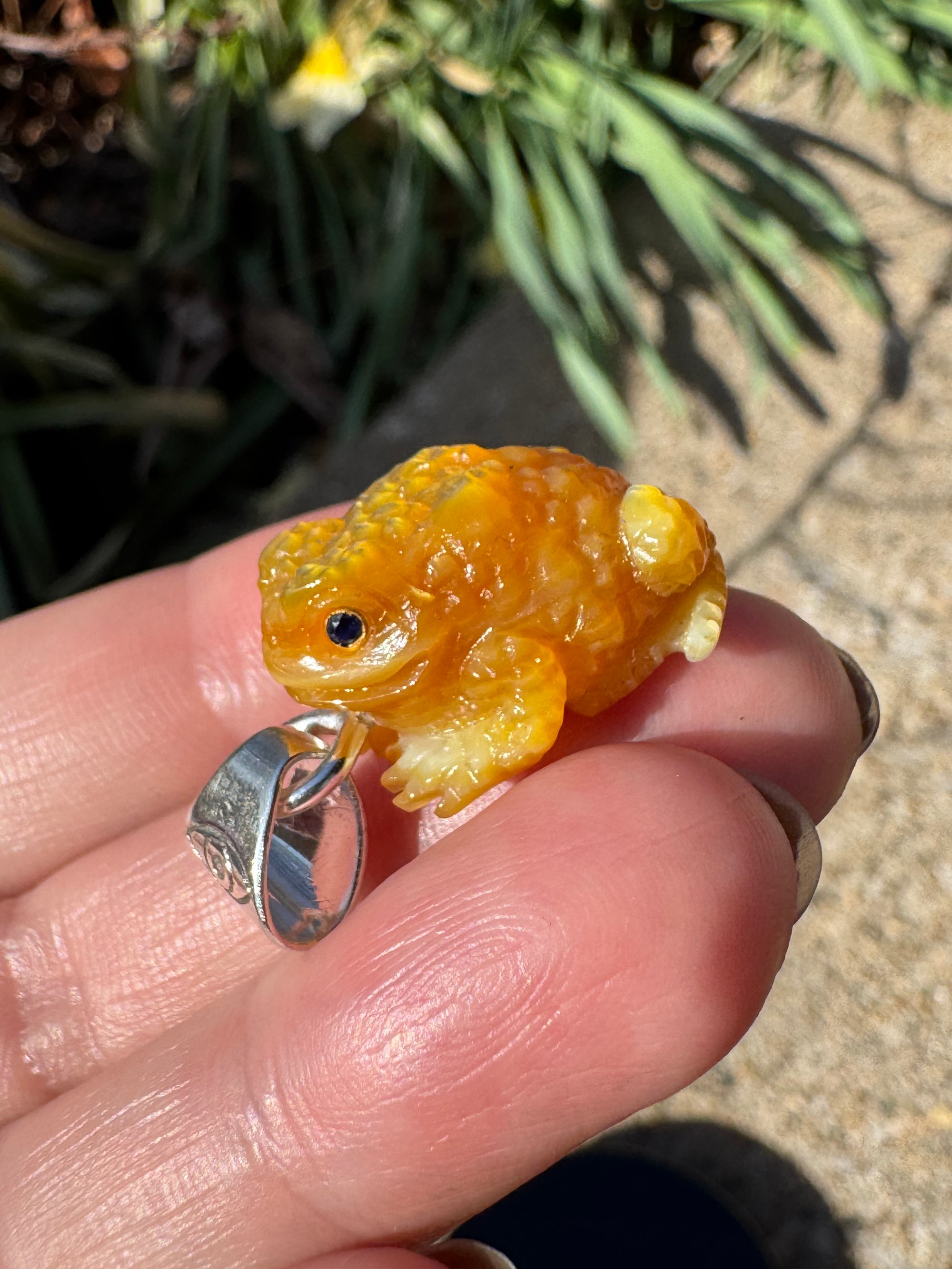 Gold mother of pearl toad charm with sapphire eyes. Set in Argentium silver. Measures approximately 1 1/4” x 3/4”