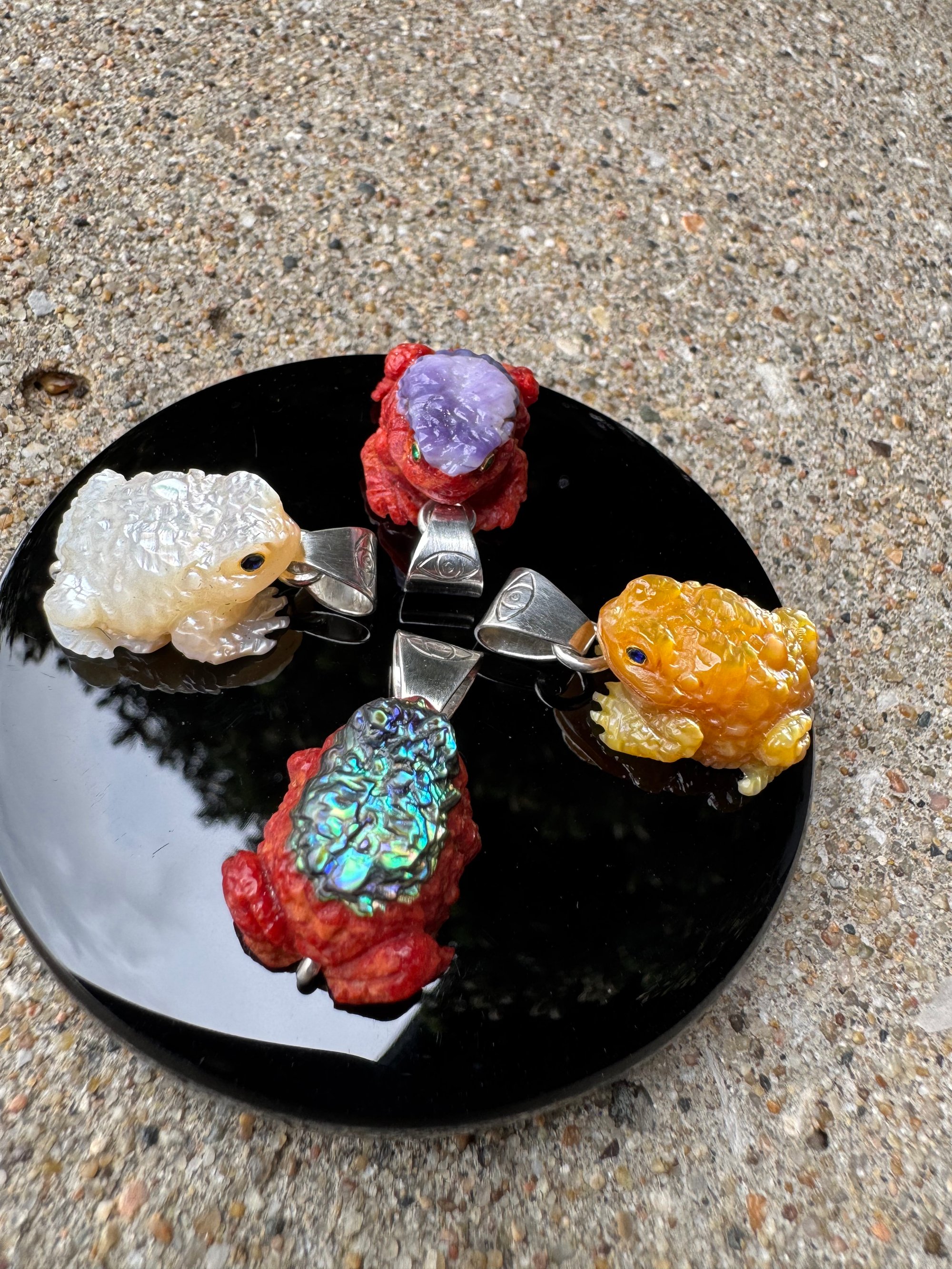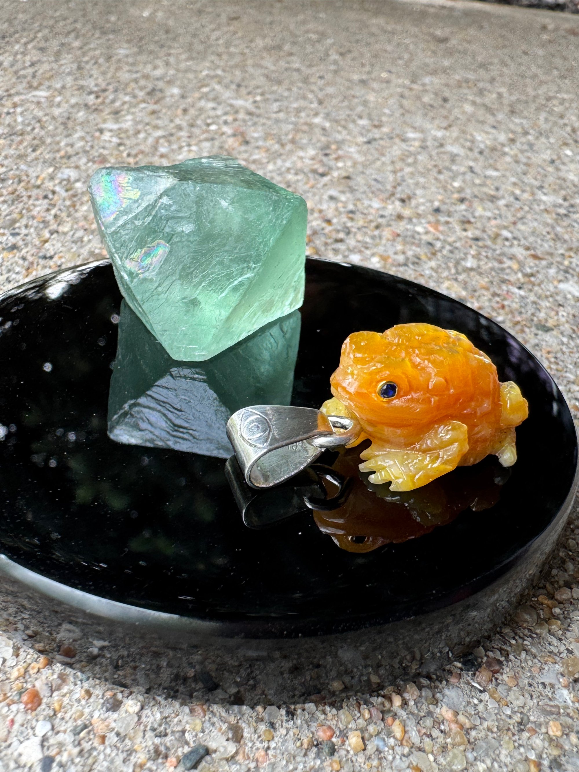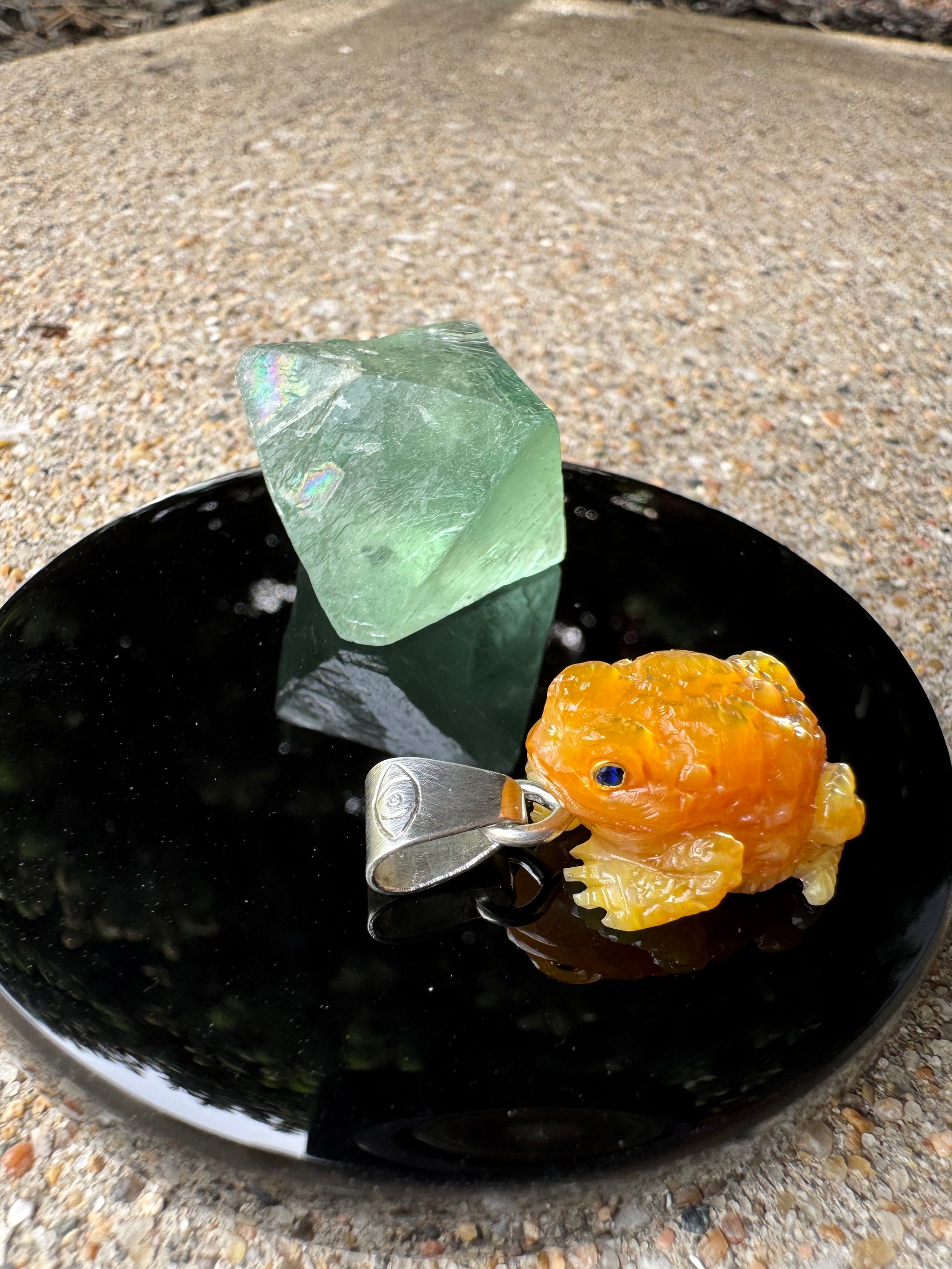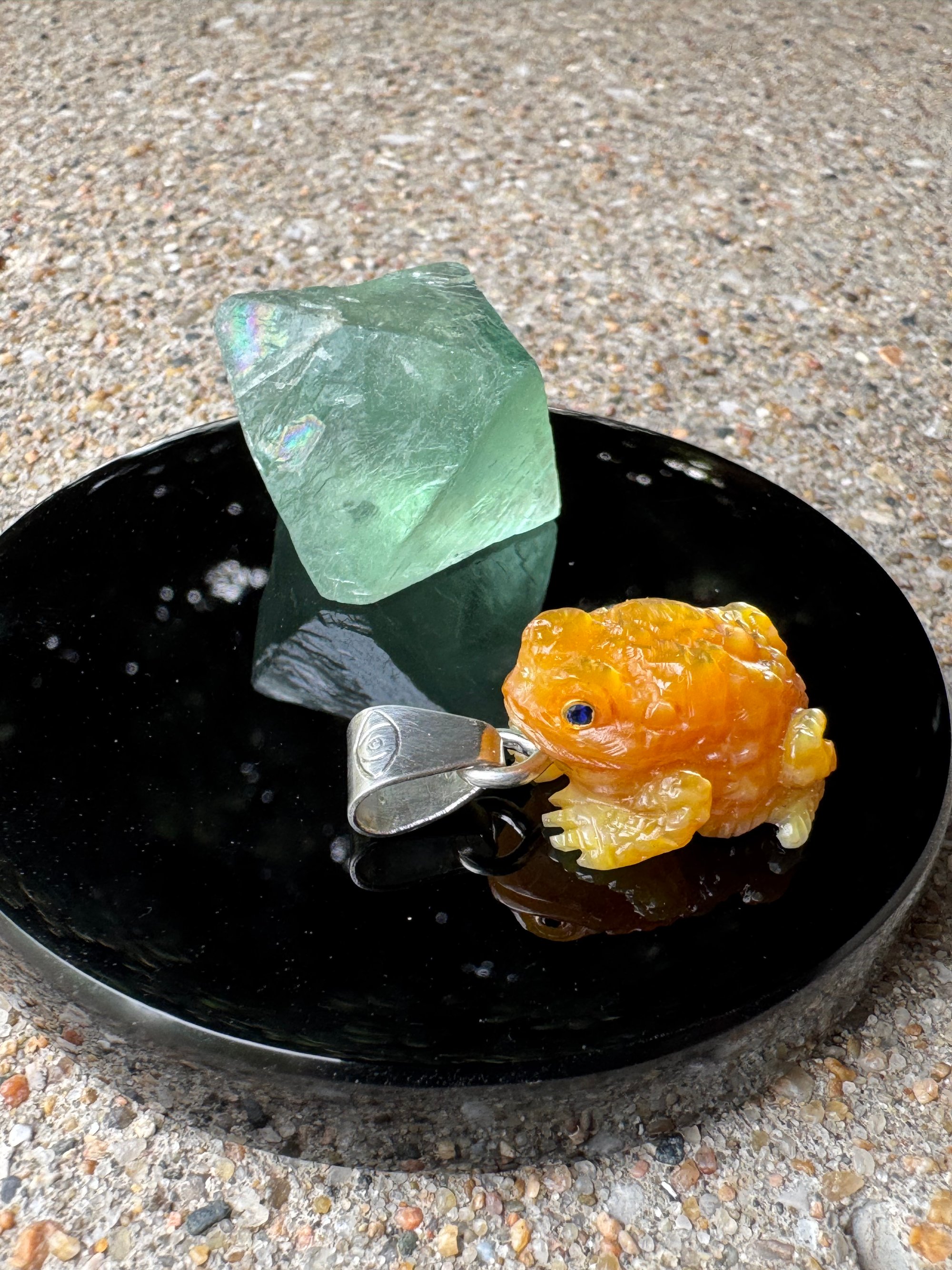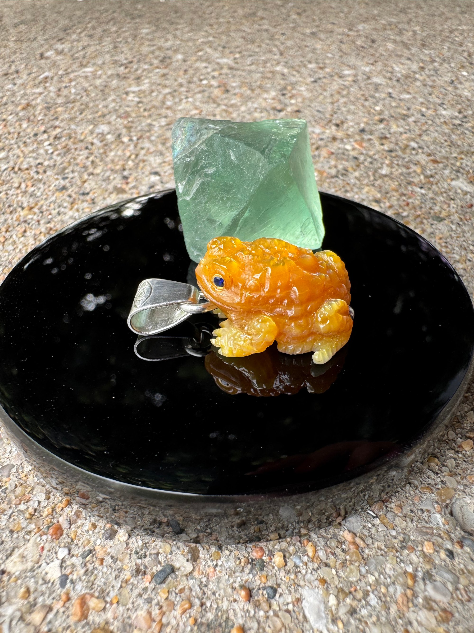 Gold mother of pearl toad with sapphire eyes, Argentium silver setting with carved eye detail.