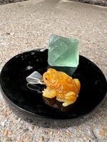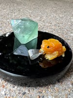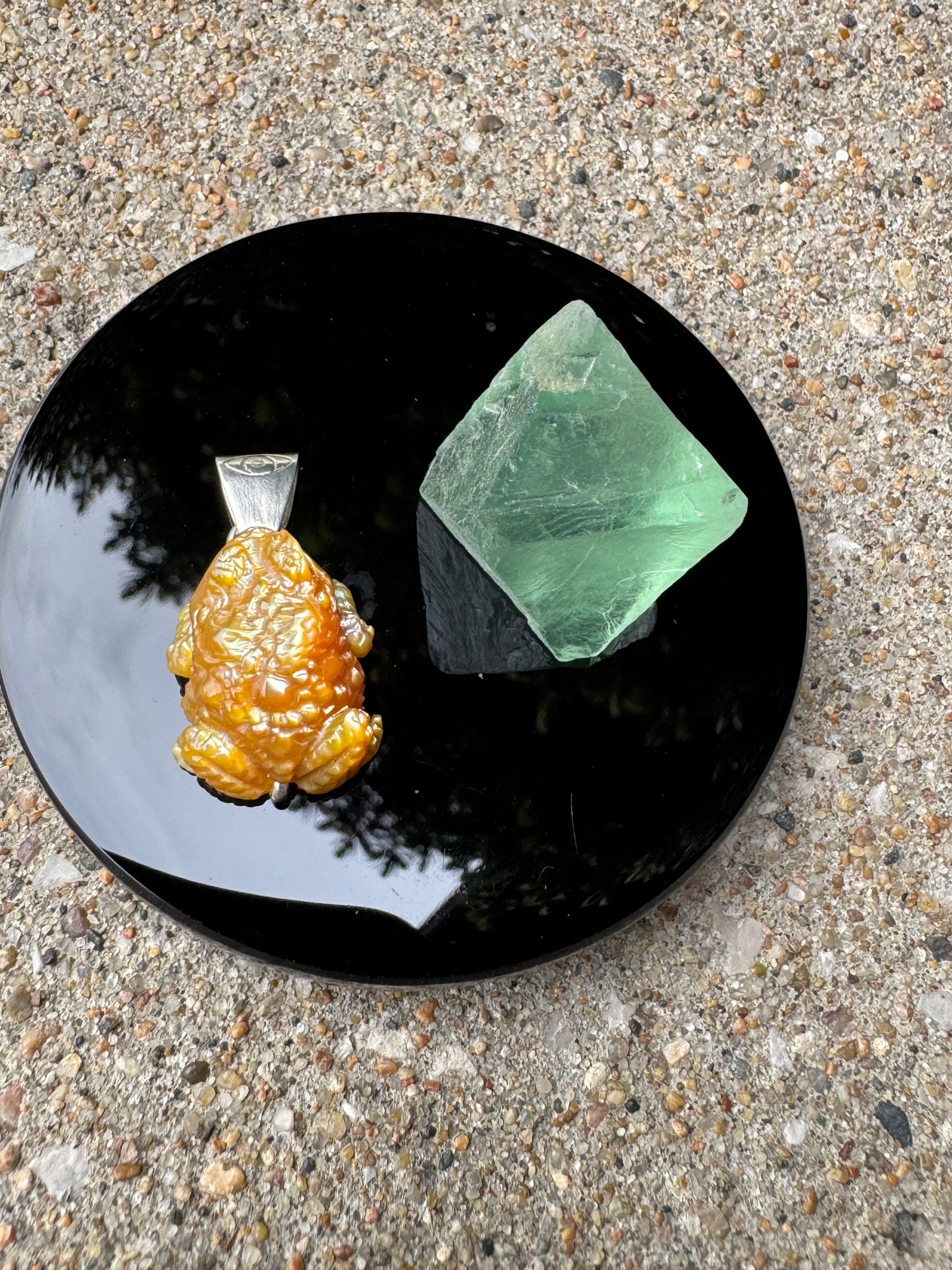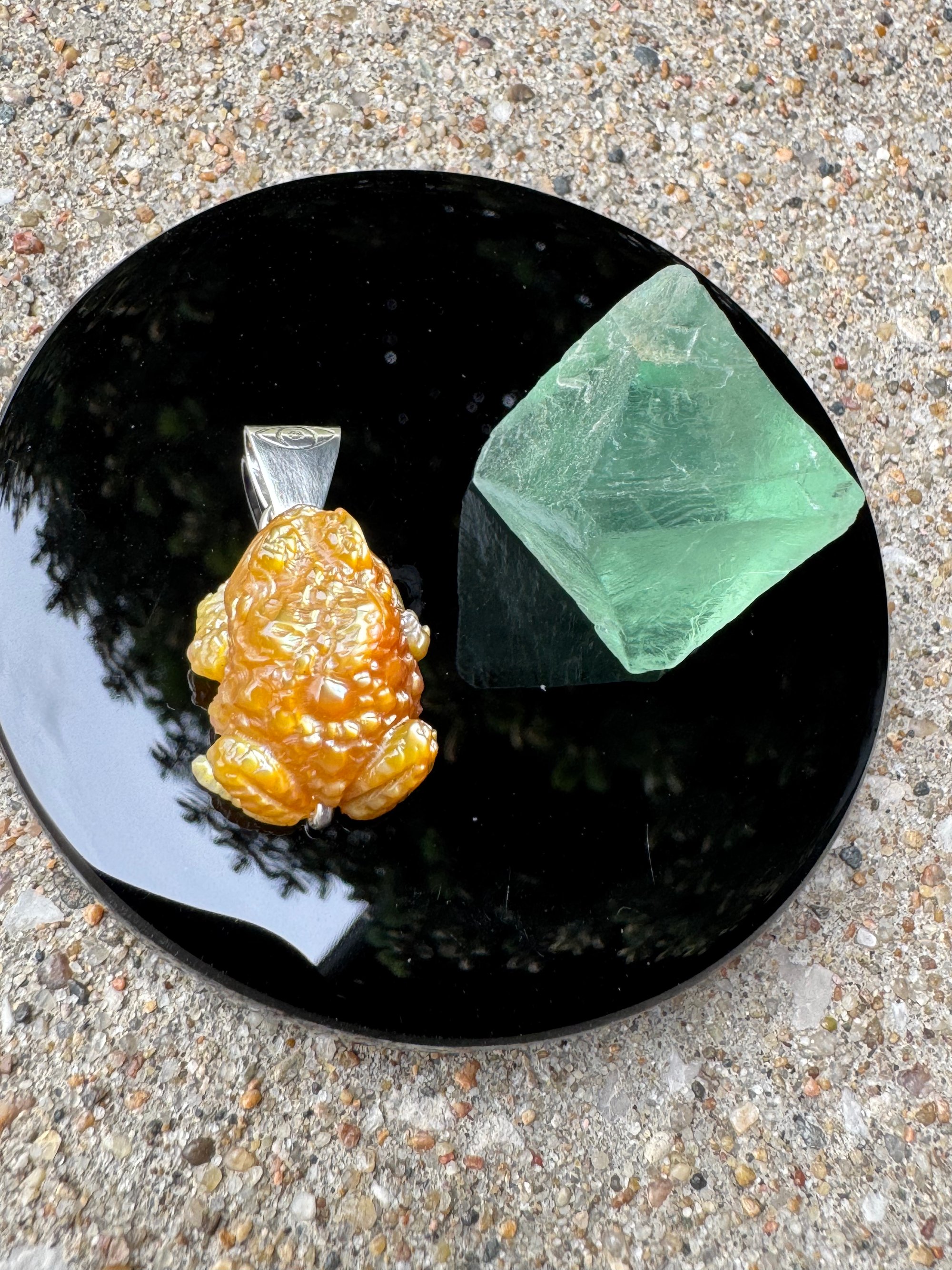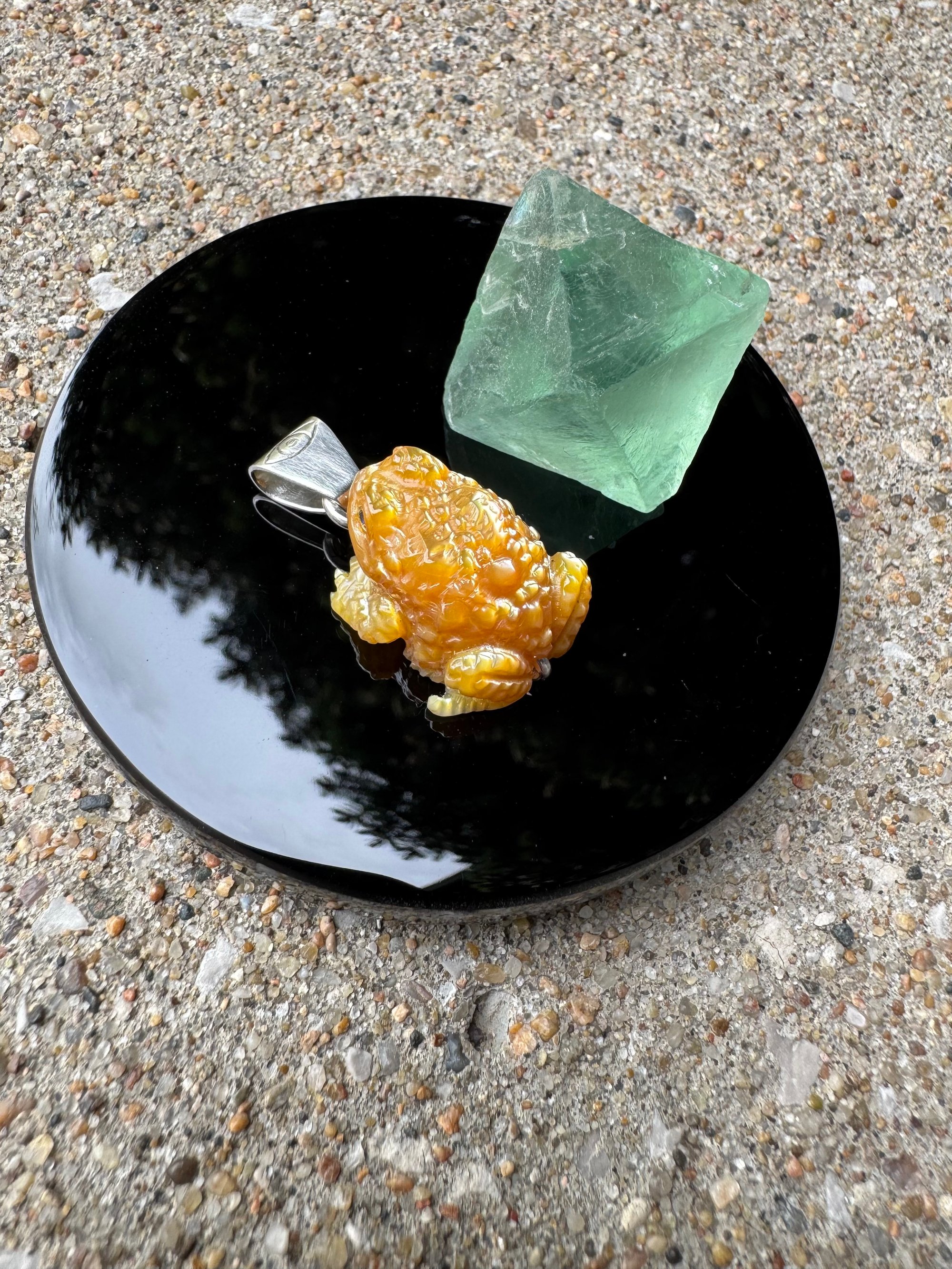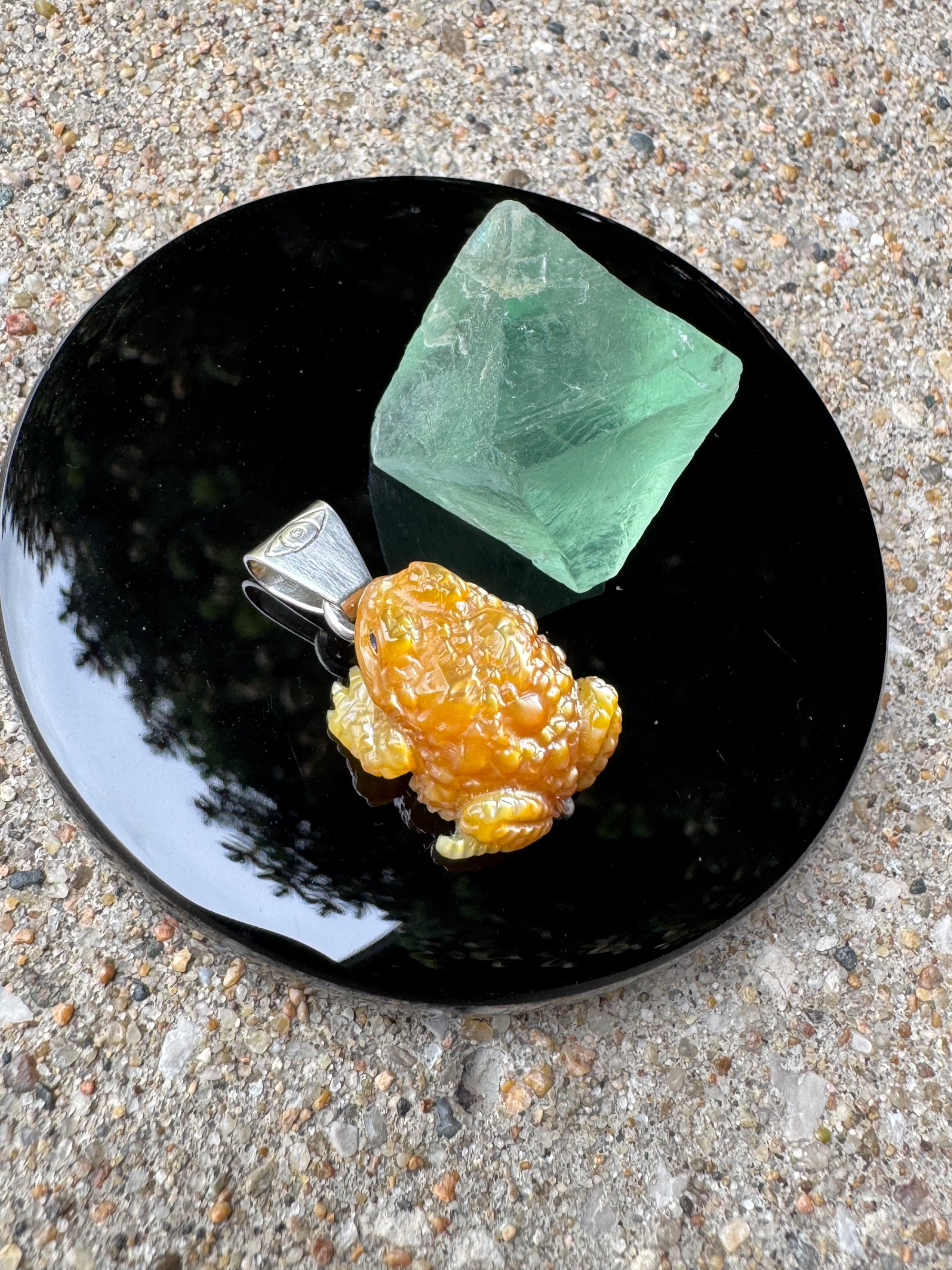 Gold mother of pearl toad with sapphire eyes, Argentium silver setting with carved eye detail.