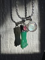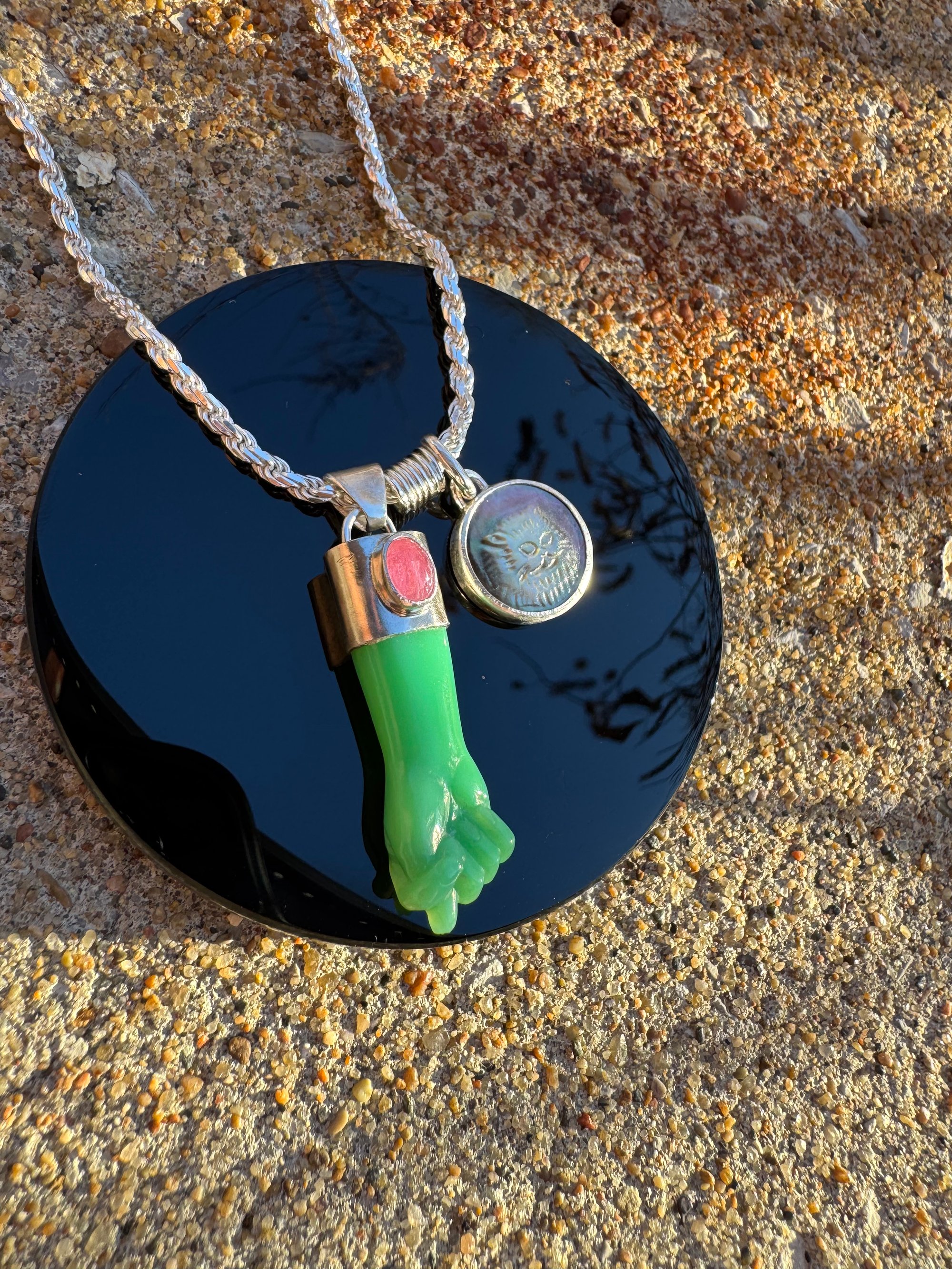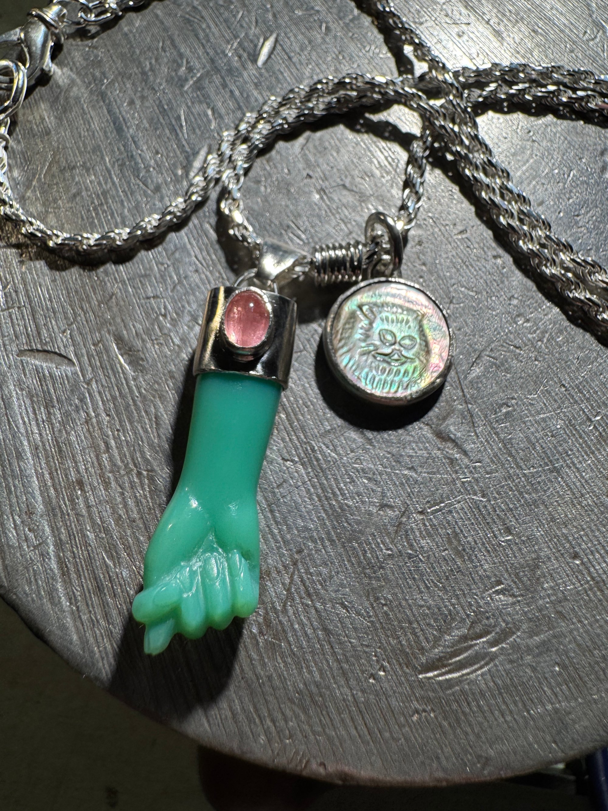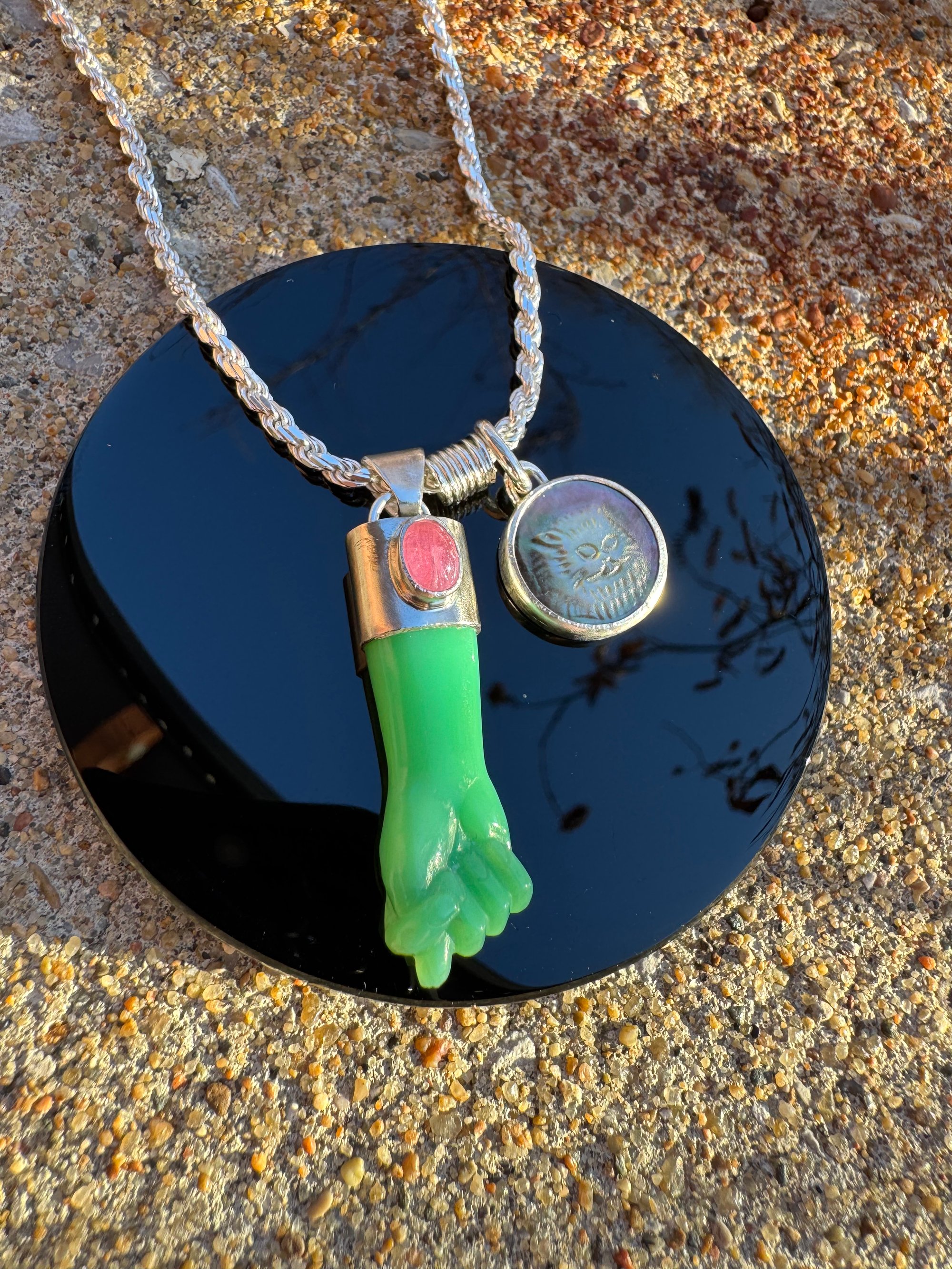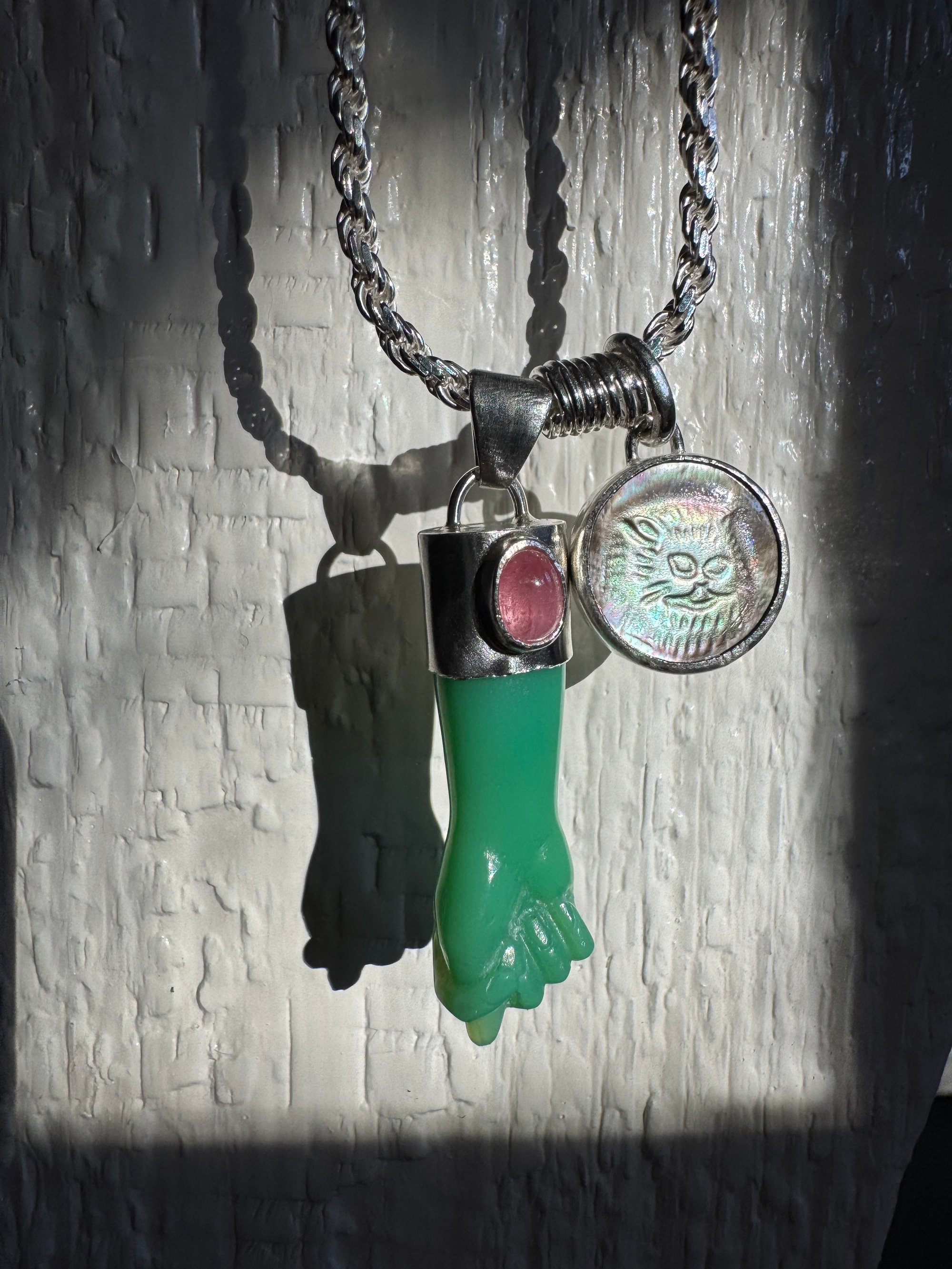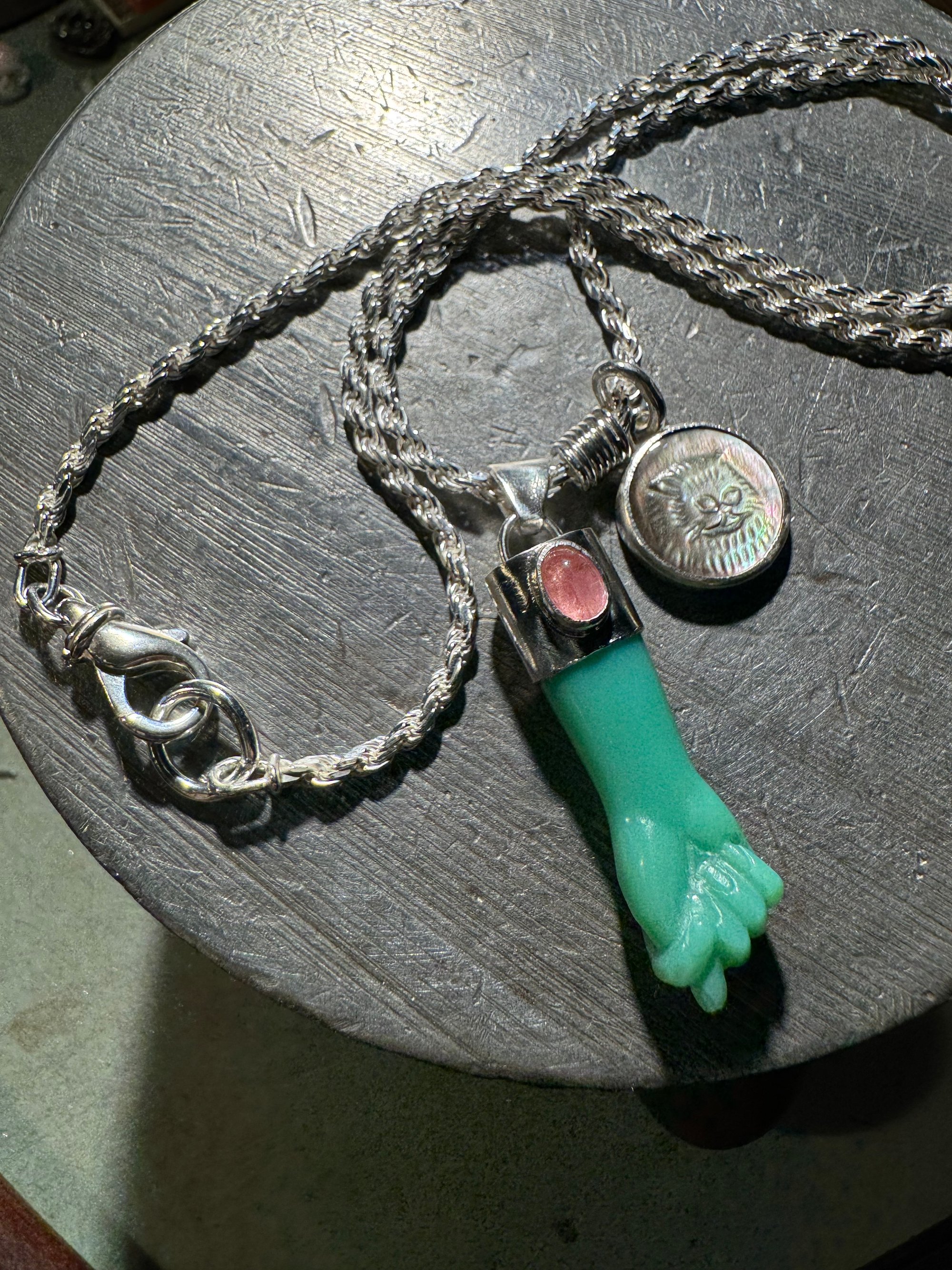 Chrysoprase mano figa with tourmaline accent and mother of pearl cat cameo. Set in argentium and sterling silver on 21” French cut sterling rope chain with sterling lobster clasp. One of a kind. Mano figa symbolism dates back over 2500 years and is used for protection and to ward off evil. The coil symbolizes transformation. Cats are known for their cleverness, mystery, magic and independence. This little derpy cat face gives me life, and anything that brings a smile is needed these days. Together these things combine to form a talisman to carry through the ages. Xx