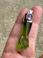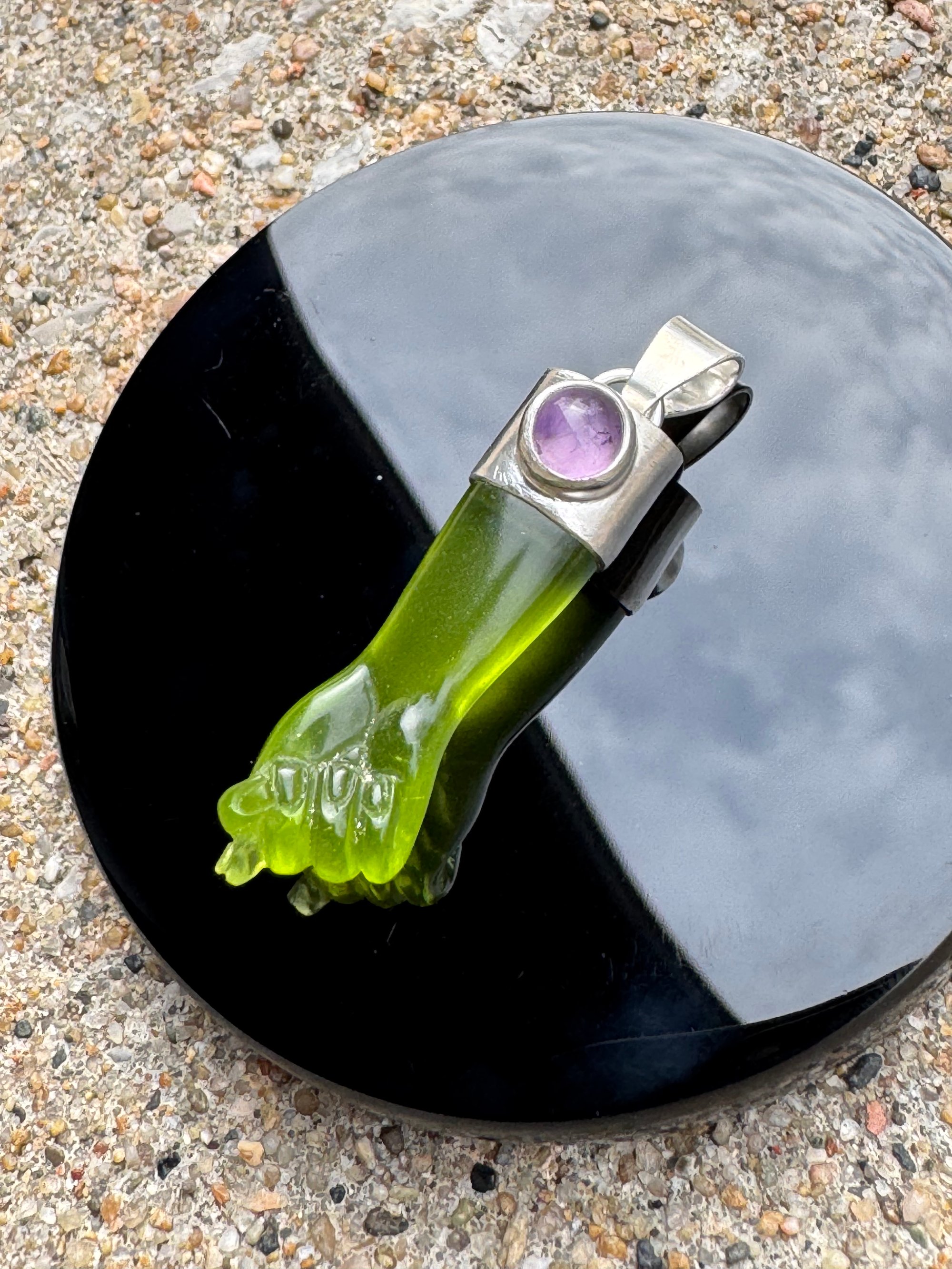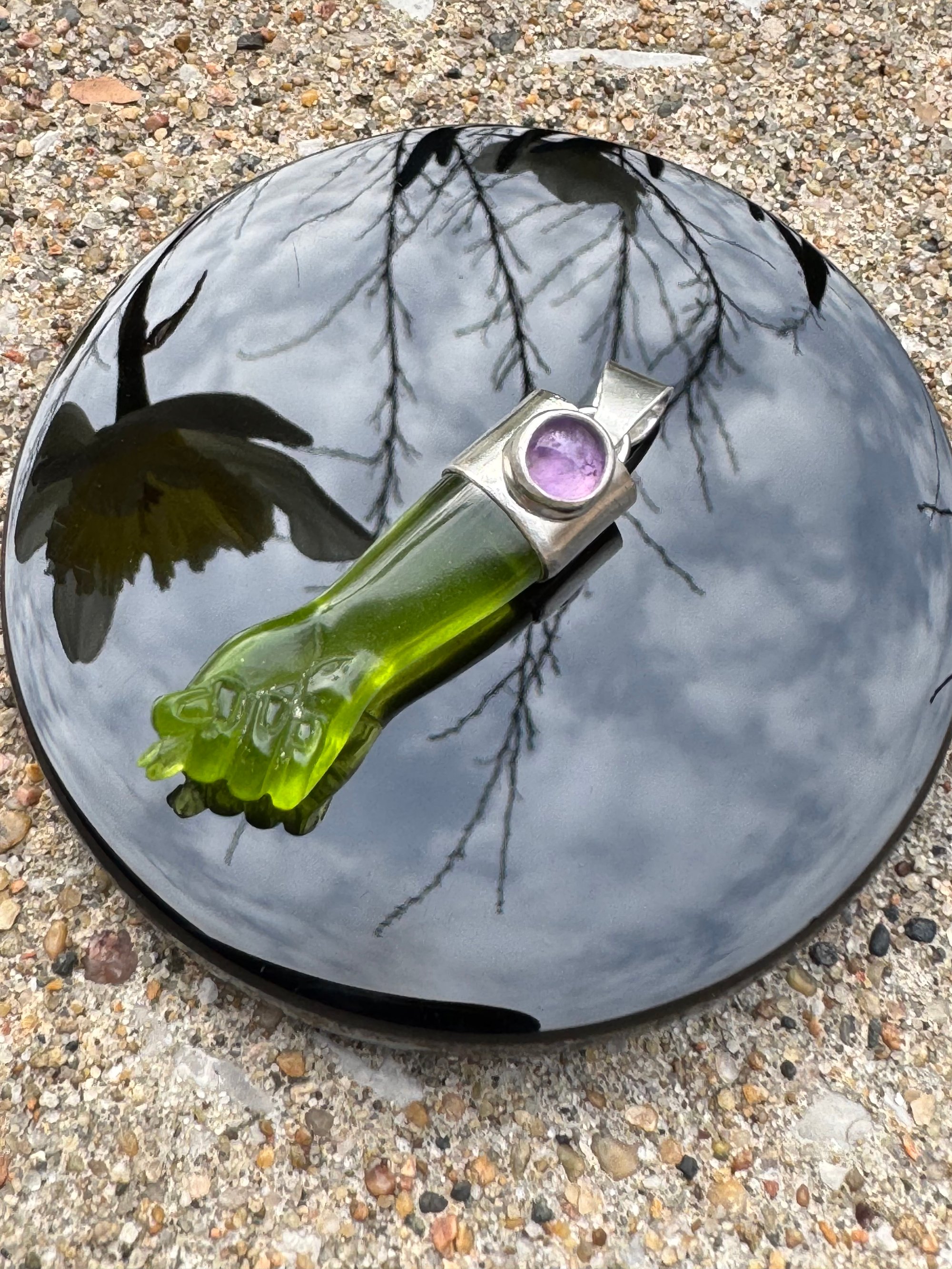 Green chalcedony mano figa with amethyst accent, set in argentium silver. Measured approximately 1 7/8” x 1/2”