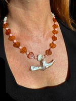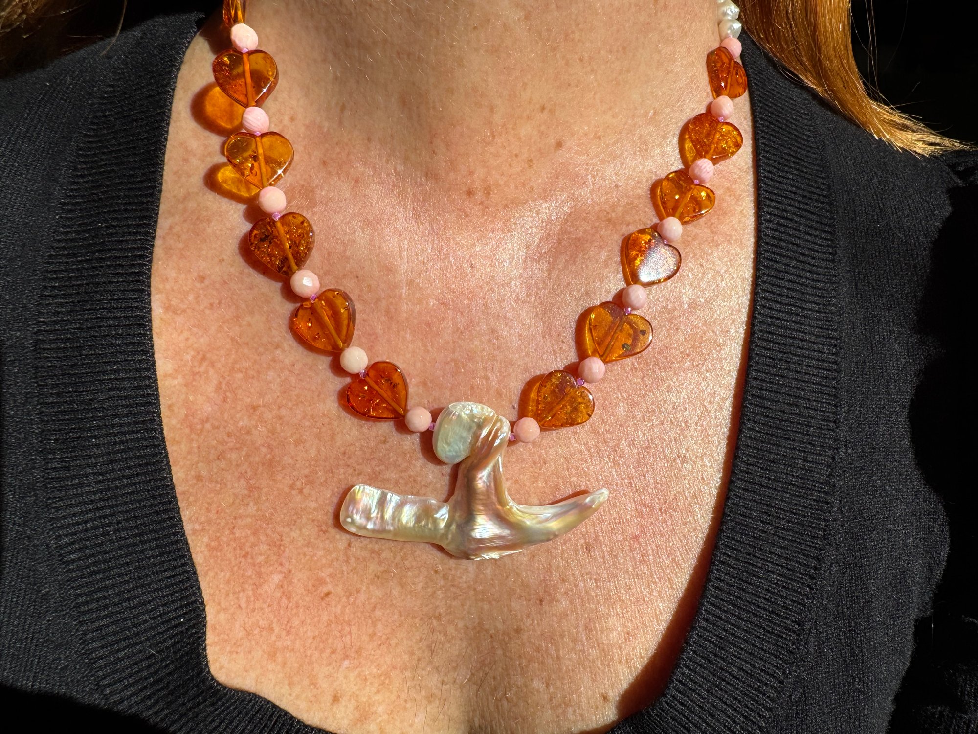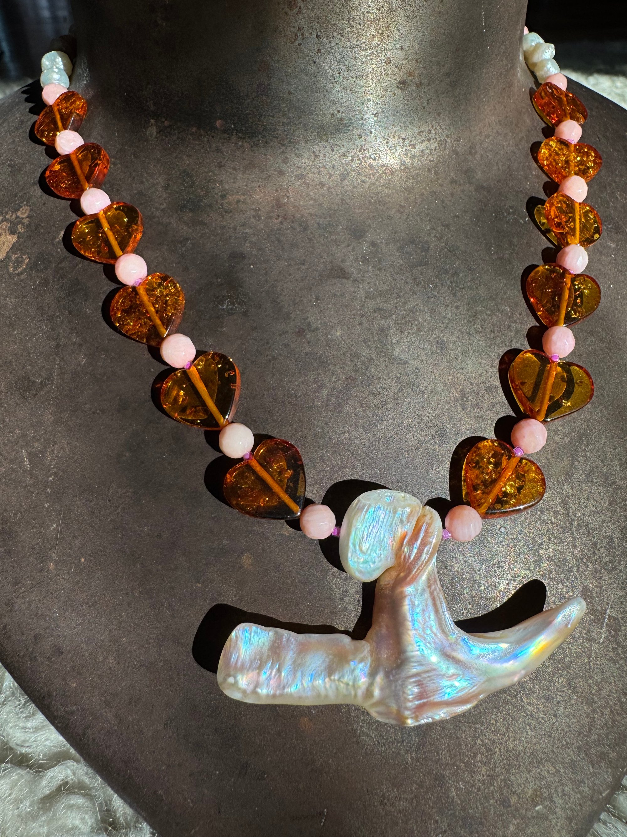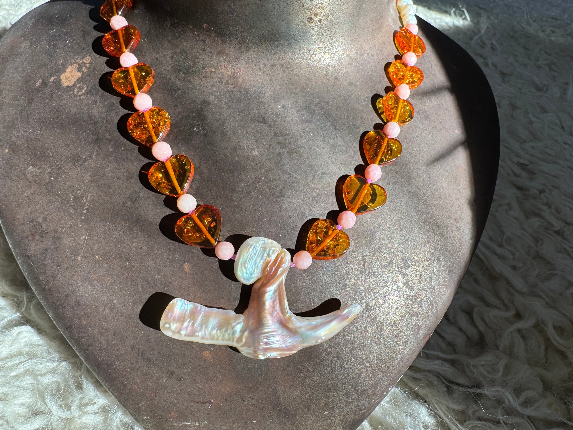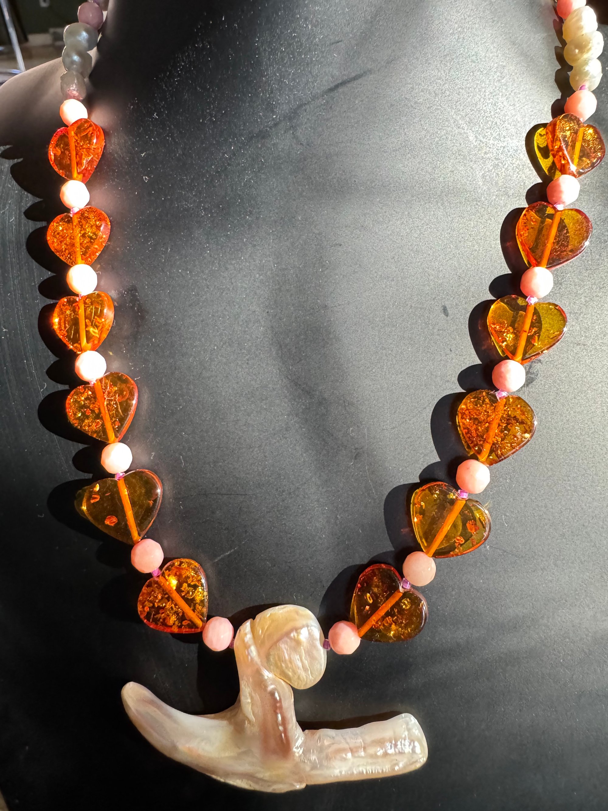 Pearl, Amber, coral, glass, sterling silver. Adjustable length 18”-20”