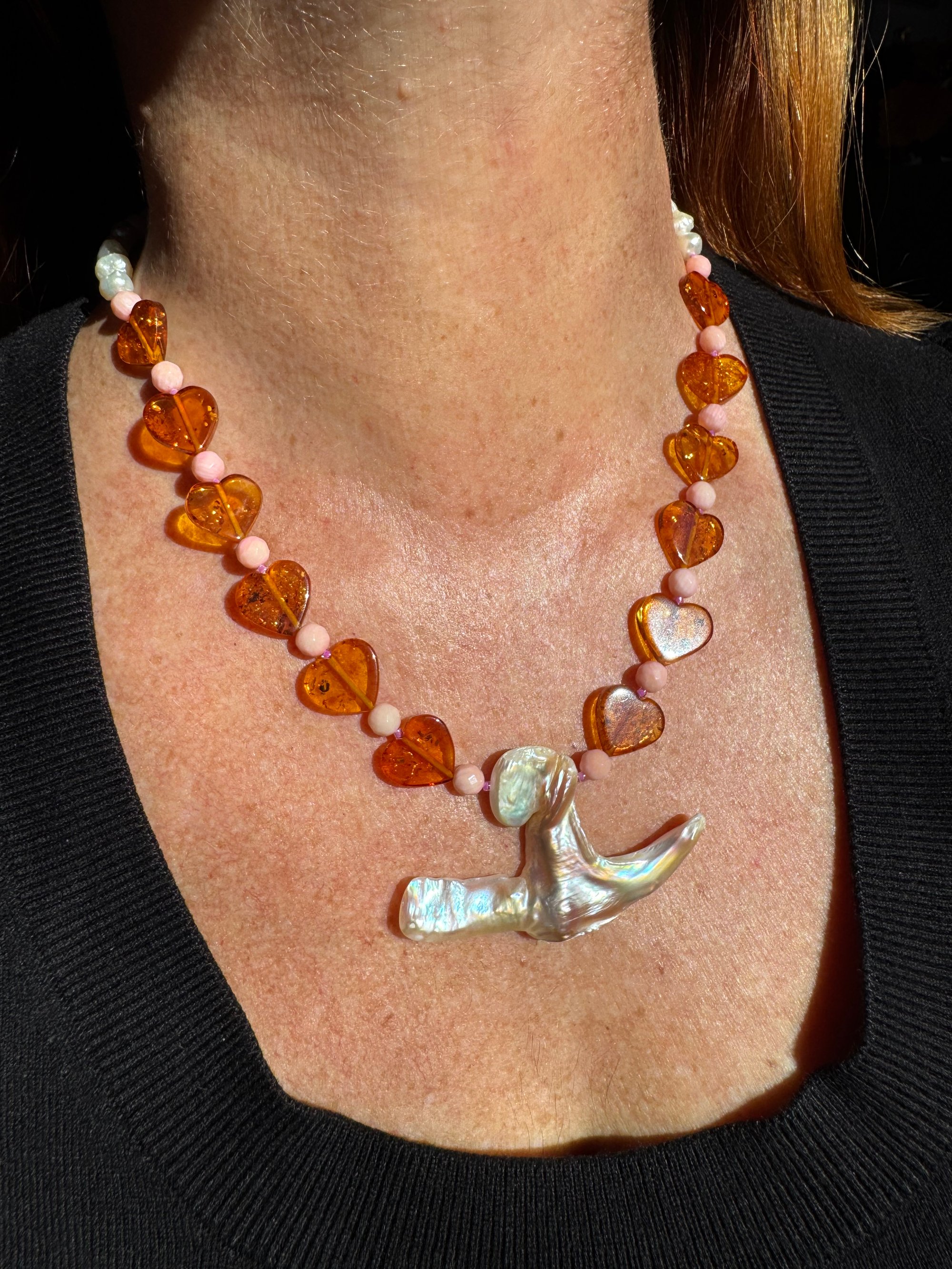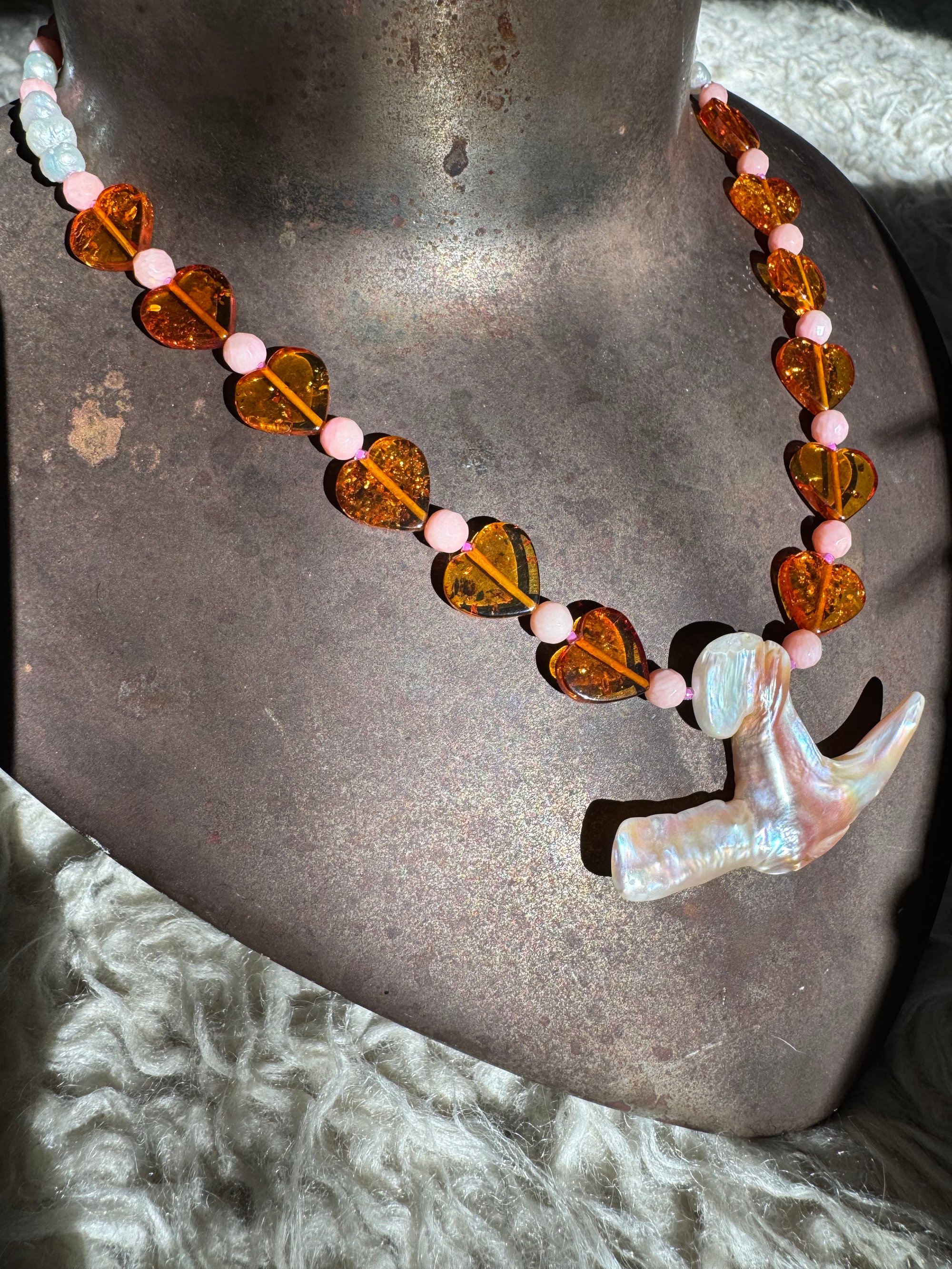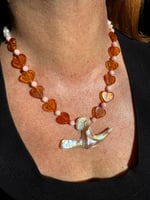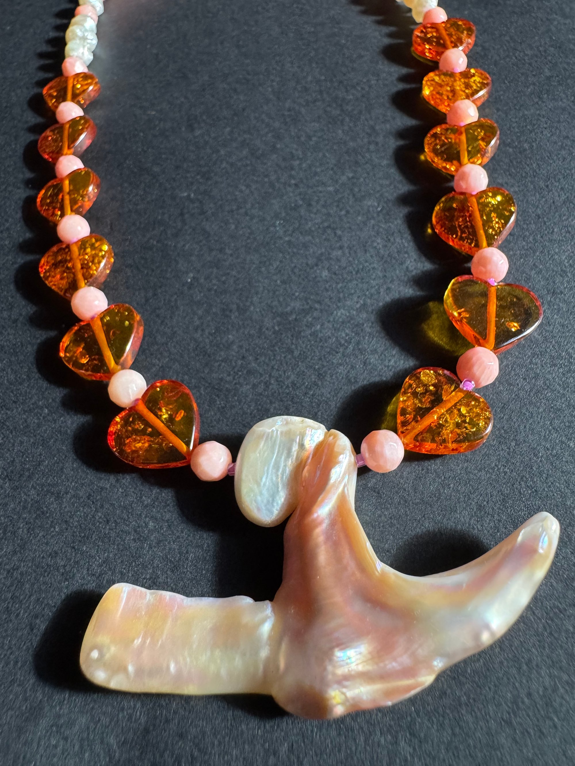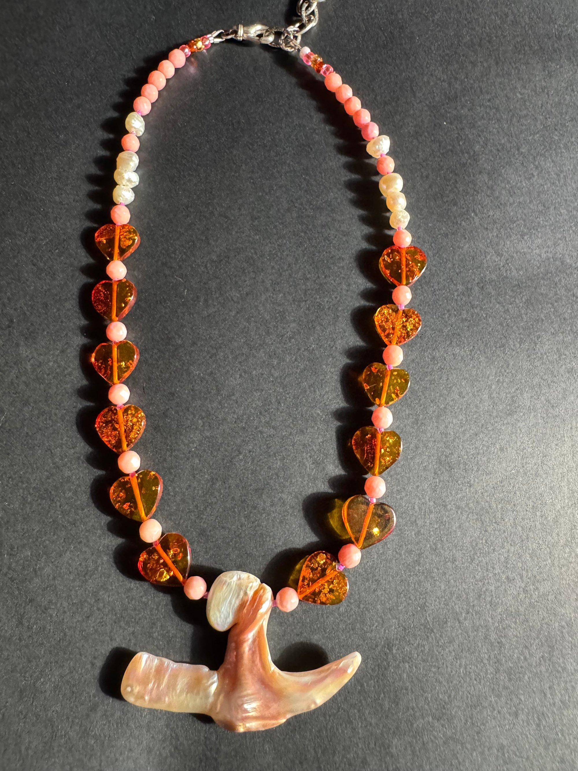 Pearl, Amber, coral, glass, sterling silver. Adjustable length 18”-20”