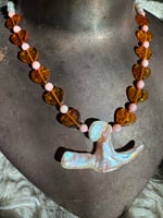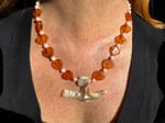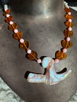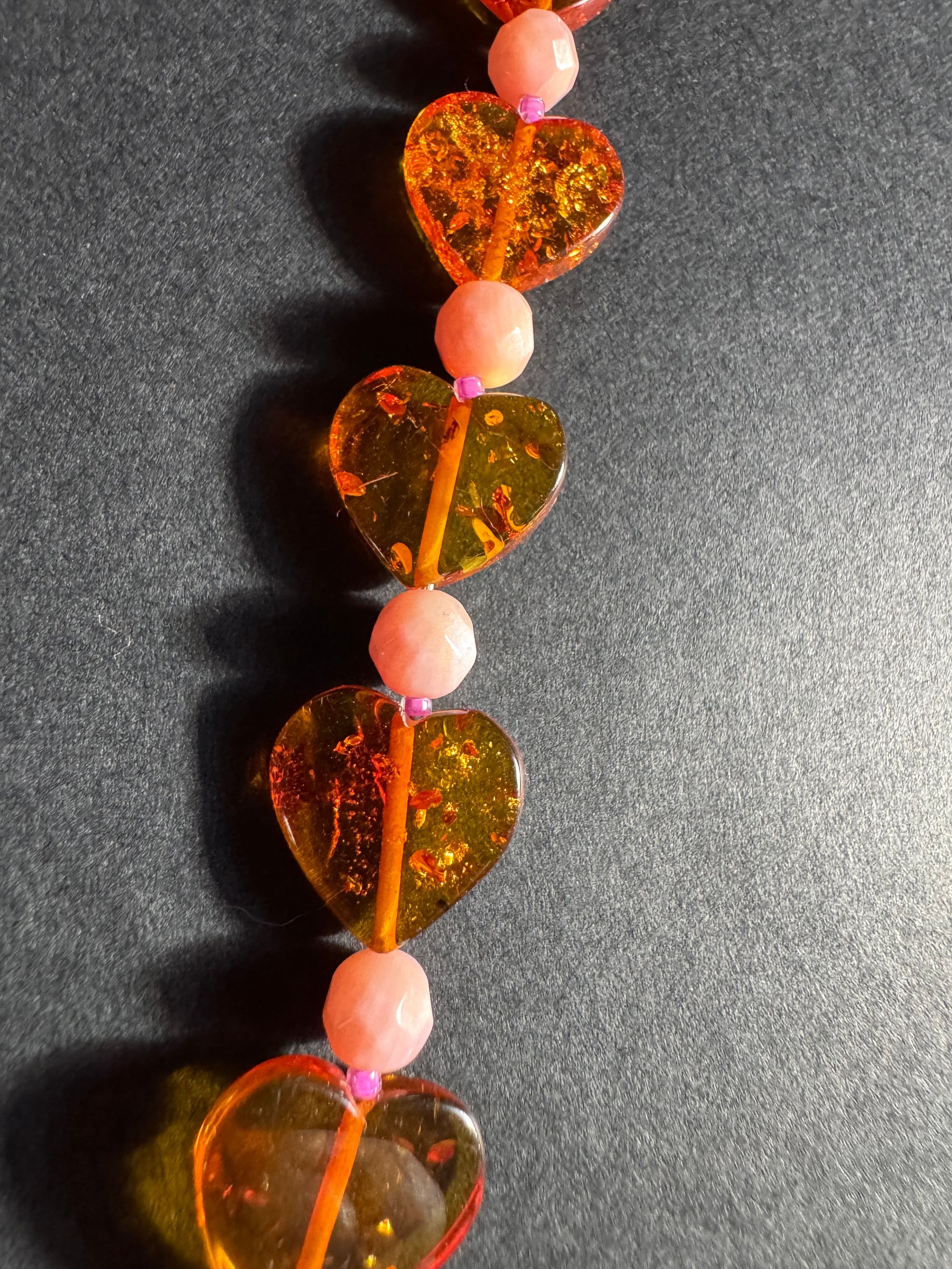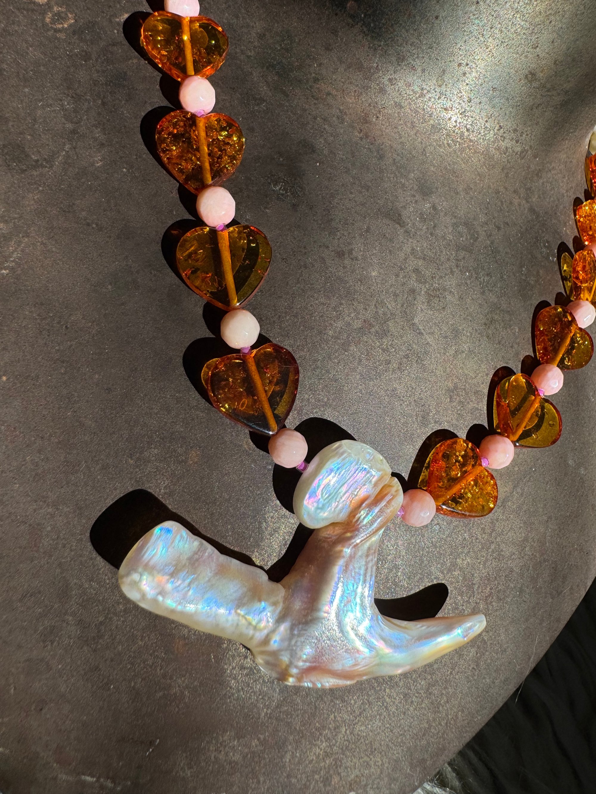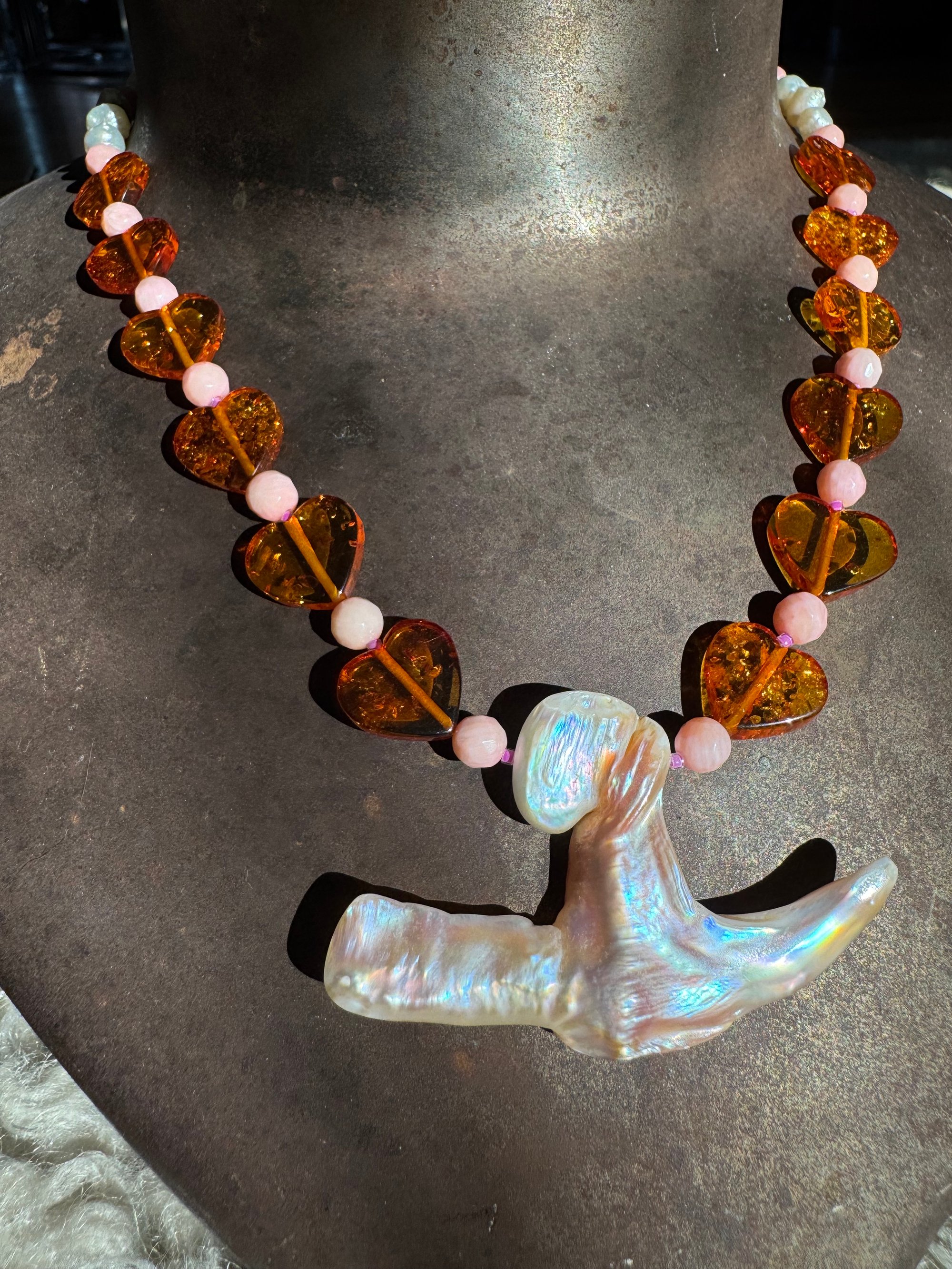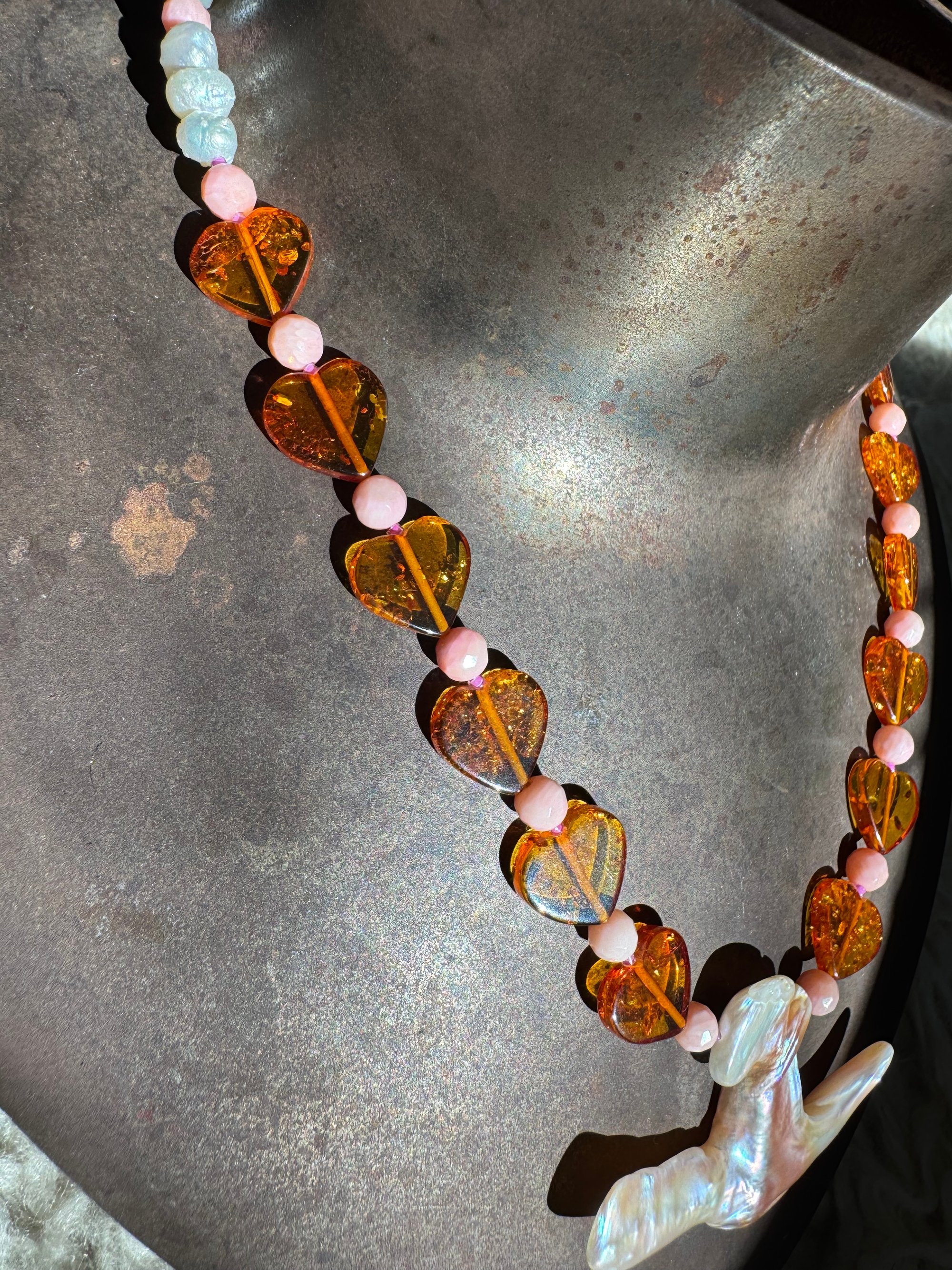 Pearl, Amber, coral, glass, sterling silver. Adjustable length 18”-20”