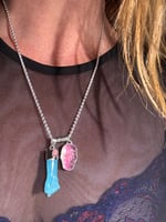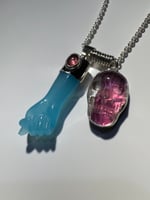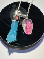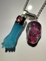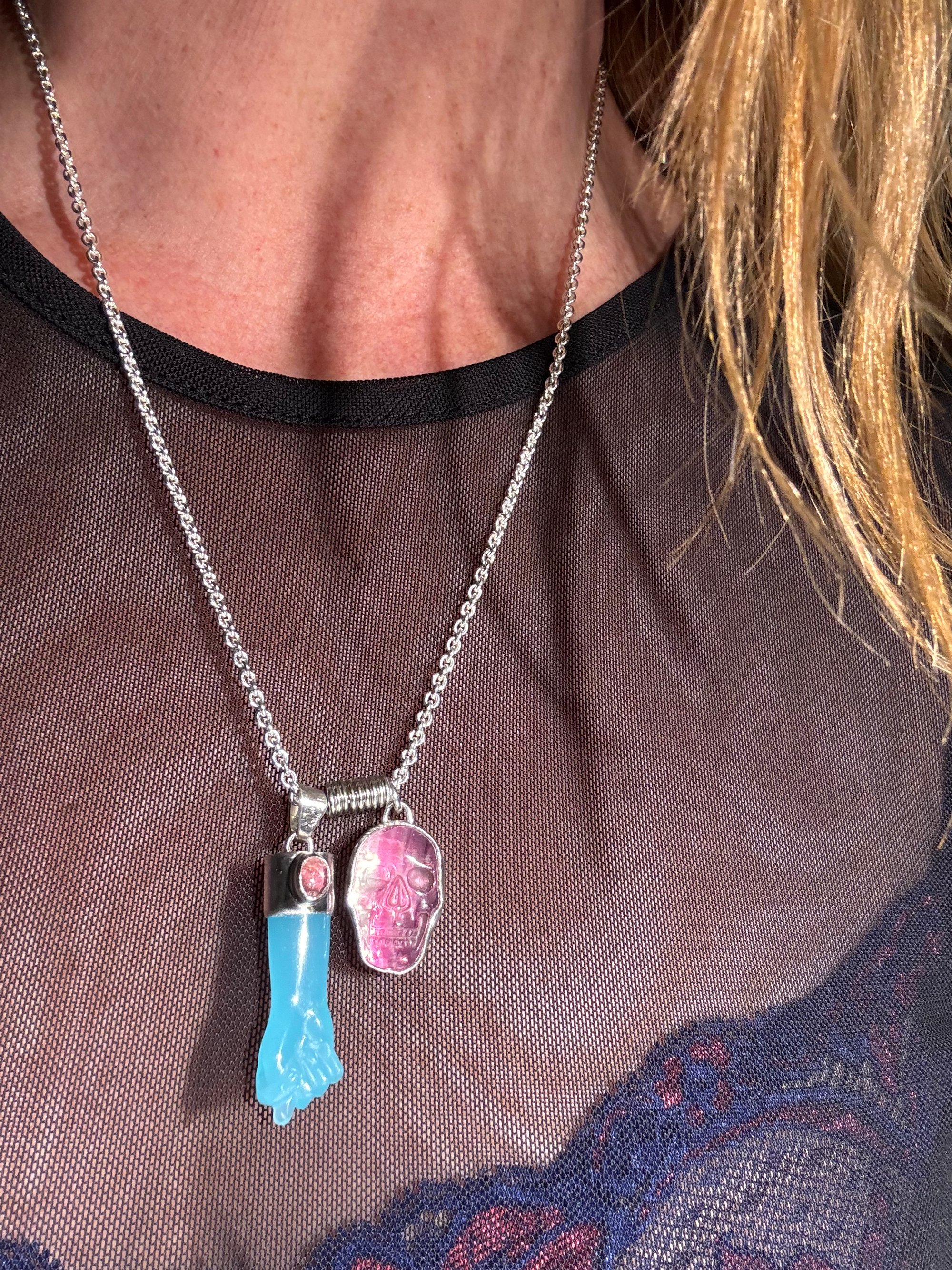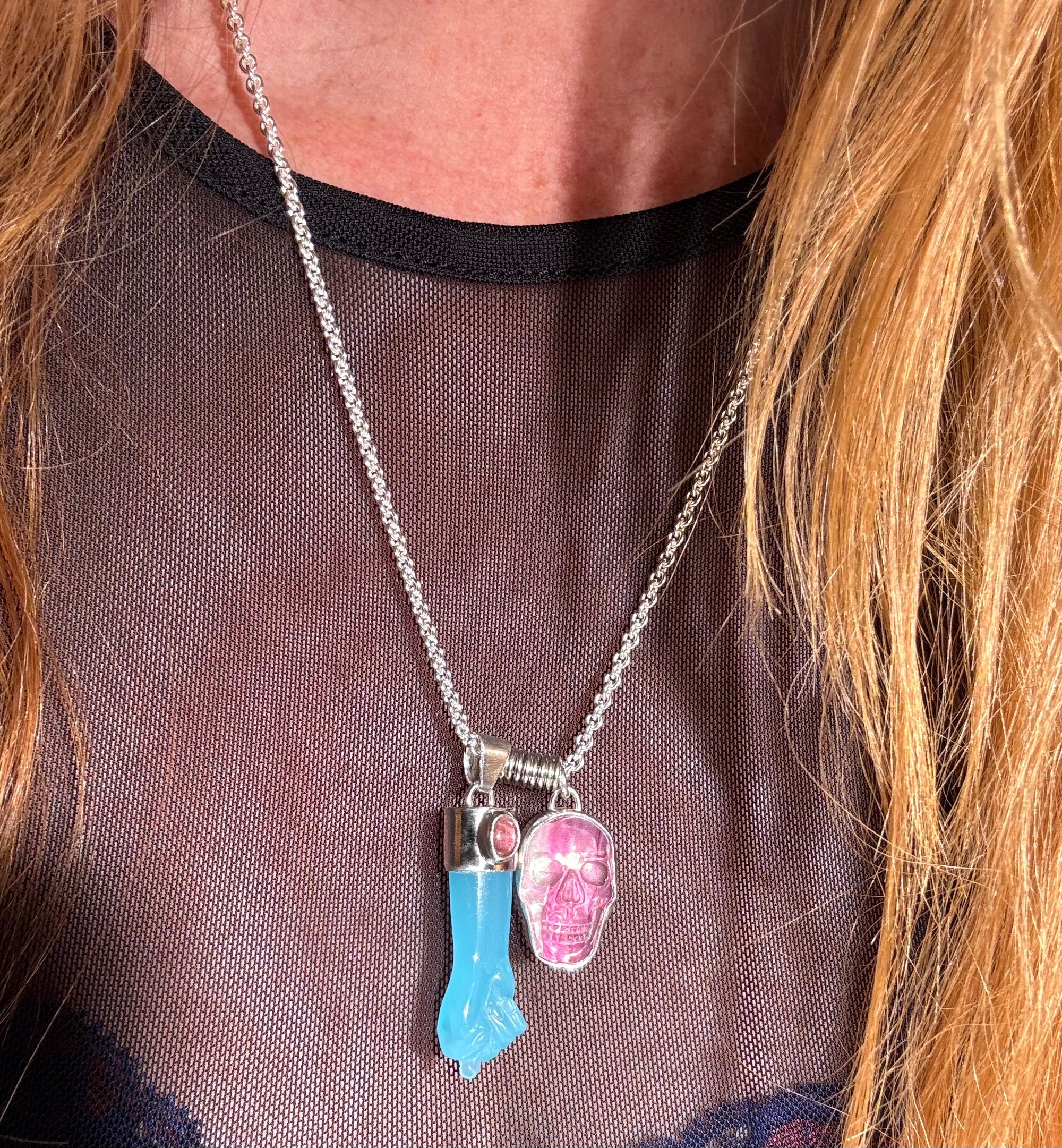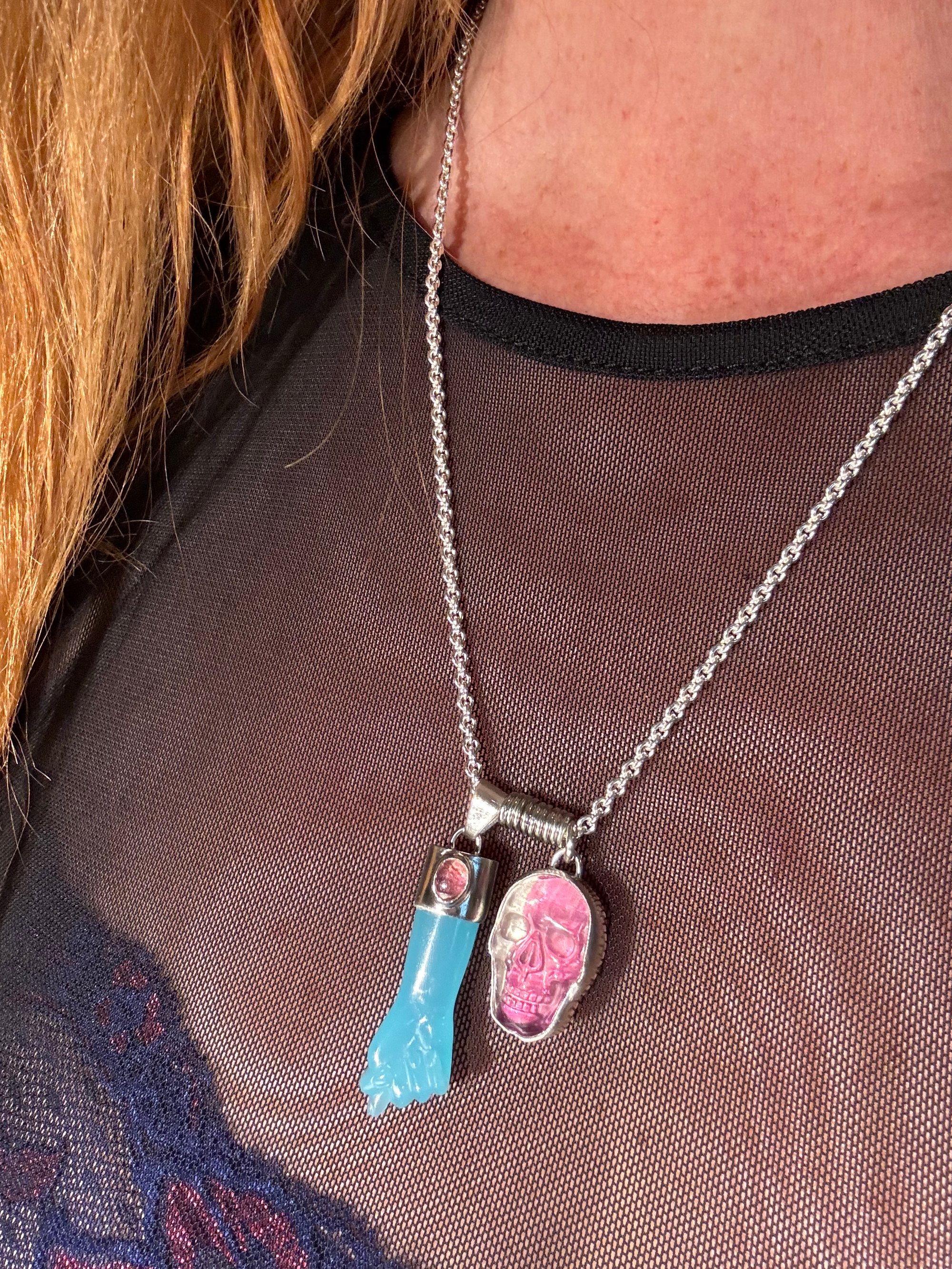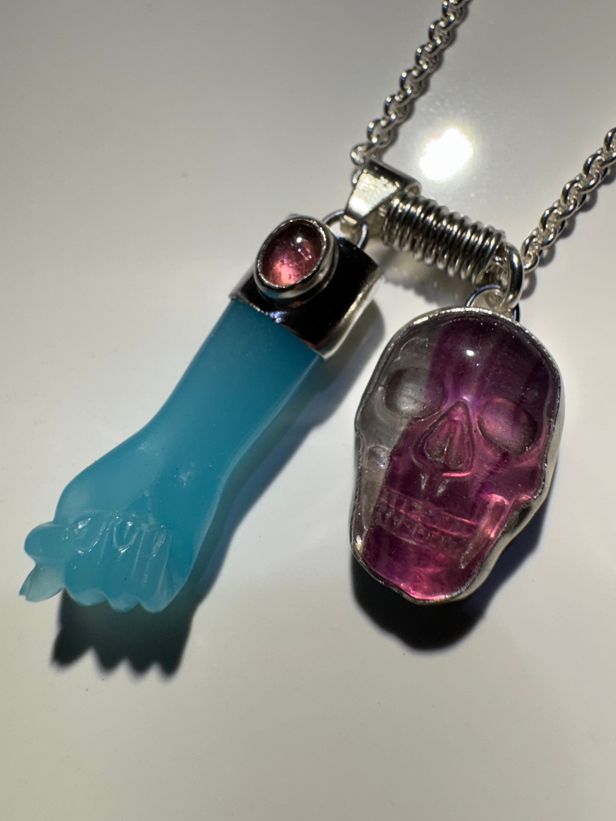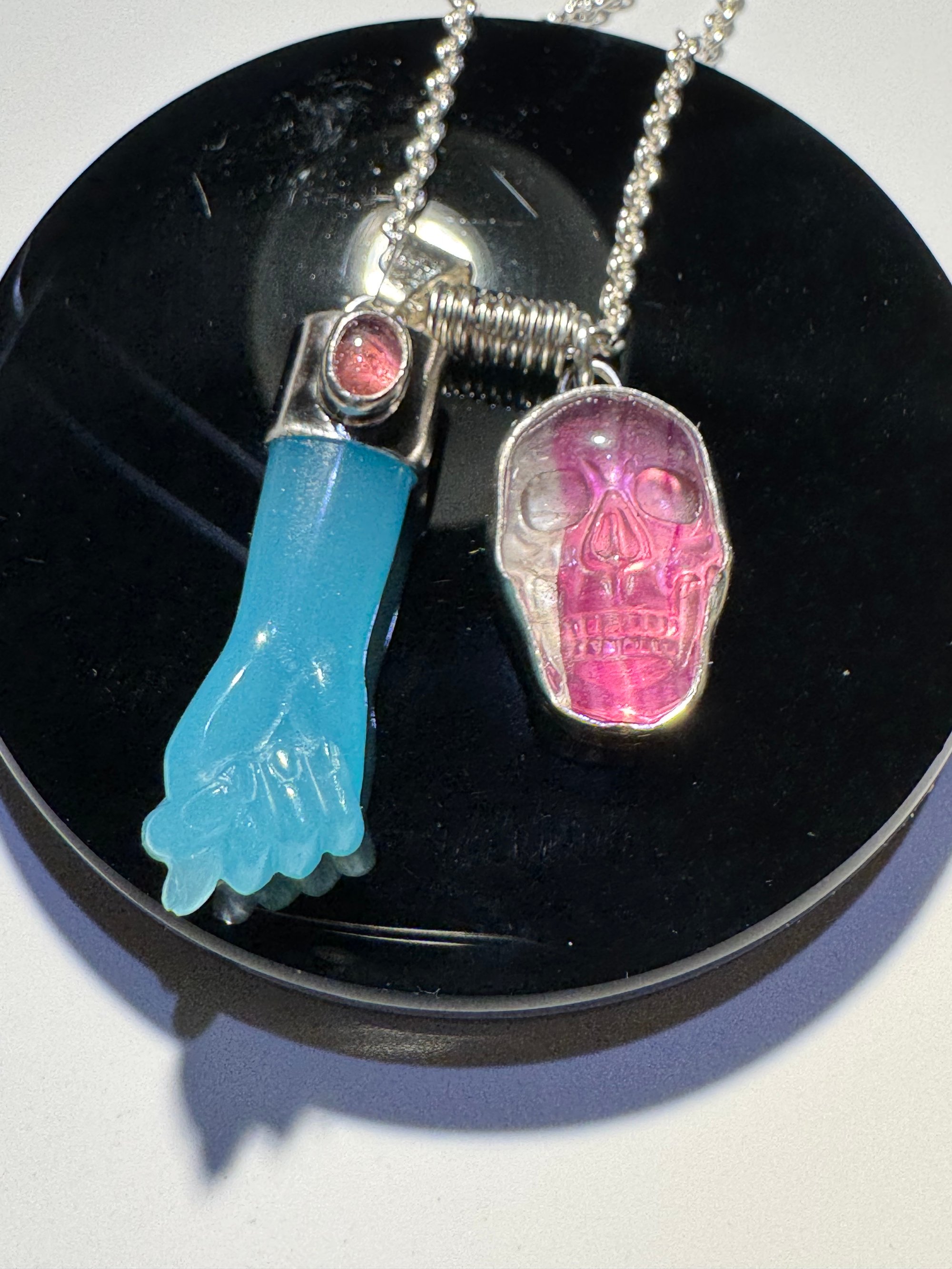 Blue chalcedony mano figa with pink tourmaline accent, fluorite skull, coil, argentium and sterling silver. 21” chain with lobster clasp