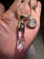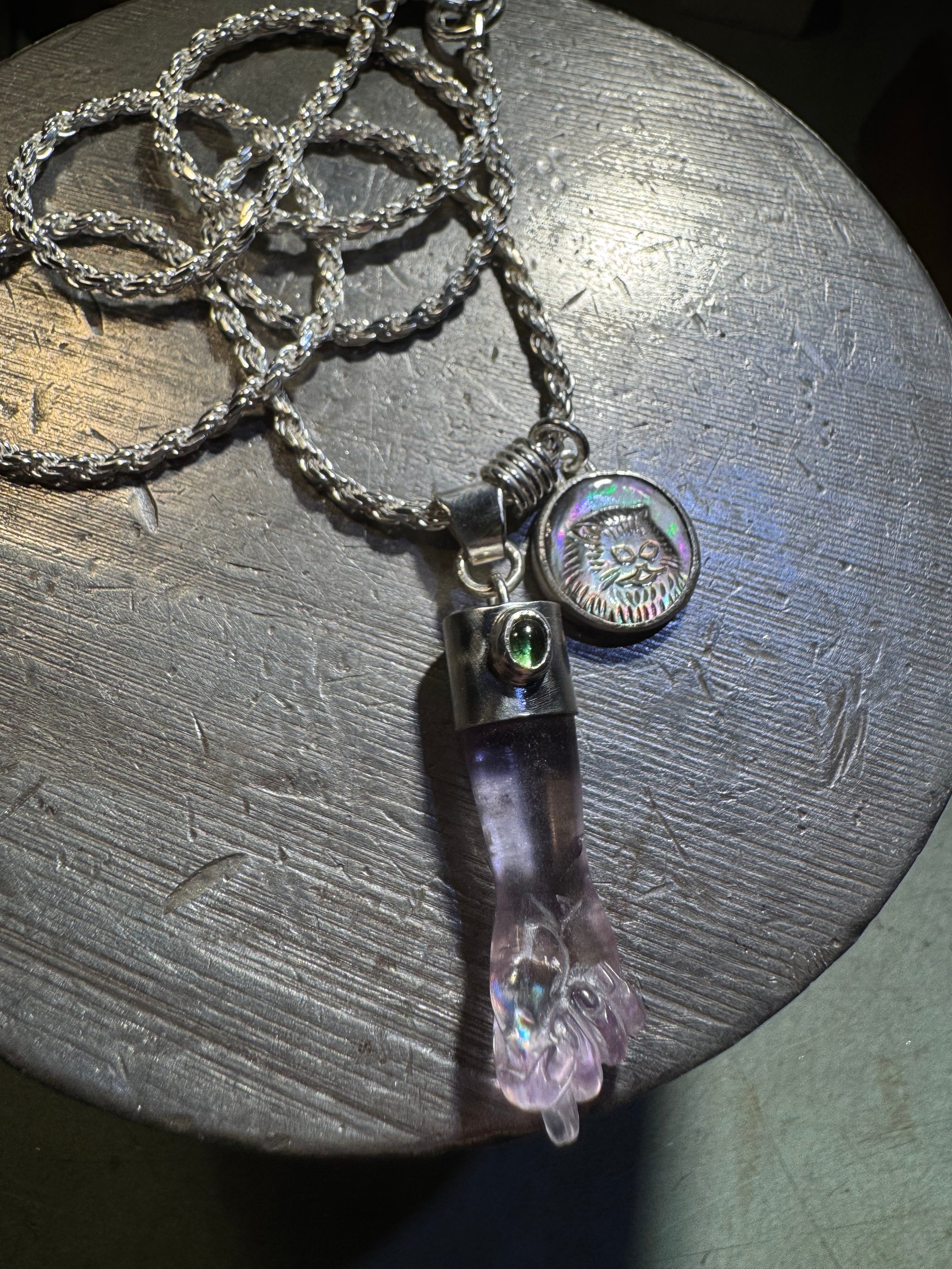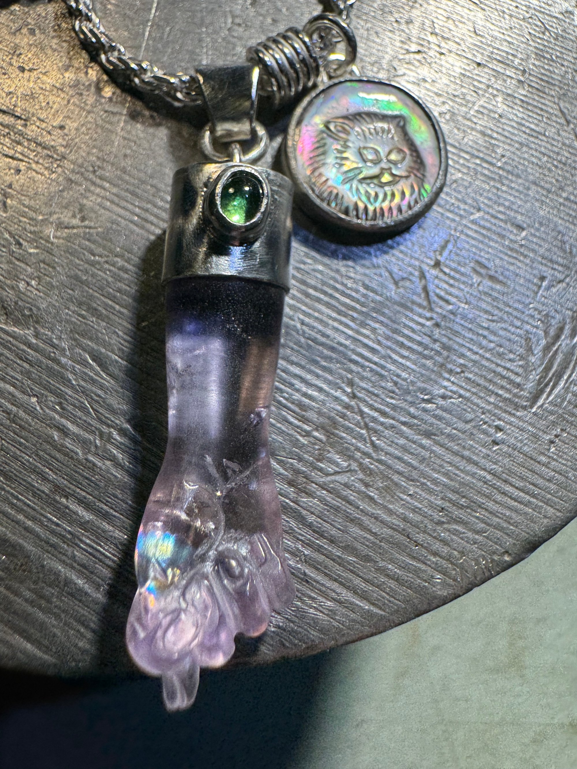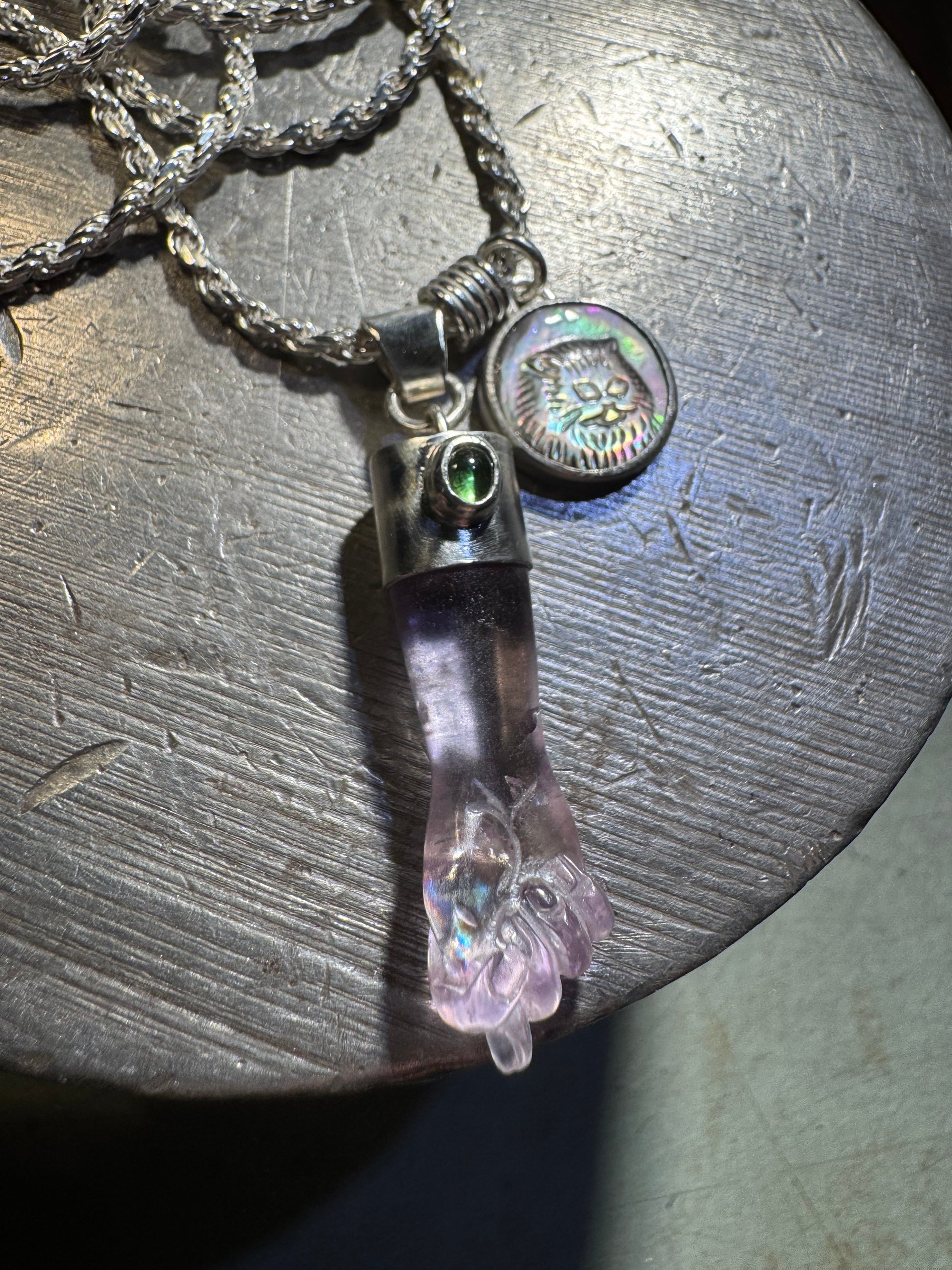 Amethyst mano figa with green tourmaline accent. Mother of pearl cat cameo. Argentium and sterling silver. Hangs on 21” rope chain with lobster clasp.