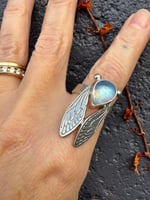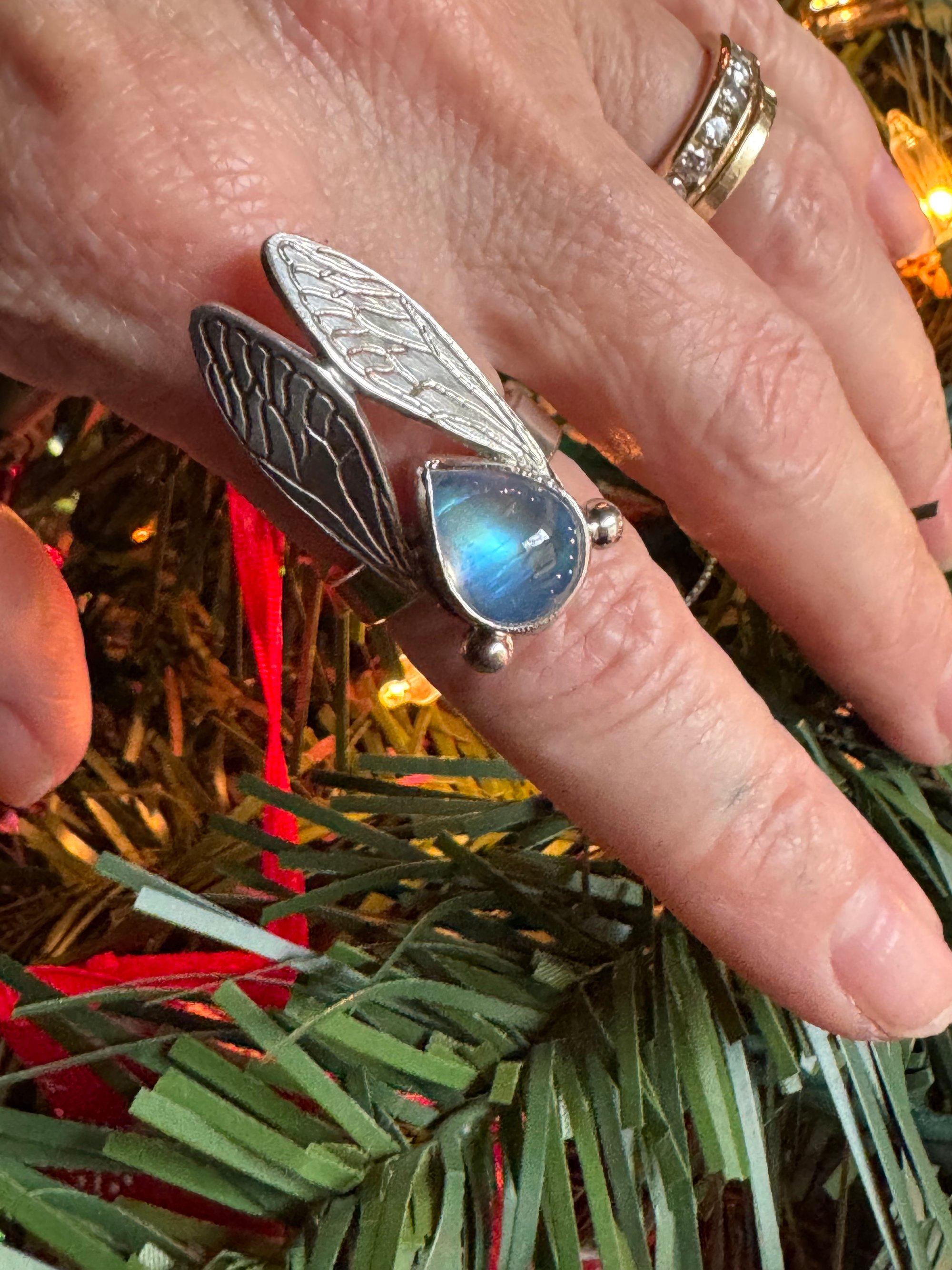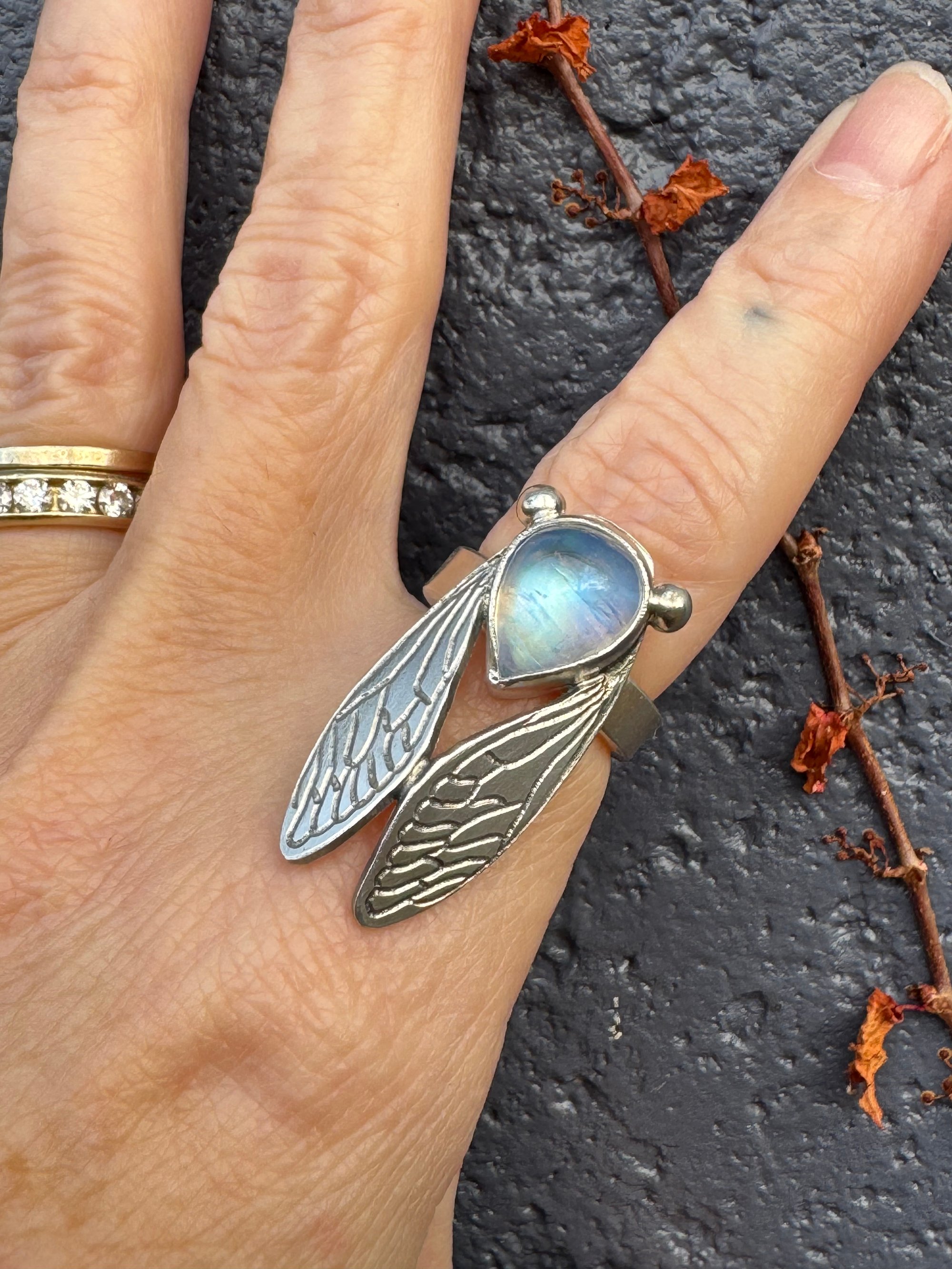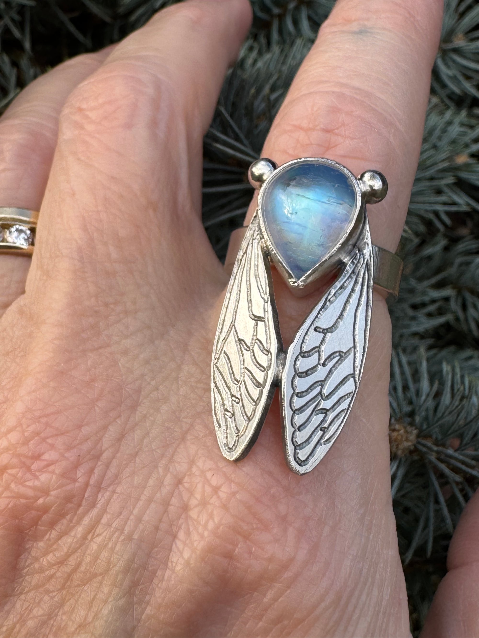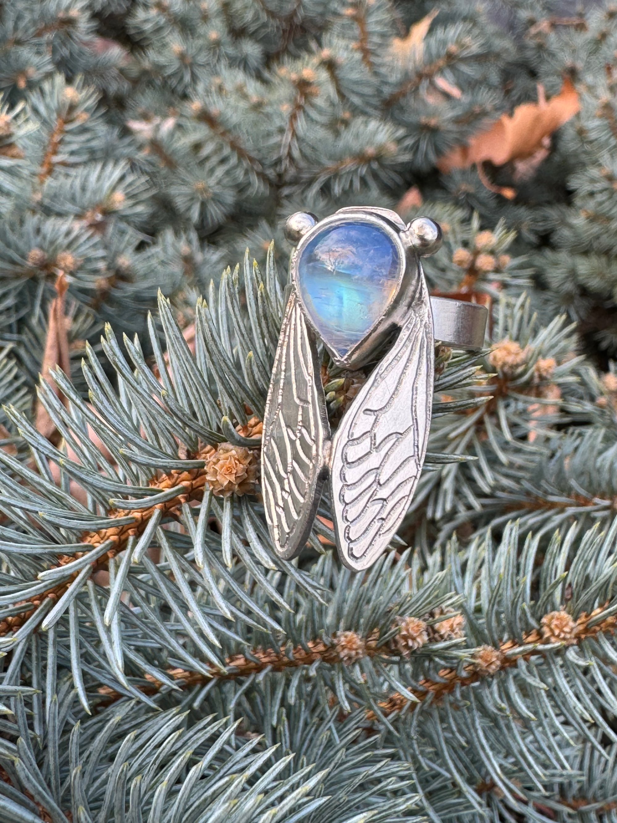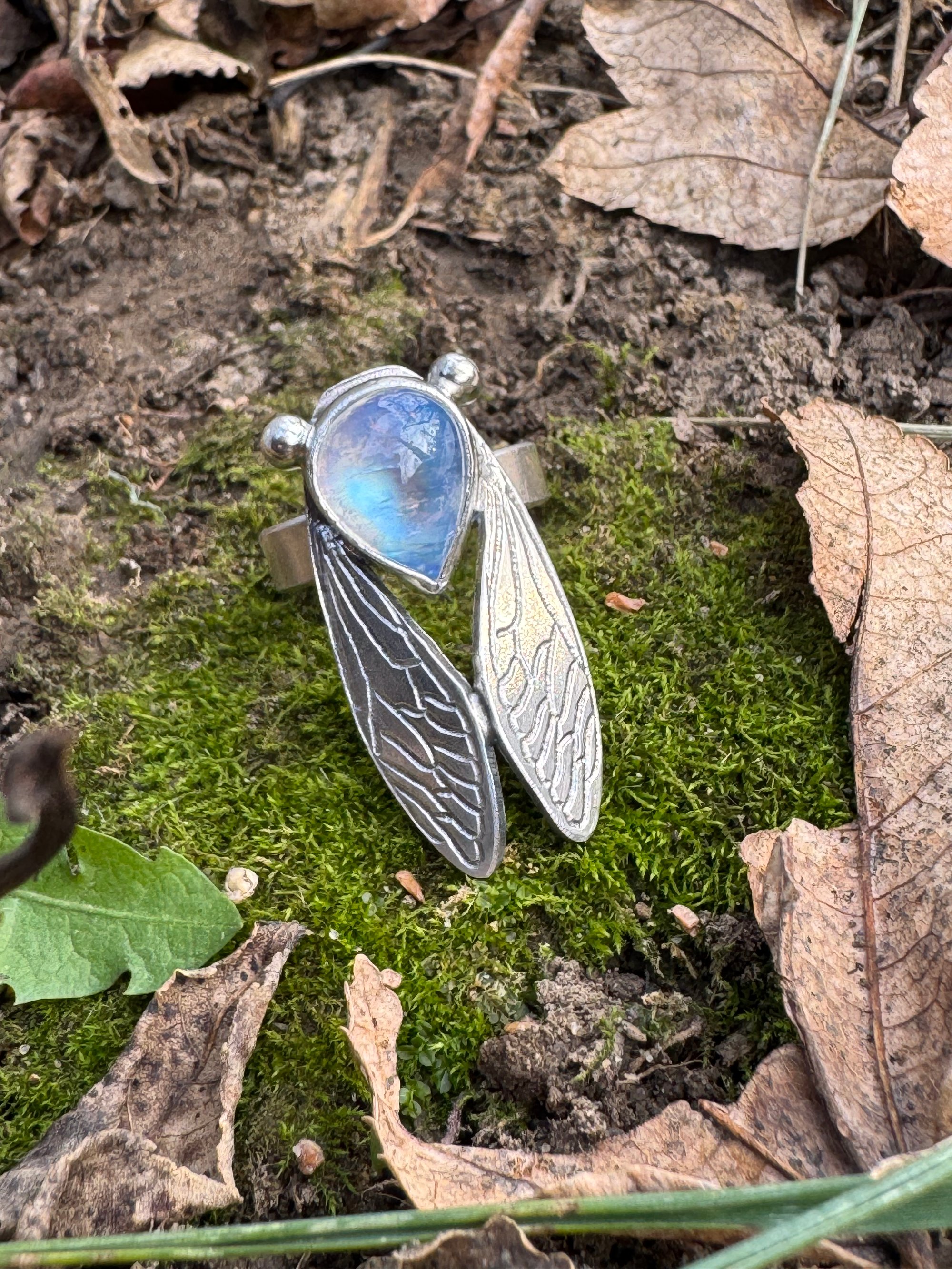 Gorgeous, glowing moonstone and argentium silver cicada ring size 5.75. Cicada measures 5/8” x 1 1/4”