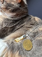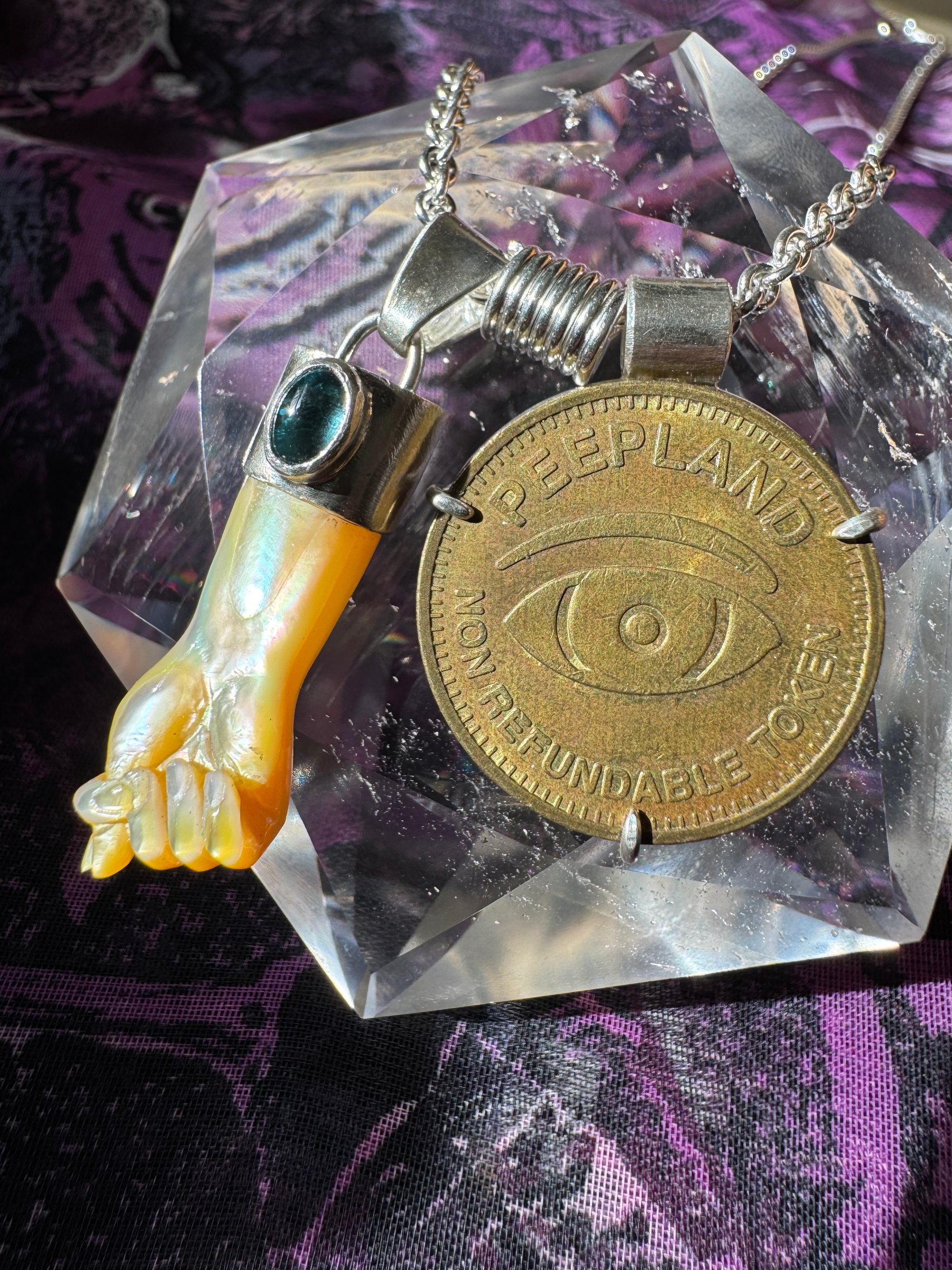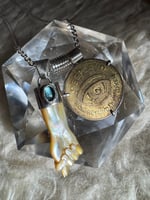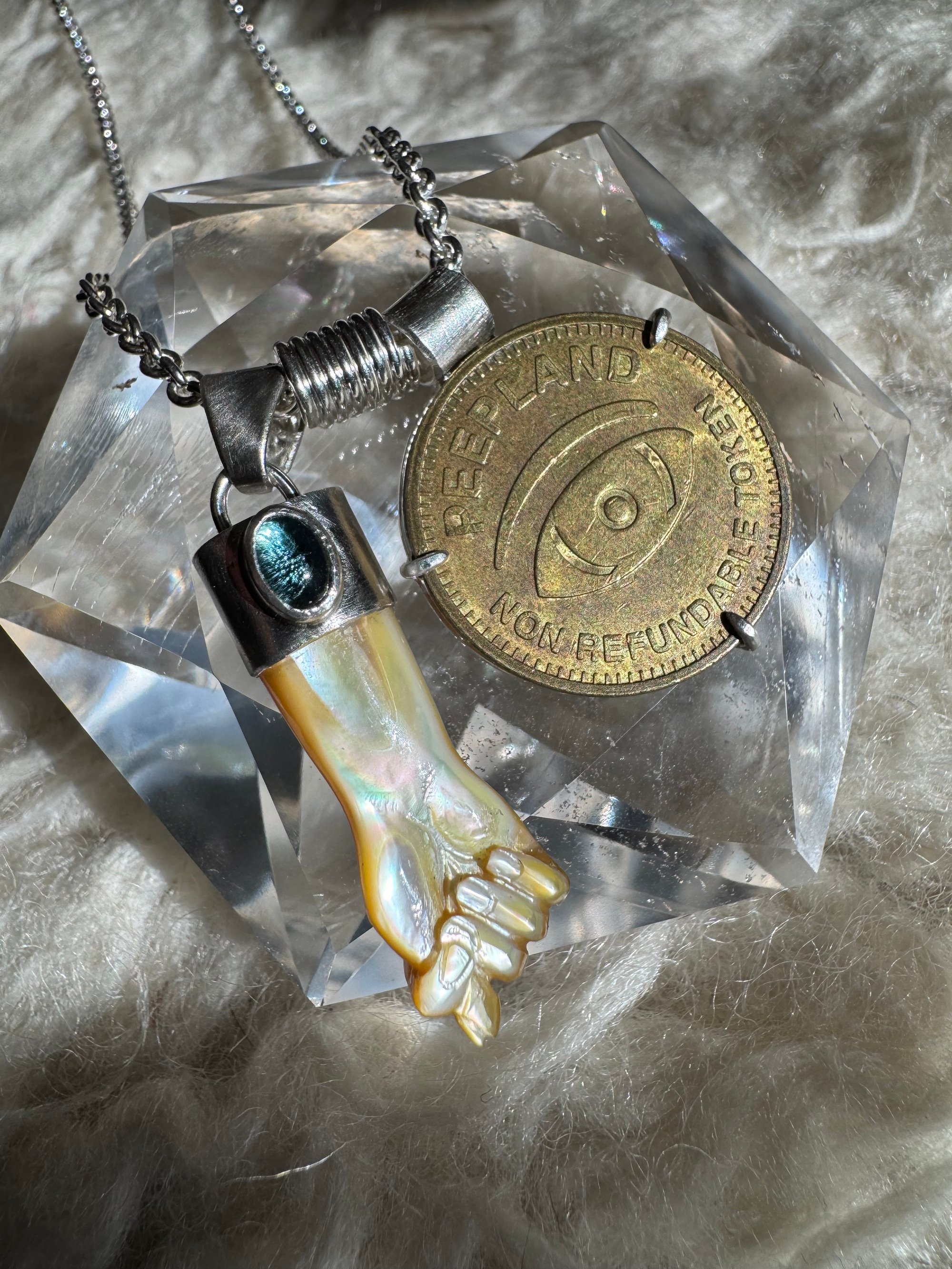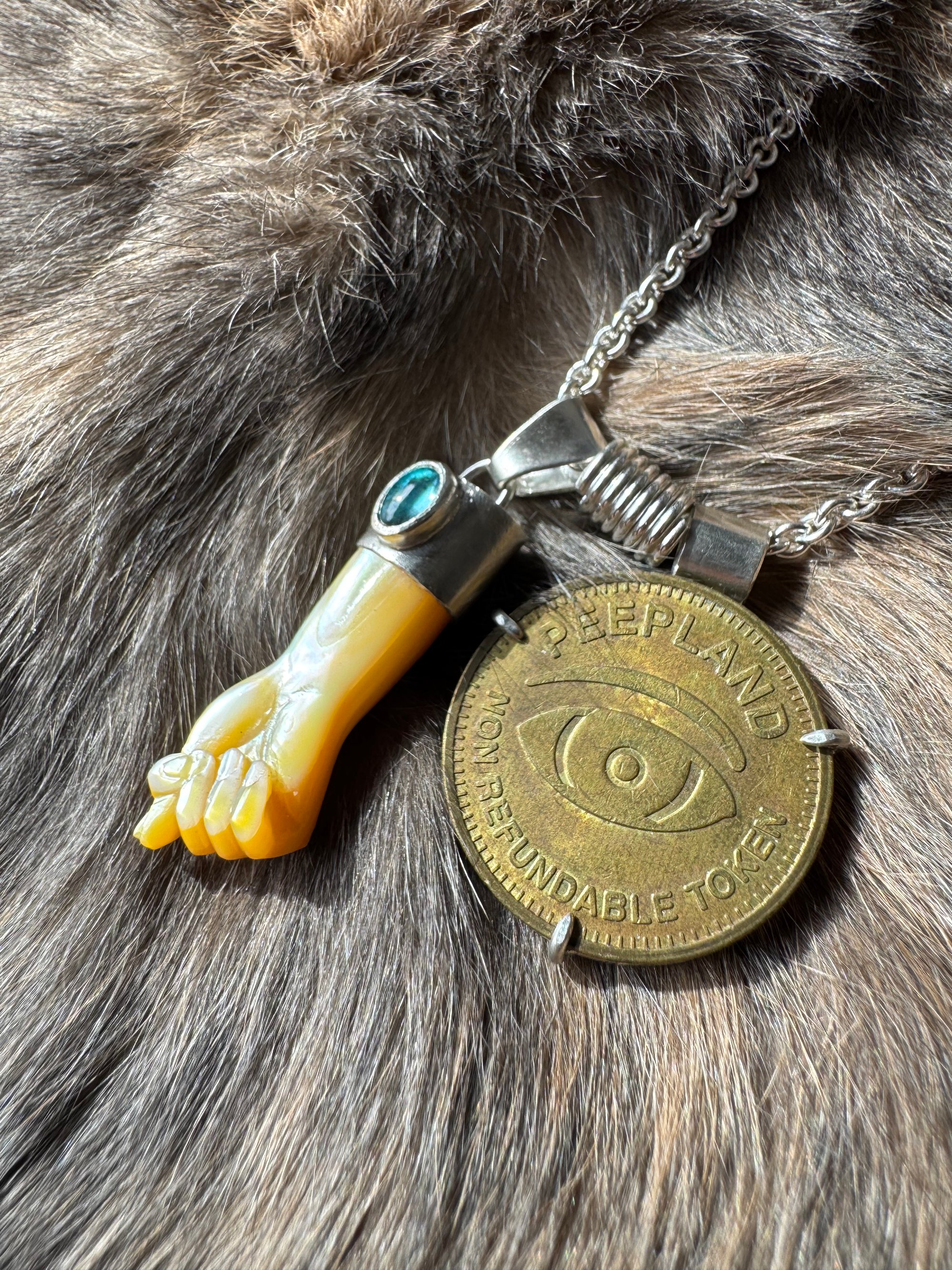 Mother of Pearl mano figa carving with blue tourmaline accent. Brass coin. Sterling and argentium silver setting, chain, and clasp. 20” chain.
