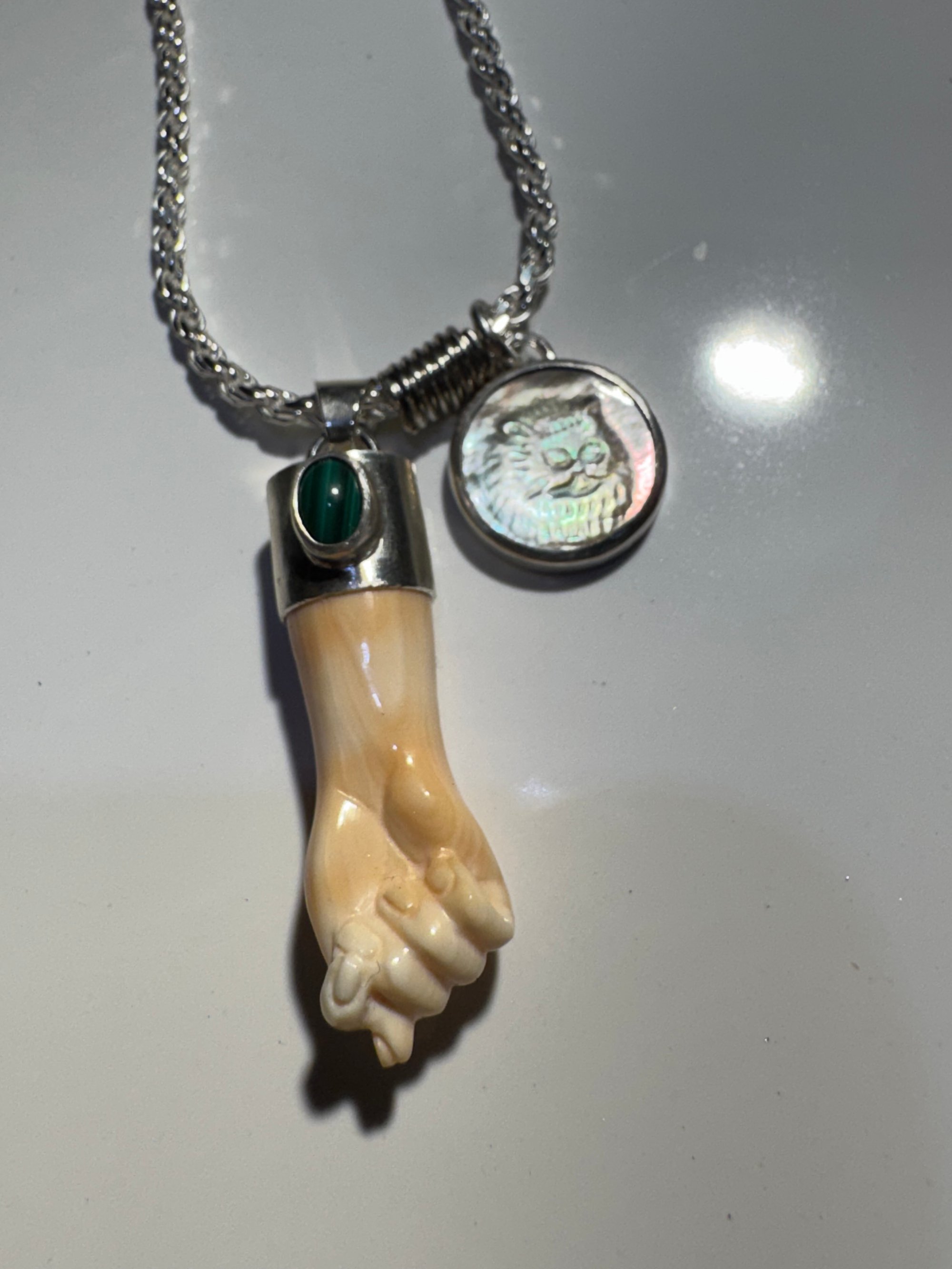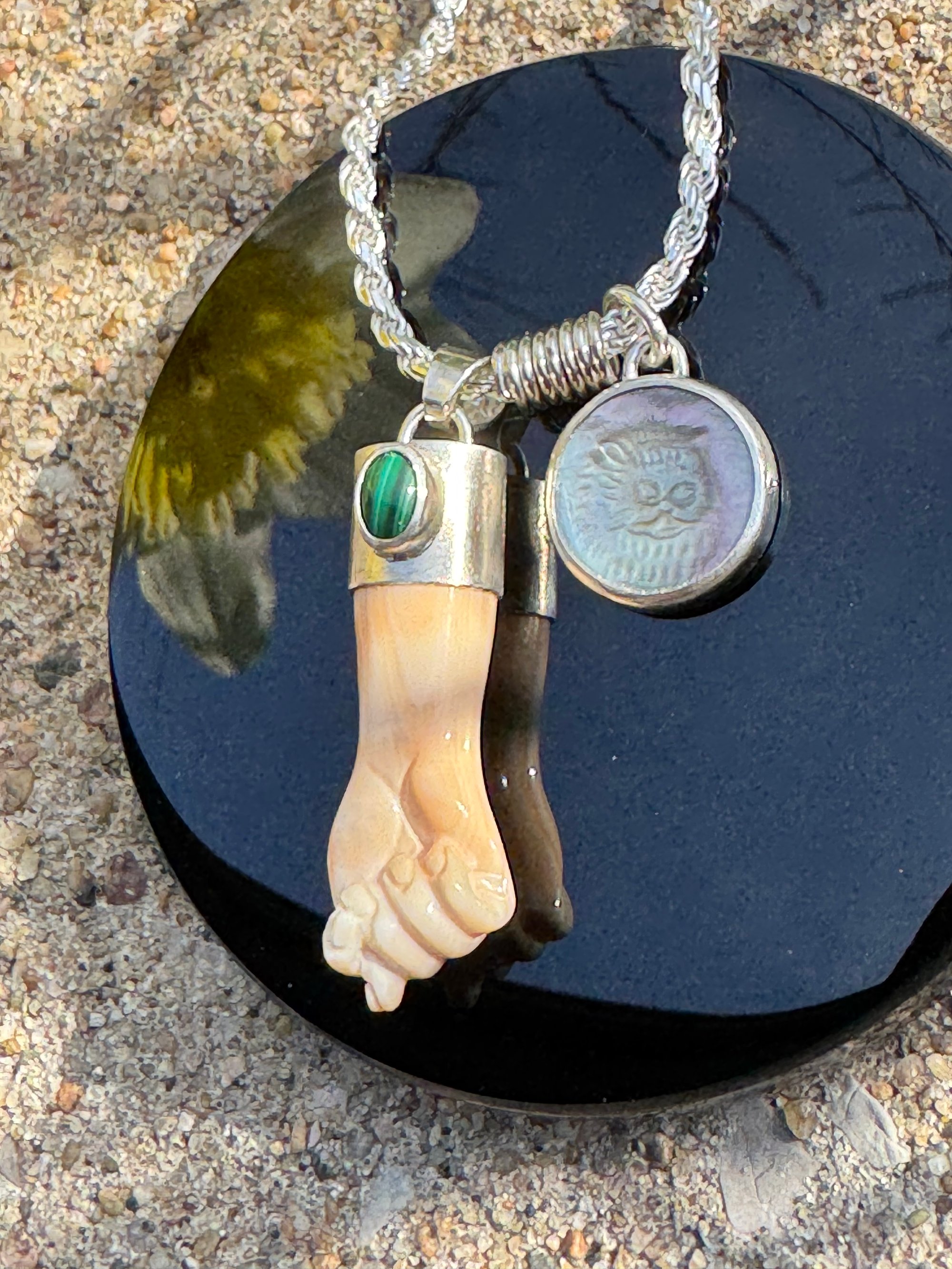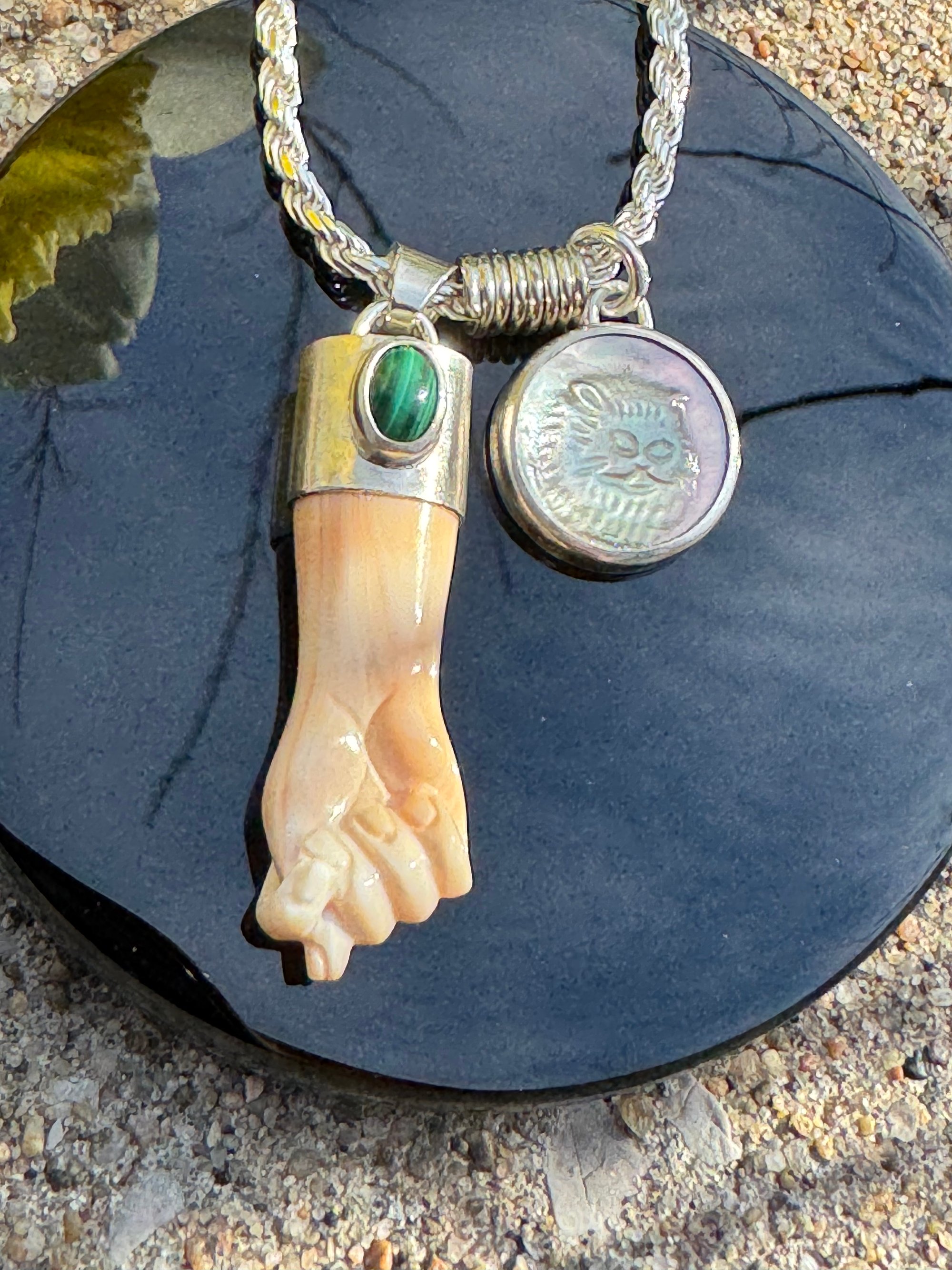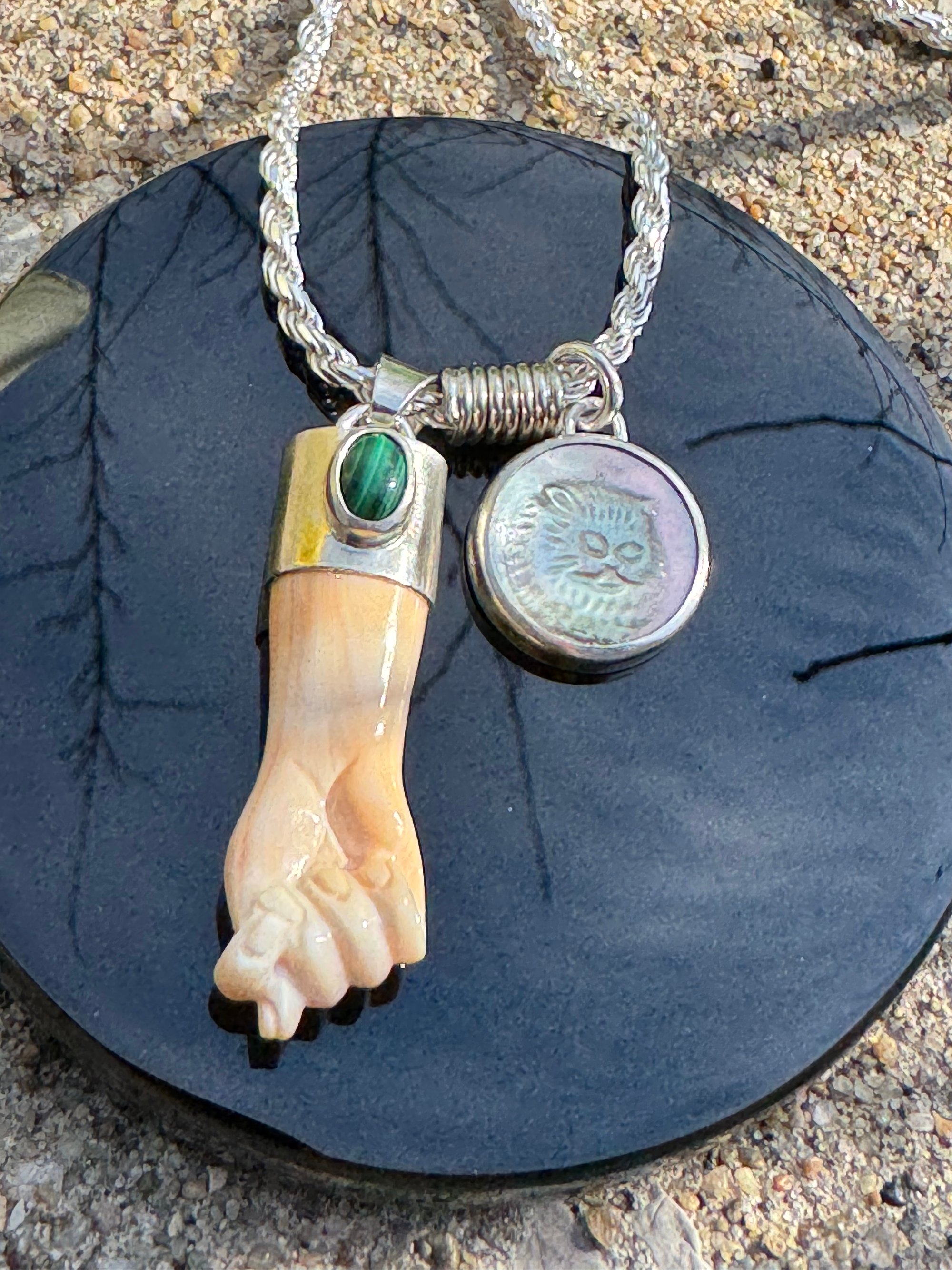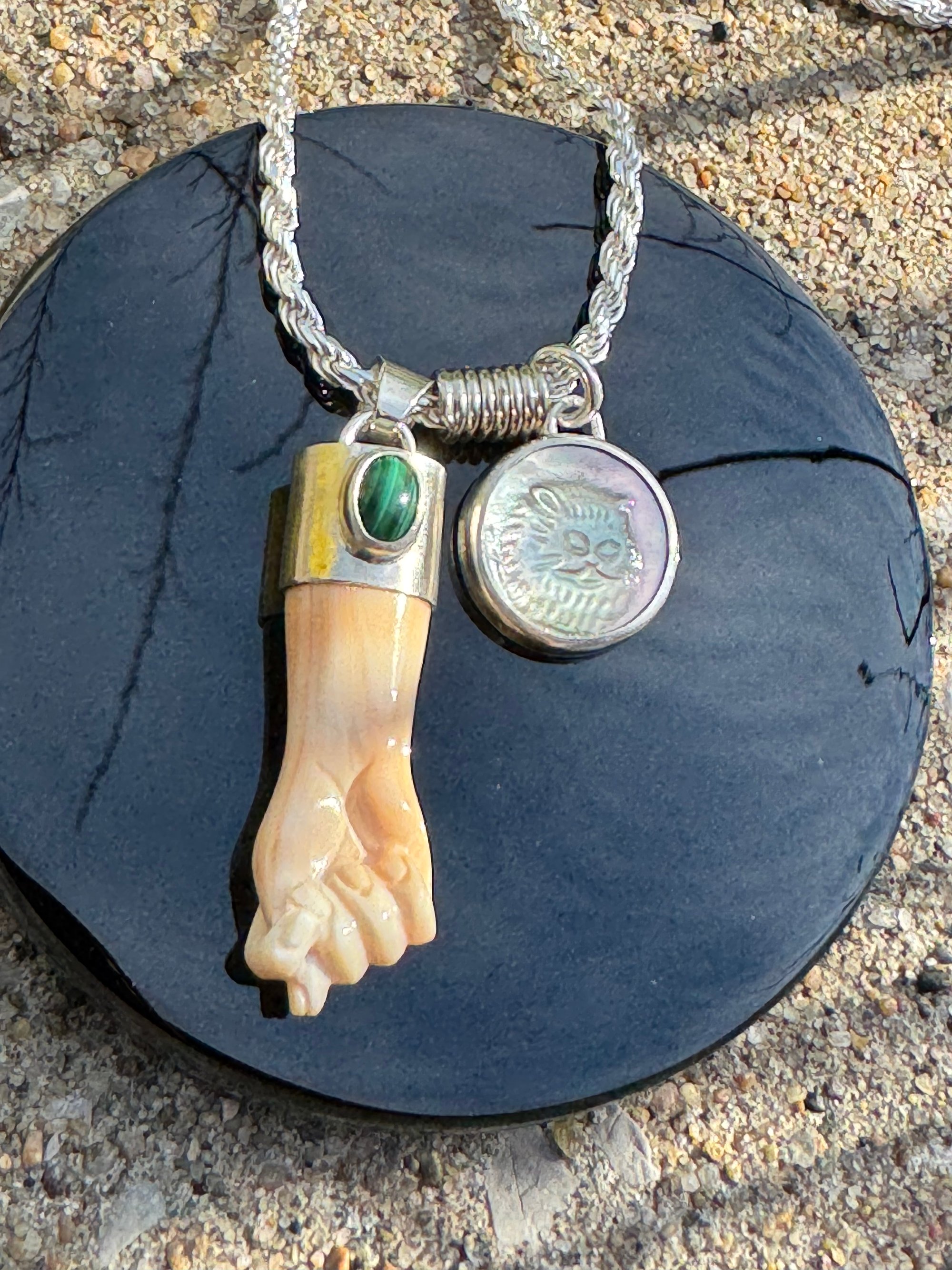 Shell mano figa with malachite accent, mother of pearl cat cameo, coil. Argentium and sterling silver on 21” chain with lobster clasp.