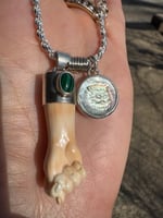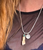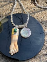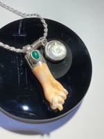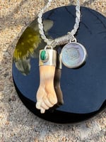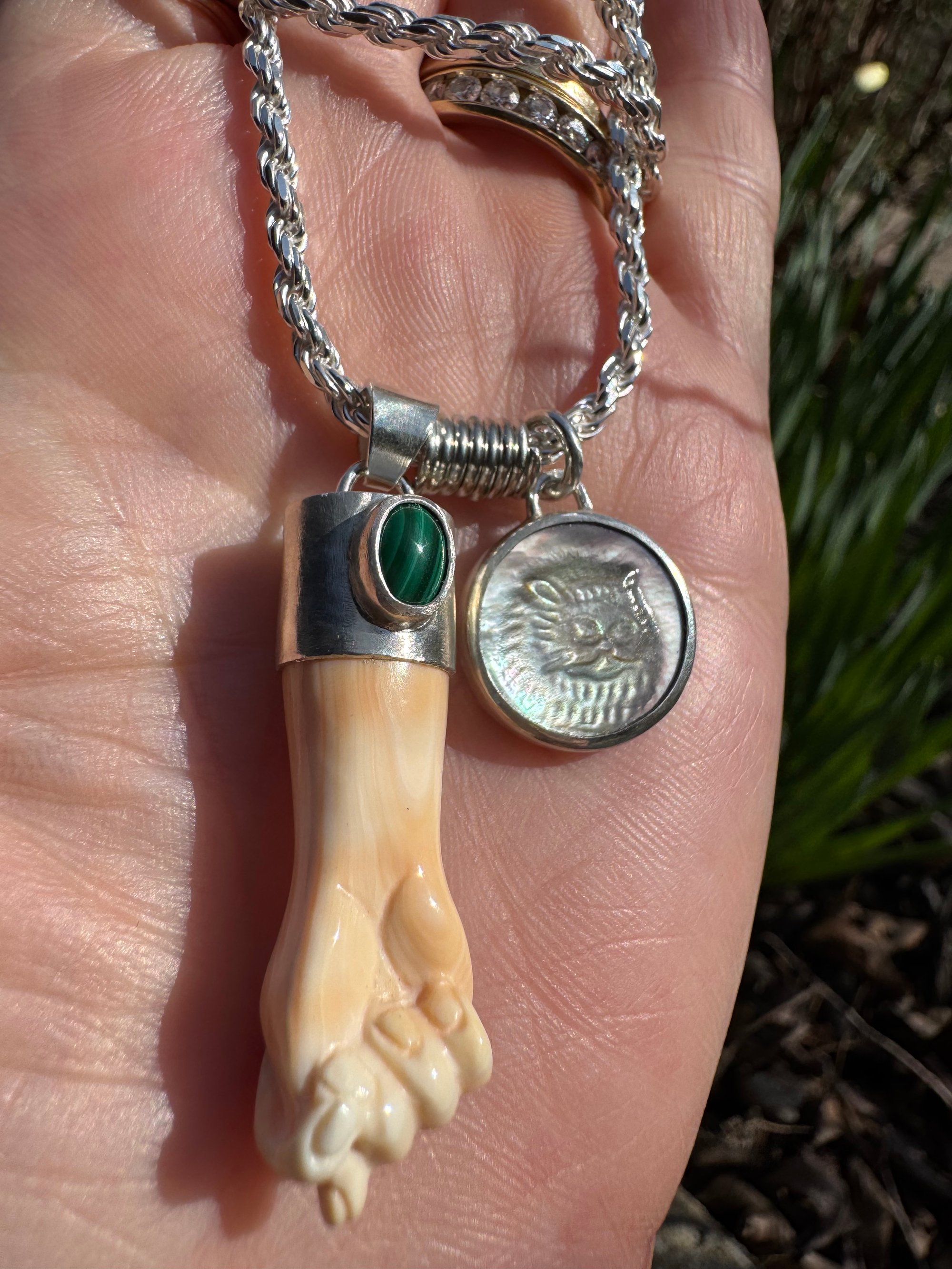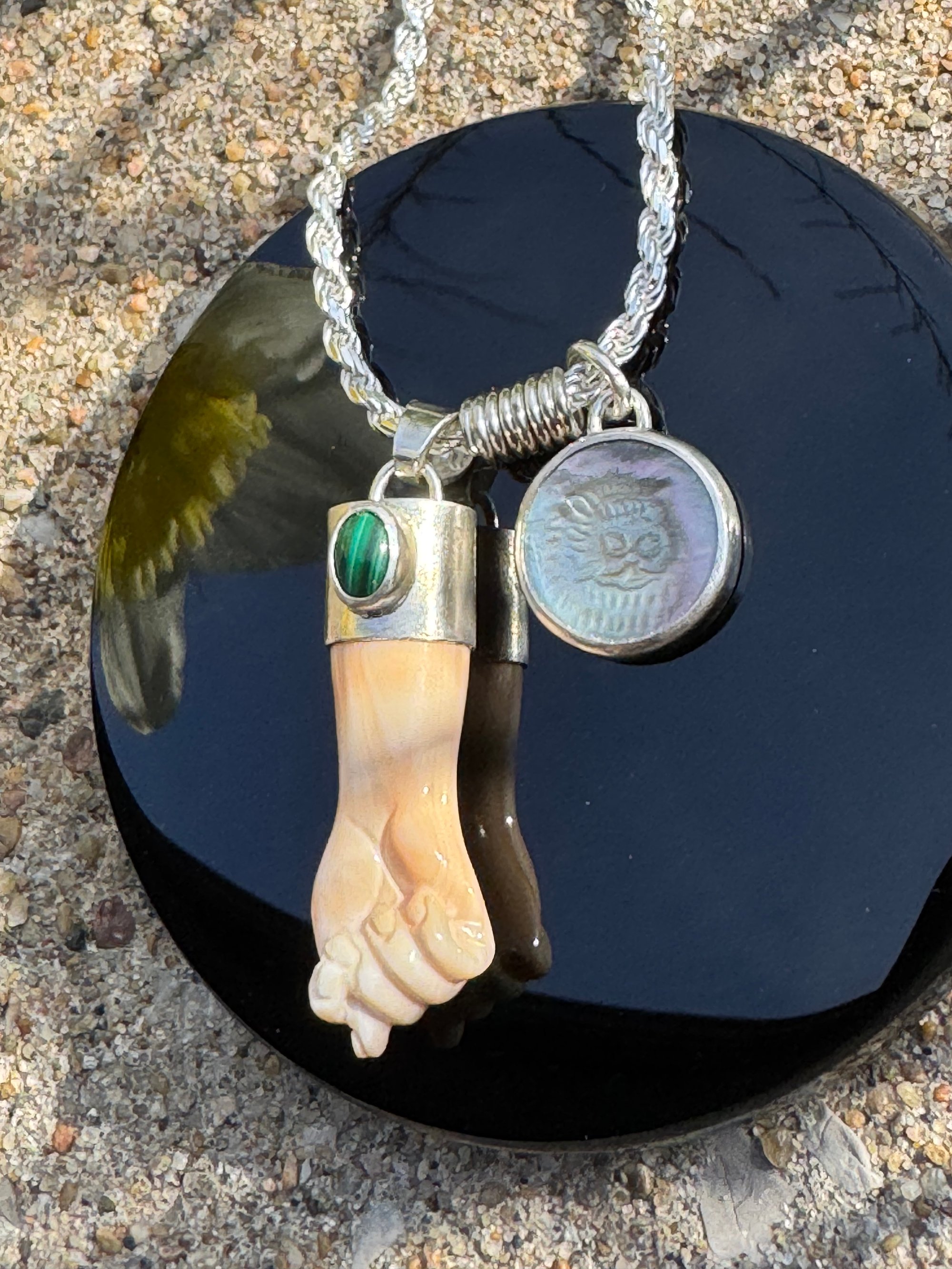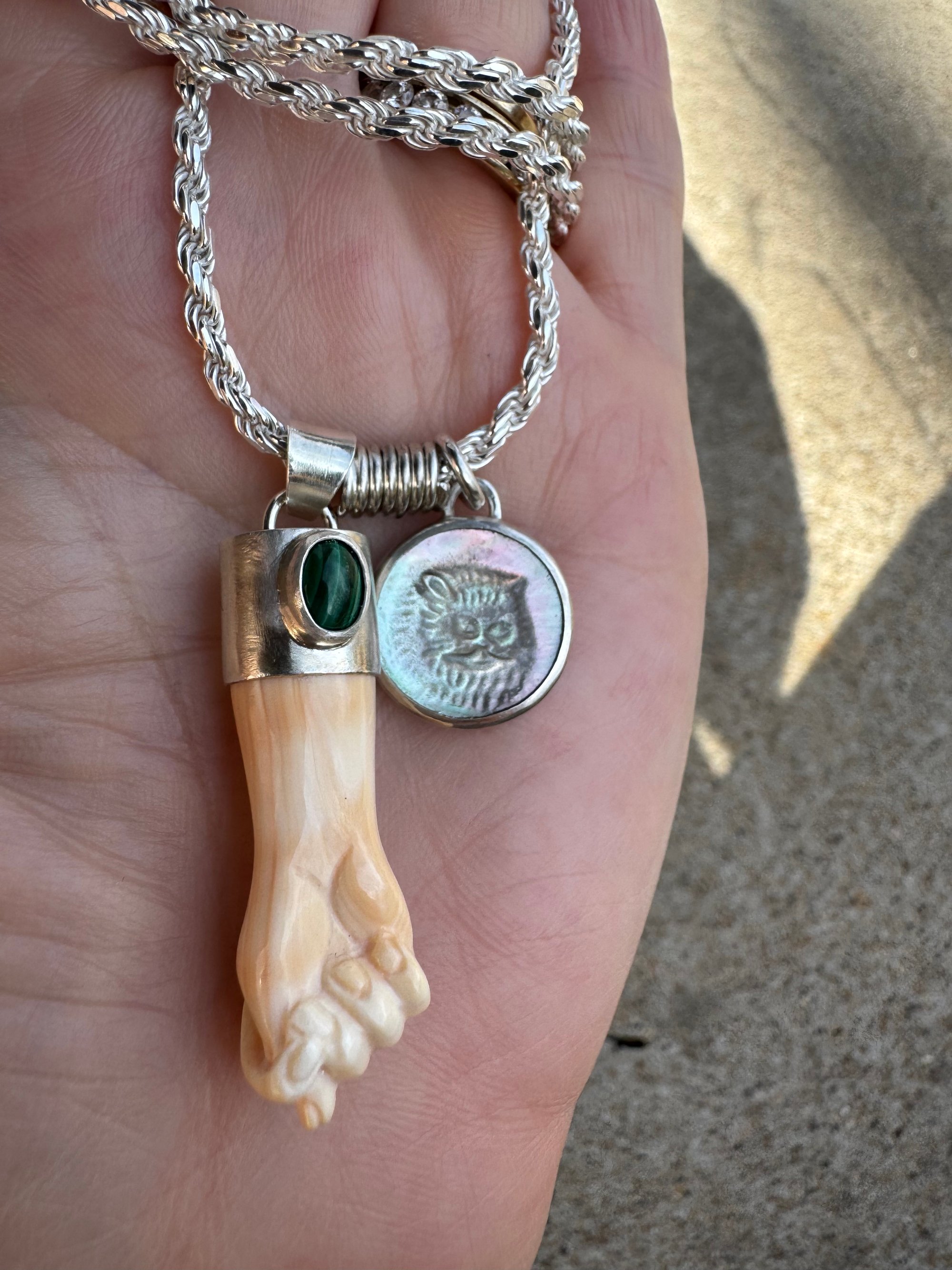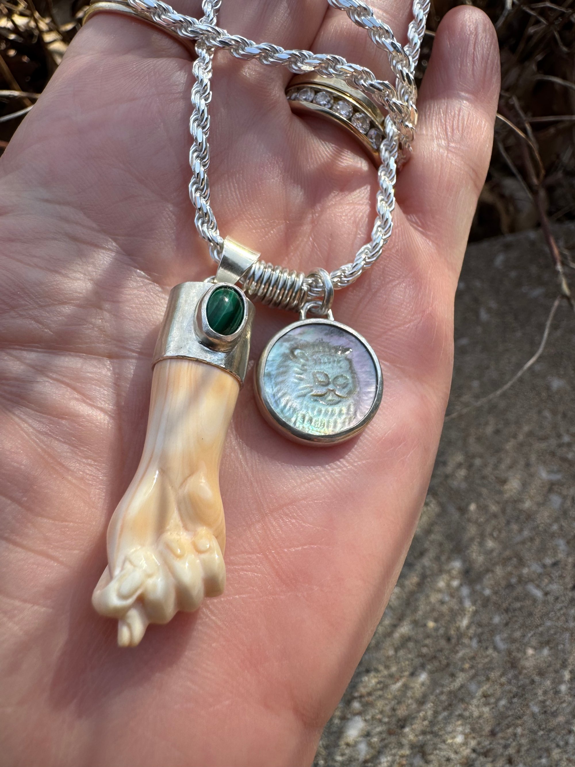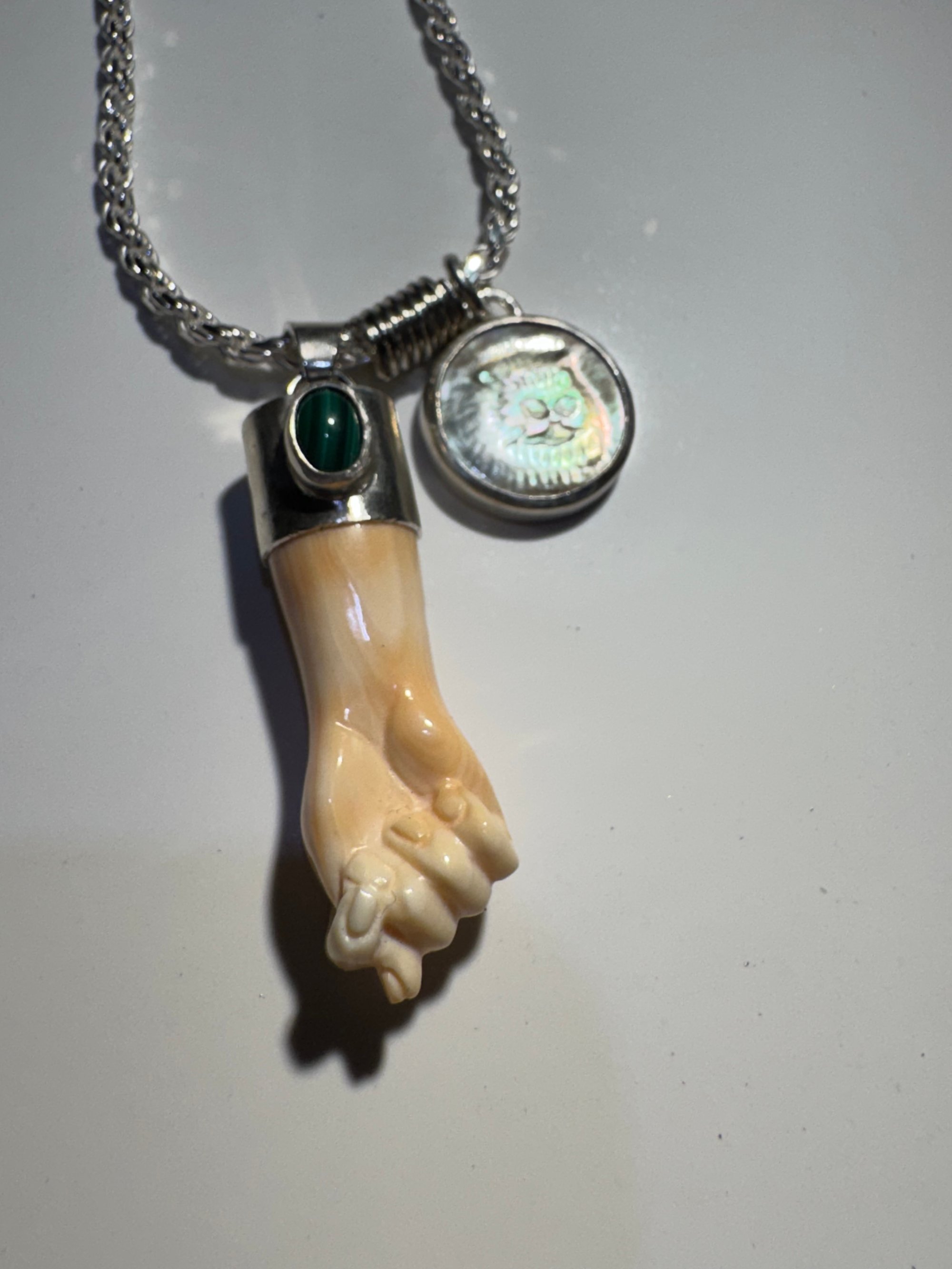 Shell mano figa with malachite accent, mother of pearl cat cameo, coil. Argentium and sterling silver on 21” chain with lobster clasp.