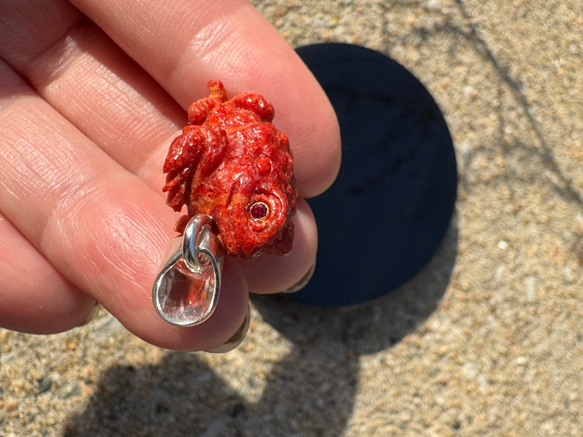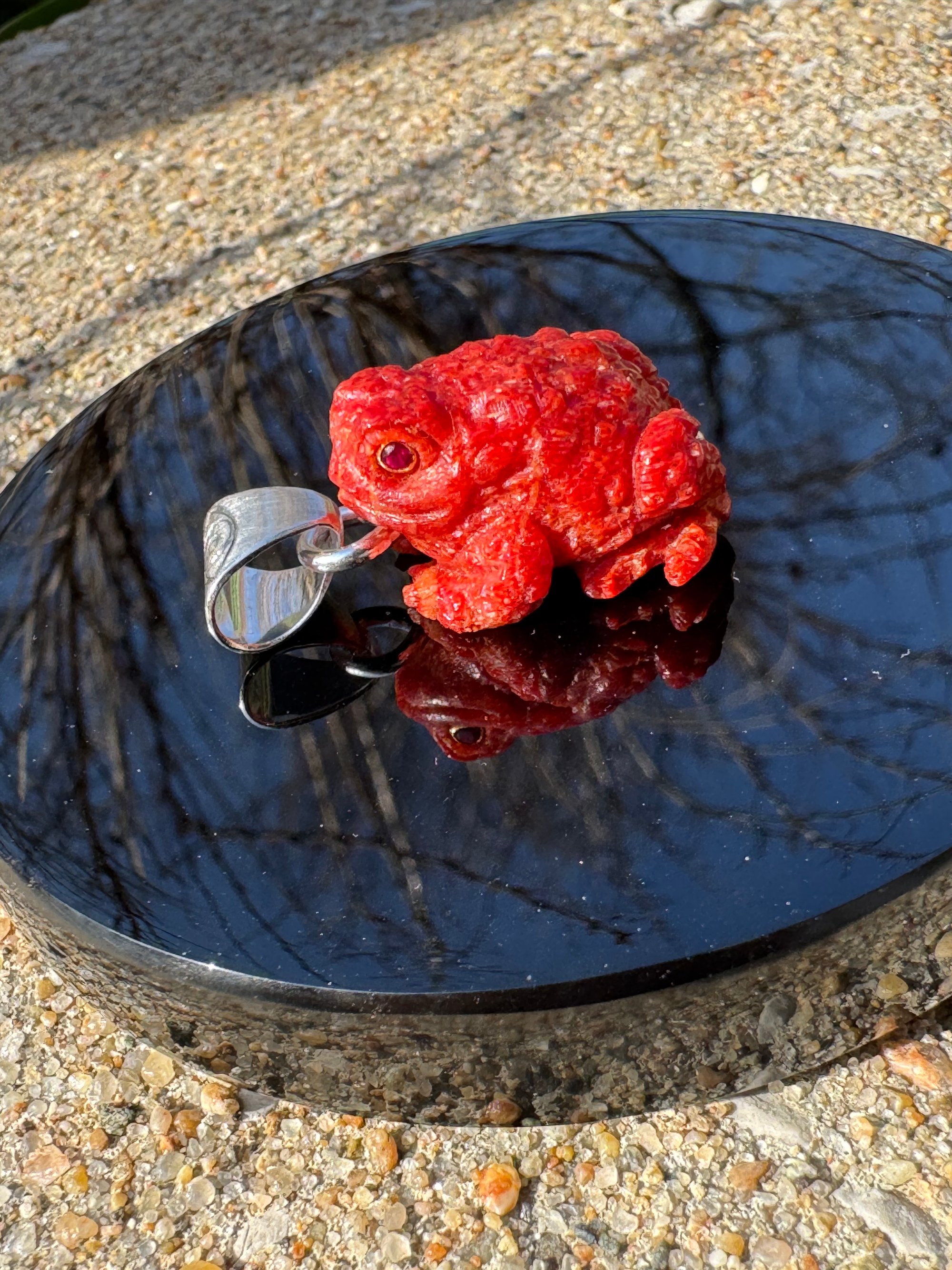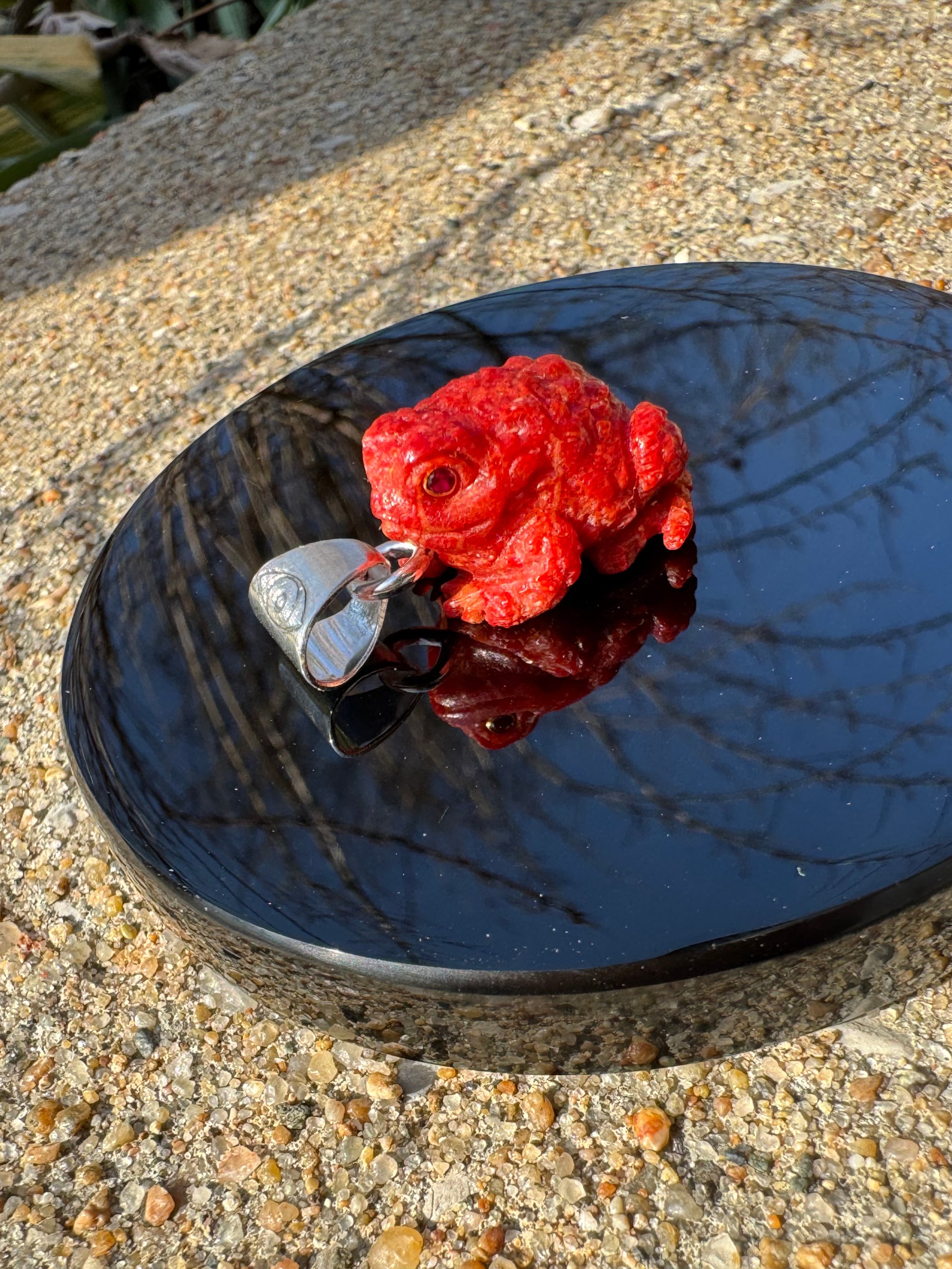 Red coral toad charm with synthetic ruby eyes. Set in Argentium silver. Measured approximately 1 1/4” x 3/4”