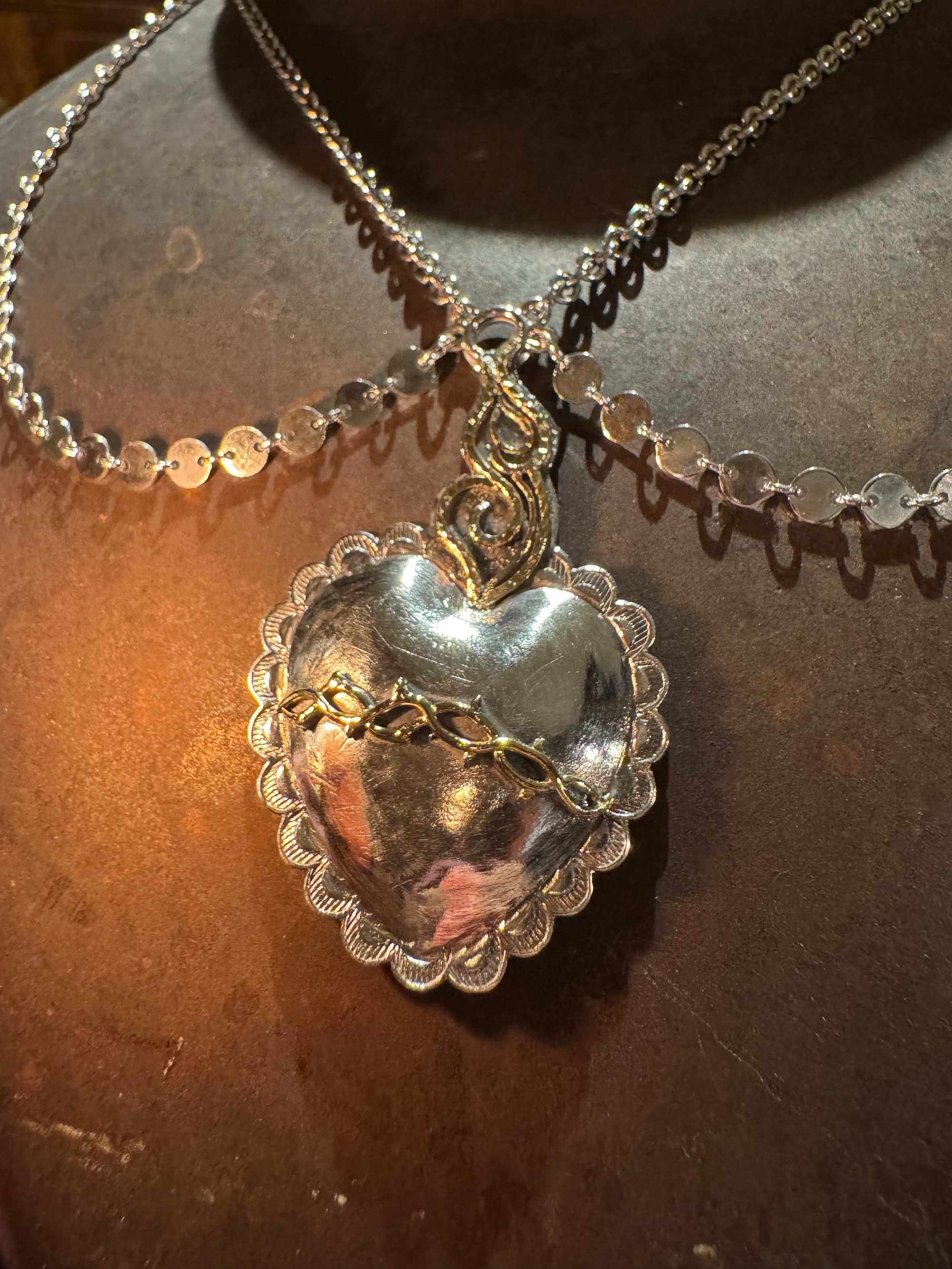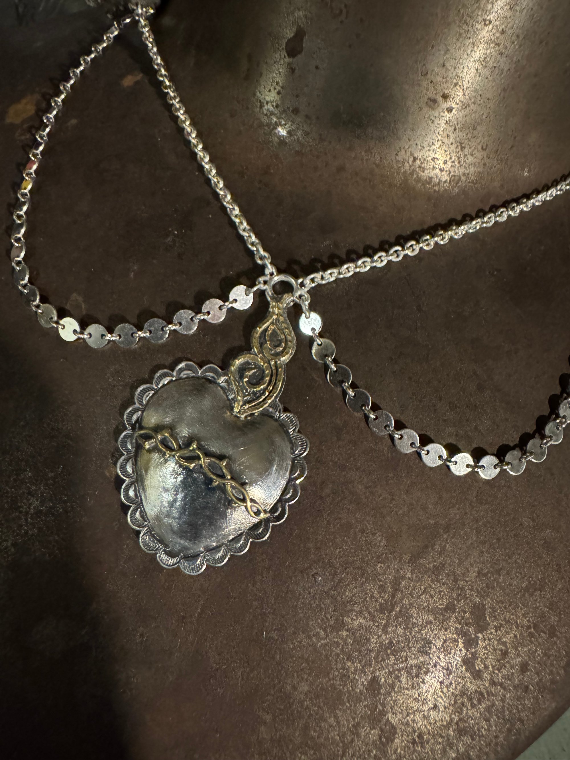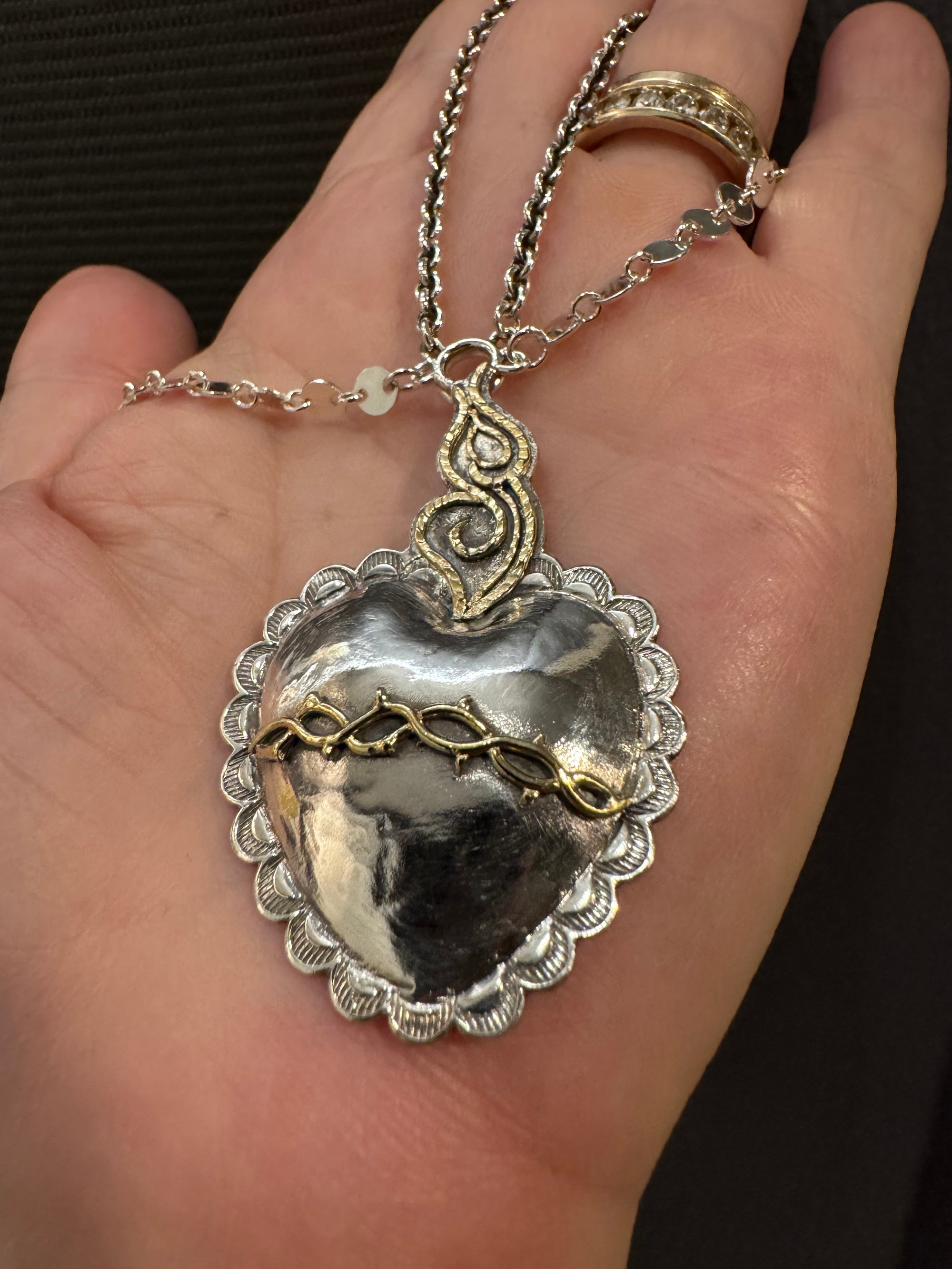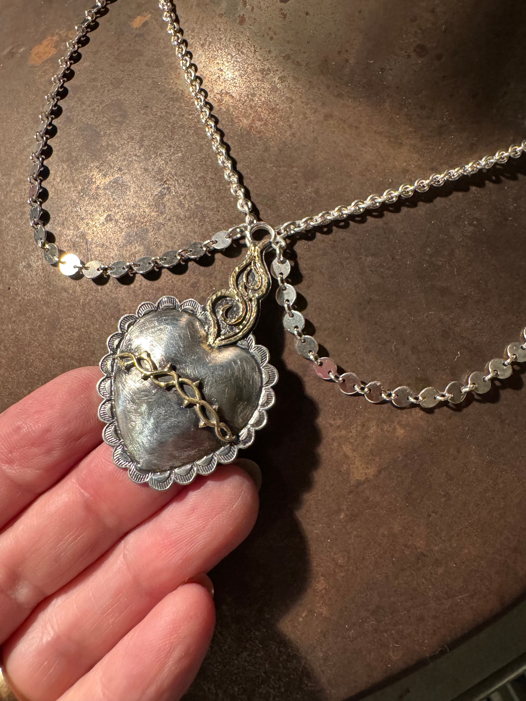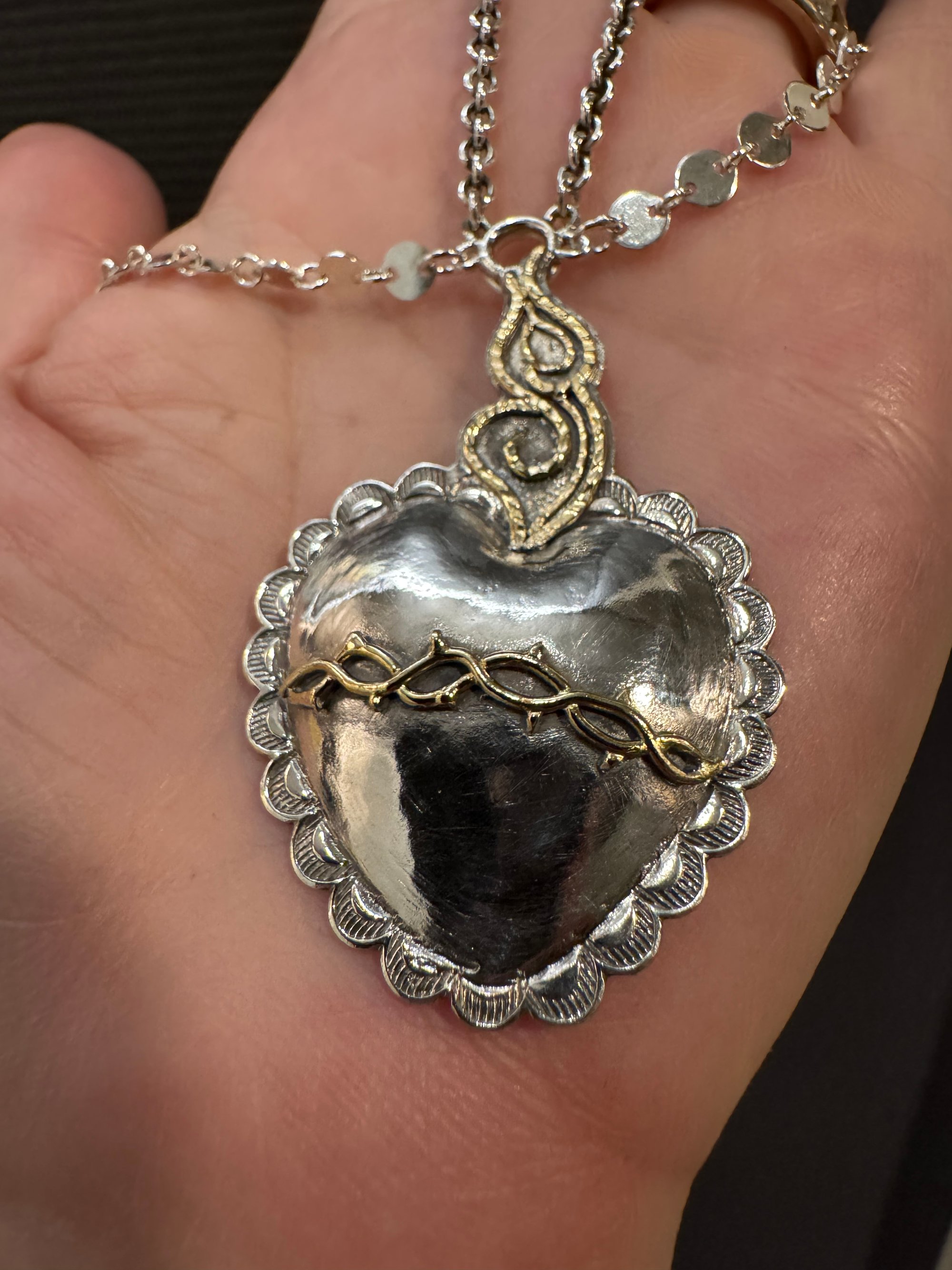 Fine silver, sterling silver, 22k gold. Hand fabricated sacred heart made with fine silver and 22k gold pendant measures 2”x 1.25”. Strung on Sterling silver chain adjustable at 17.5”-19.5” with lobster clasp.