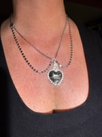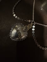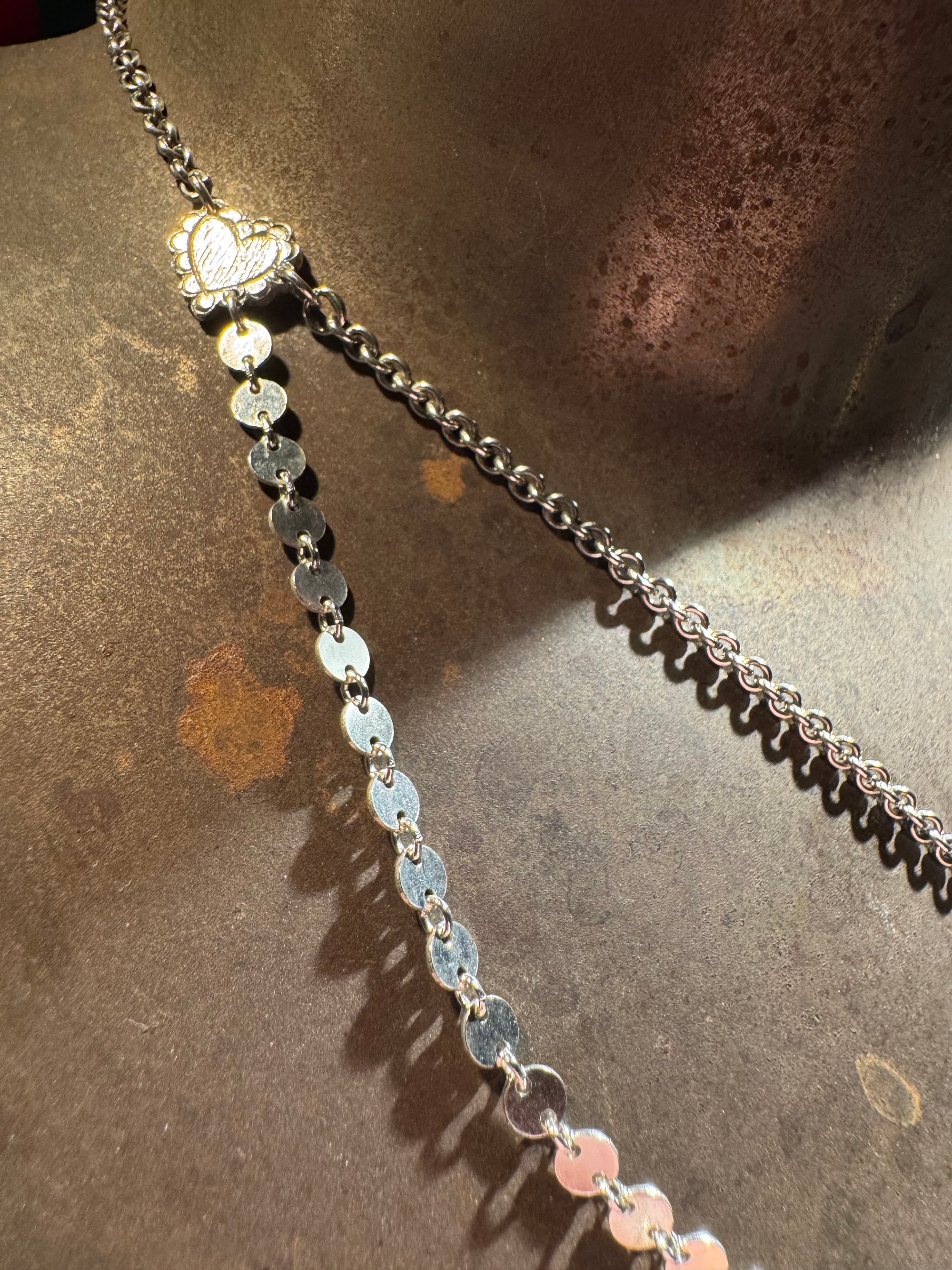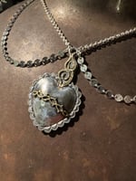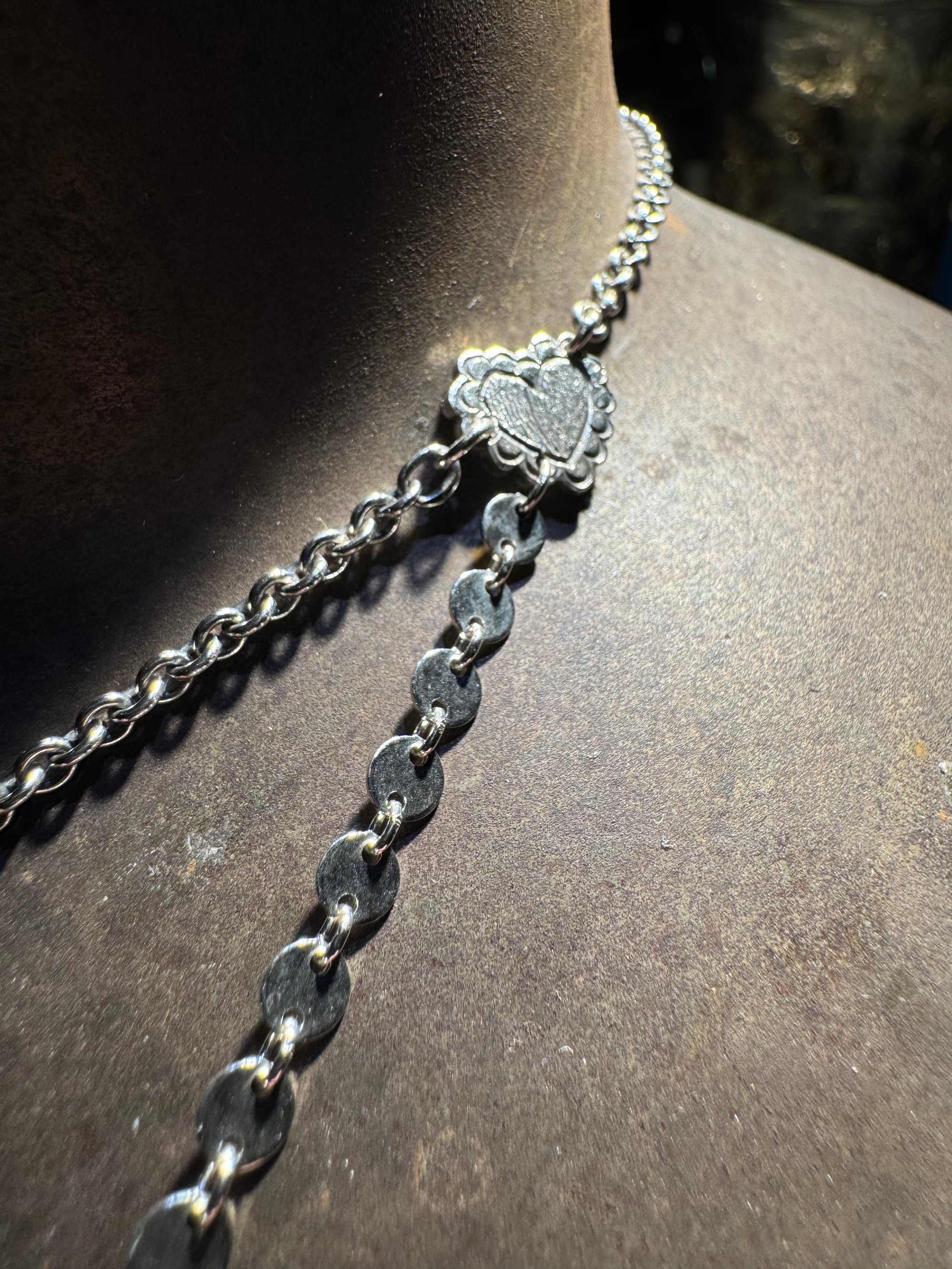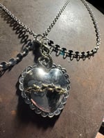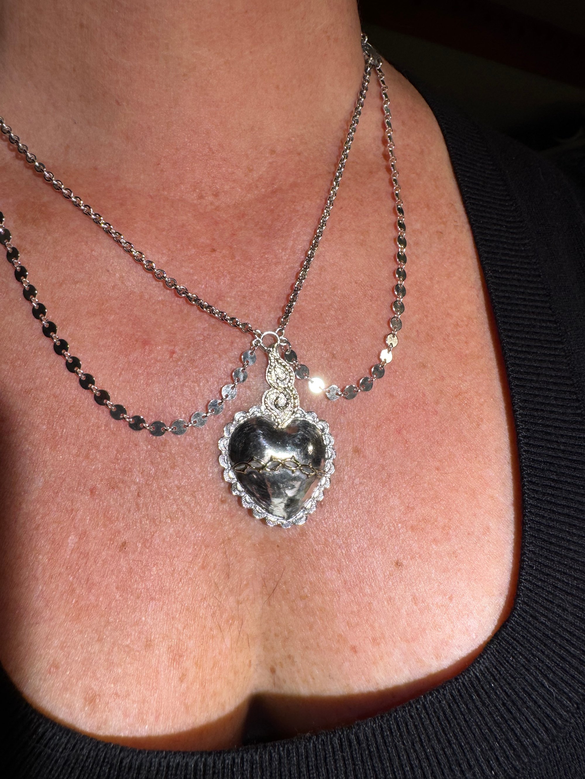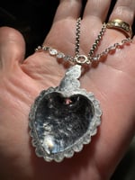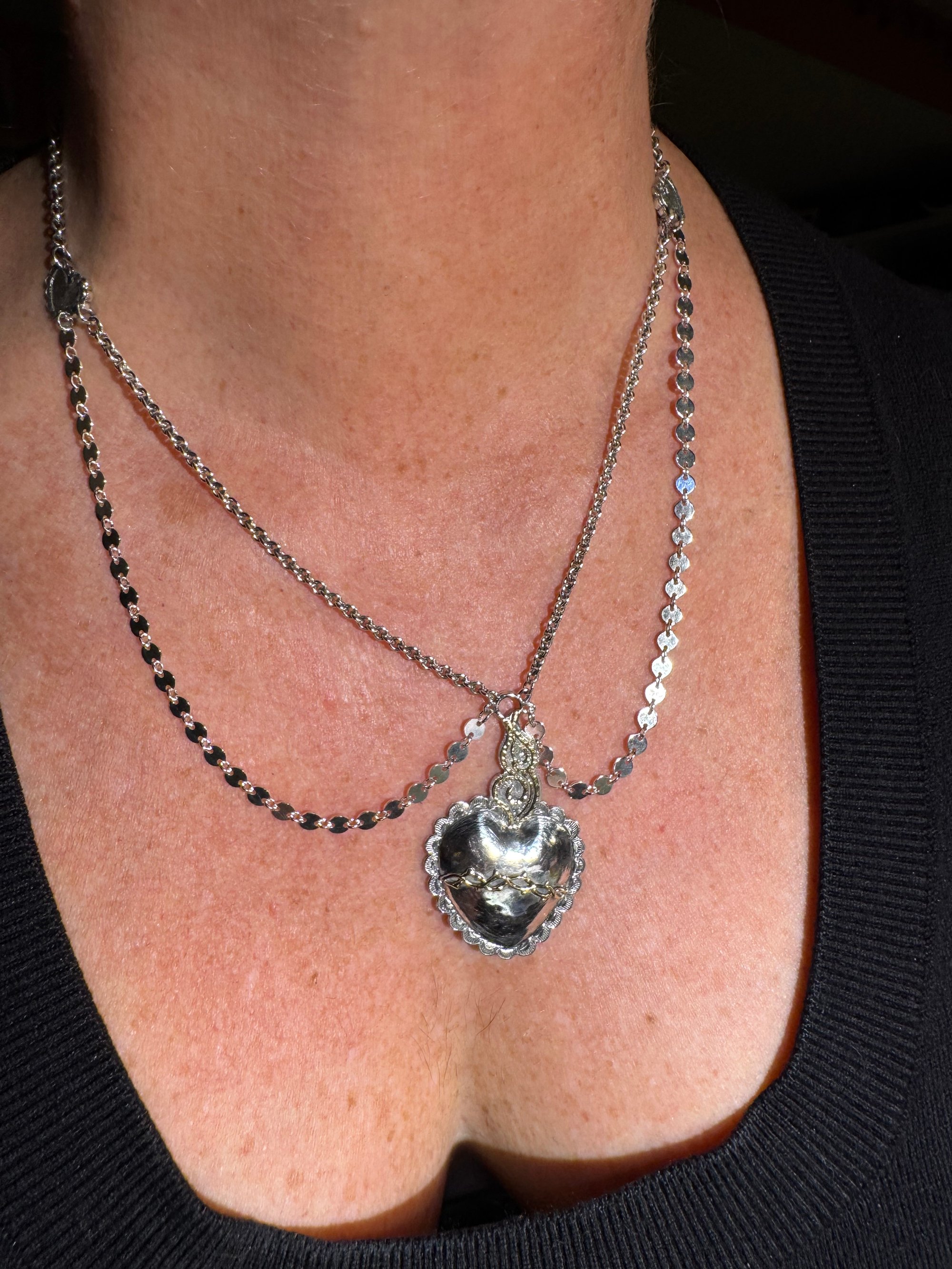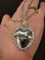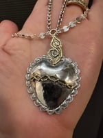 Fine silver, sterling silver, 22k gold. Hand fabricated sacred heart made with fine silver and 22k gold pendant measures 2”x 1.25”. Strung on Sterling silver chain adjustable at 17.5”-19.5” with lobster clasp.