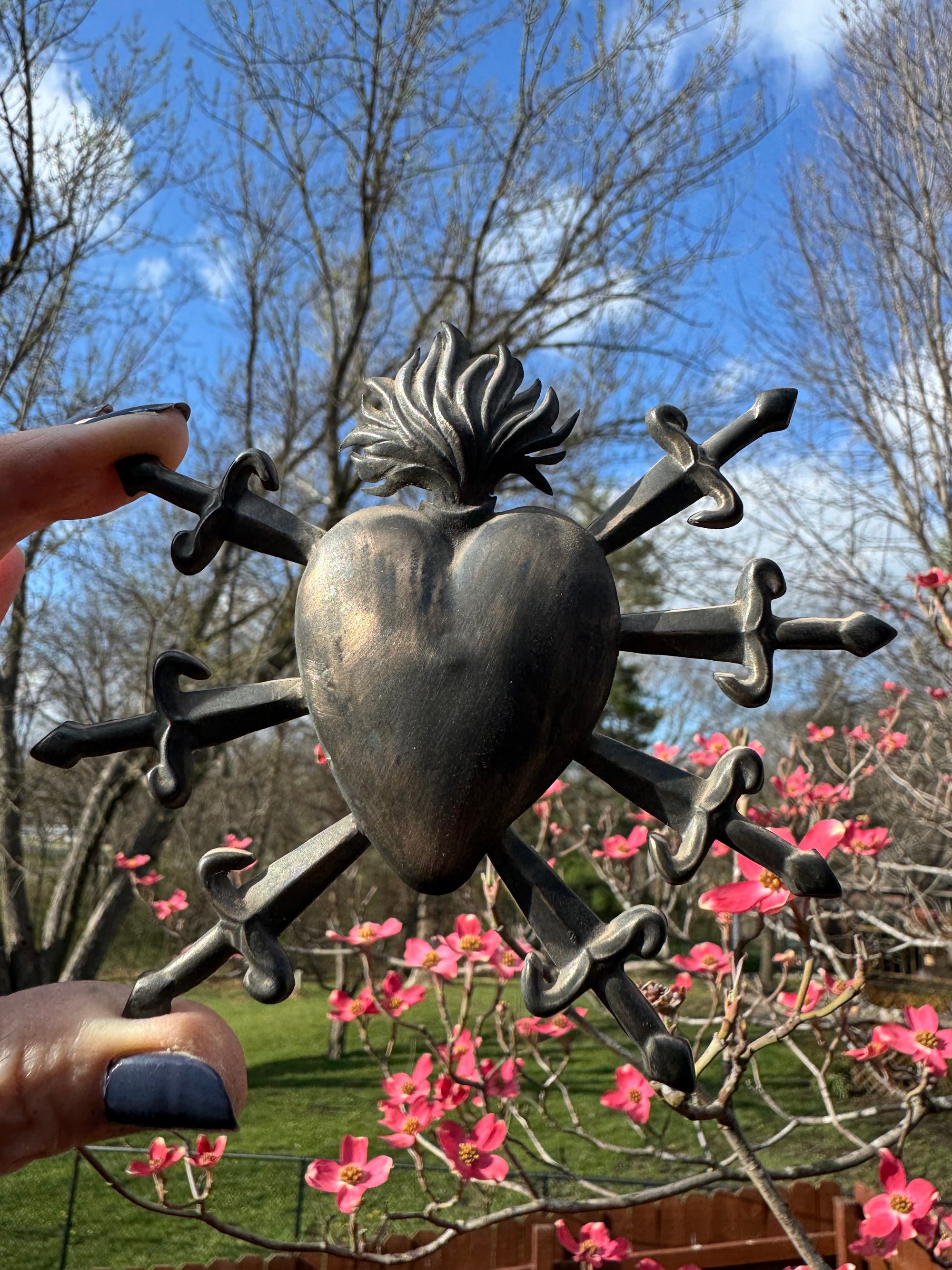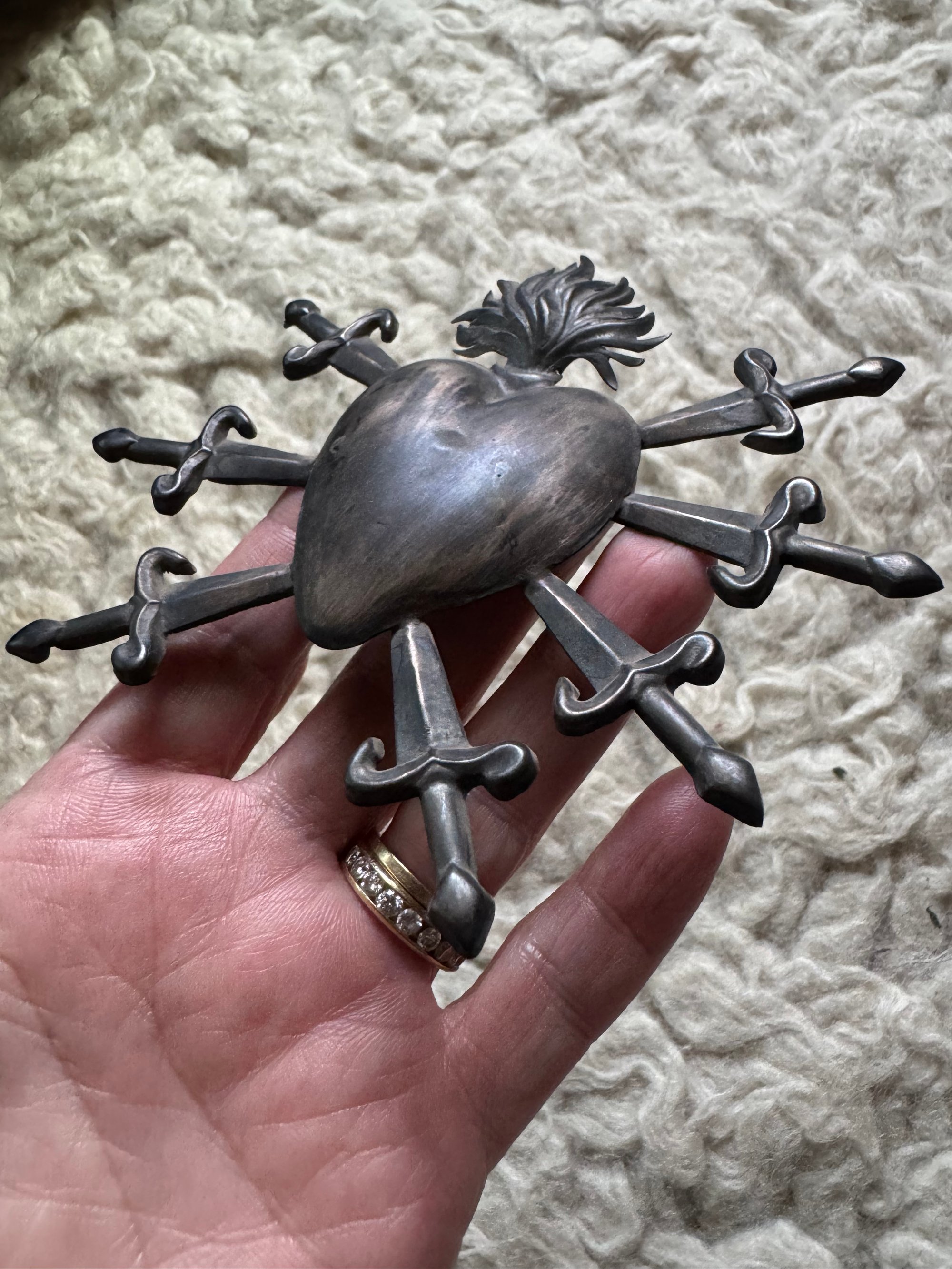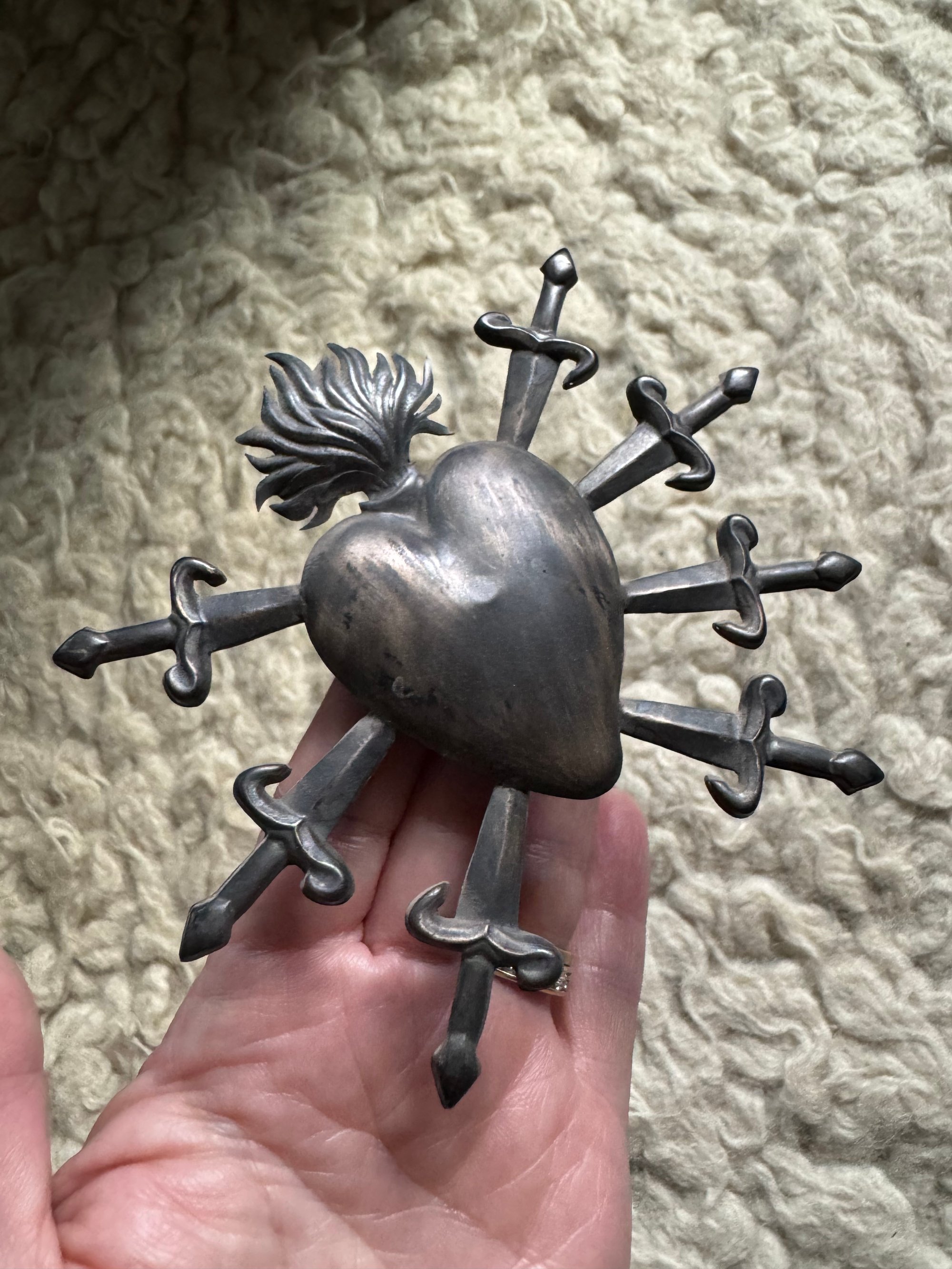 Vintage Italian silver ex voto with burning heart and seven swords. Purchased in Naples, Italy