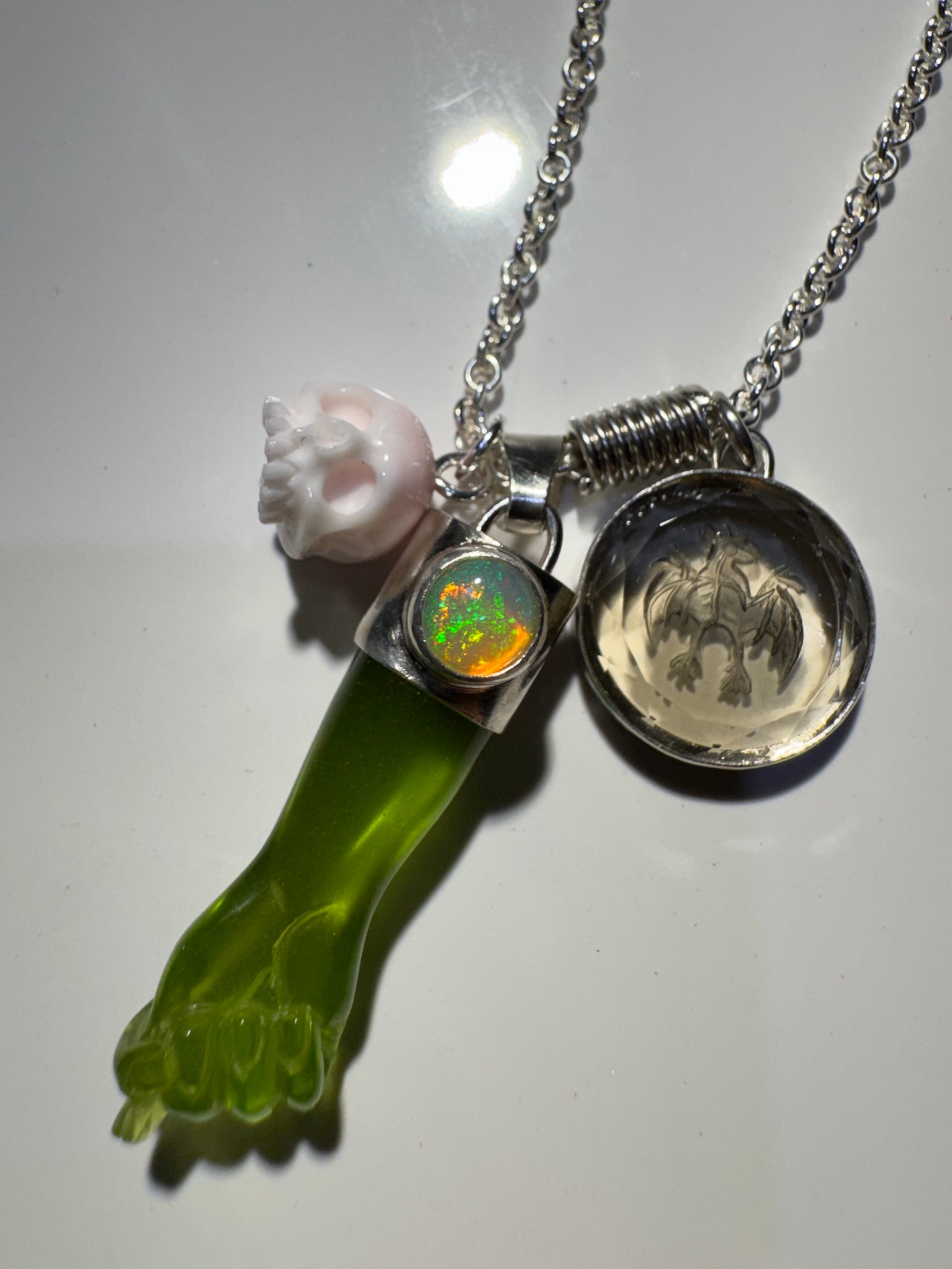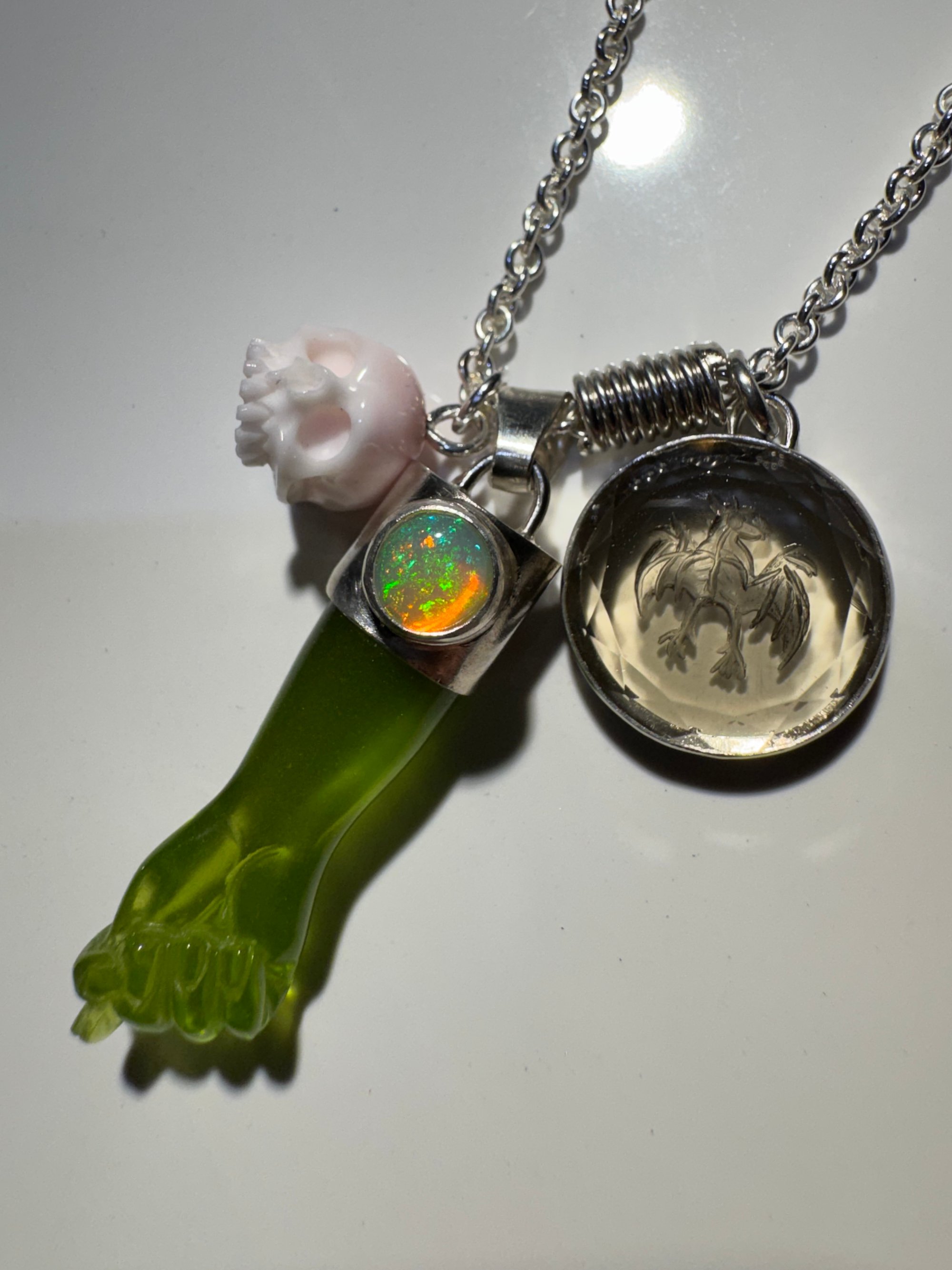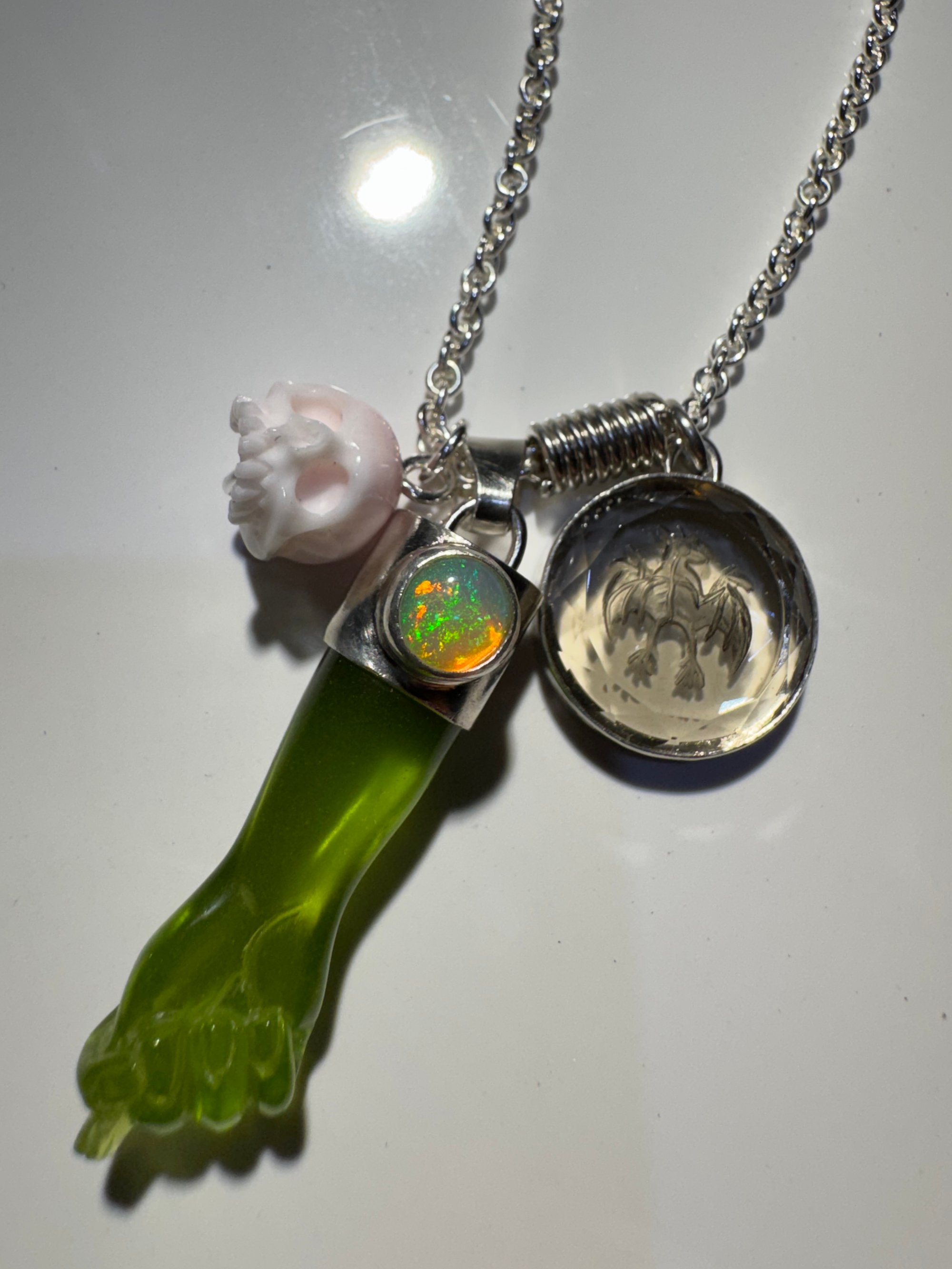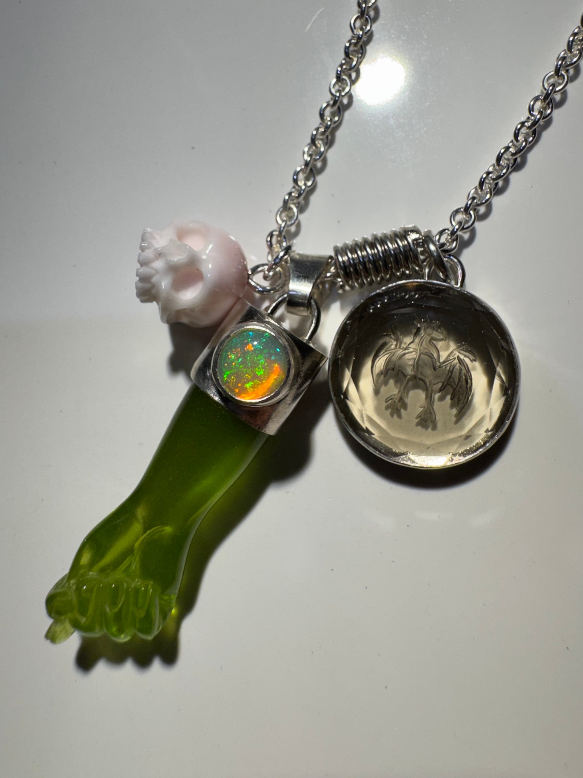 Green chalcedony mano figa with opal accent, smoky quartz intaglio dragon, coil, conch shell skull. Argentium and sterling silver. On 21” chain with lobster clasp.