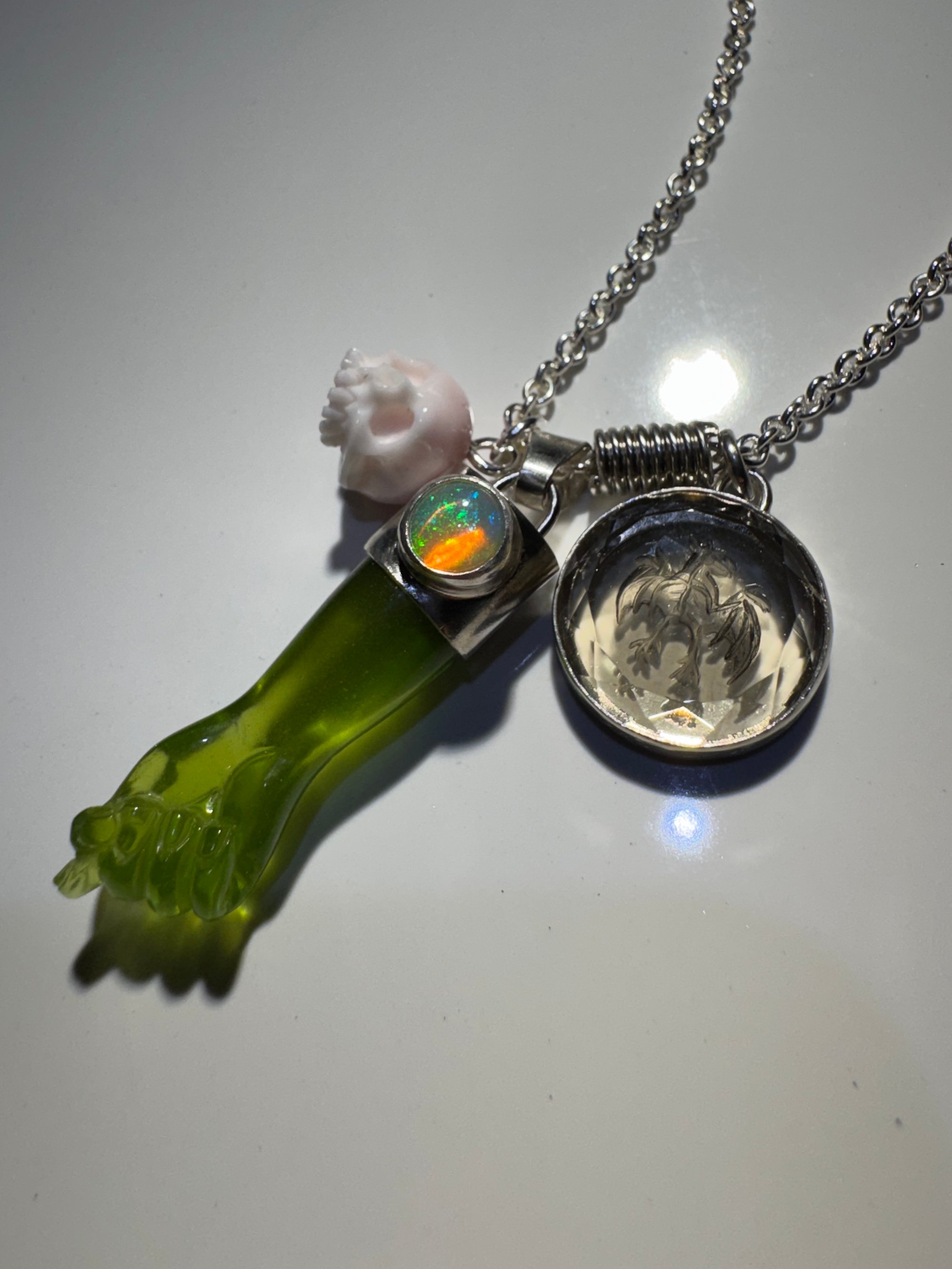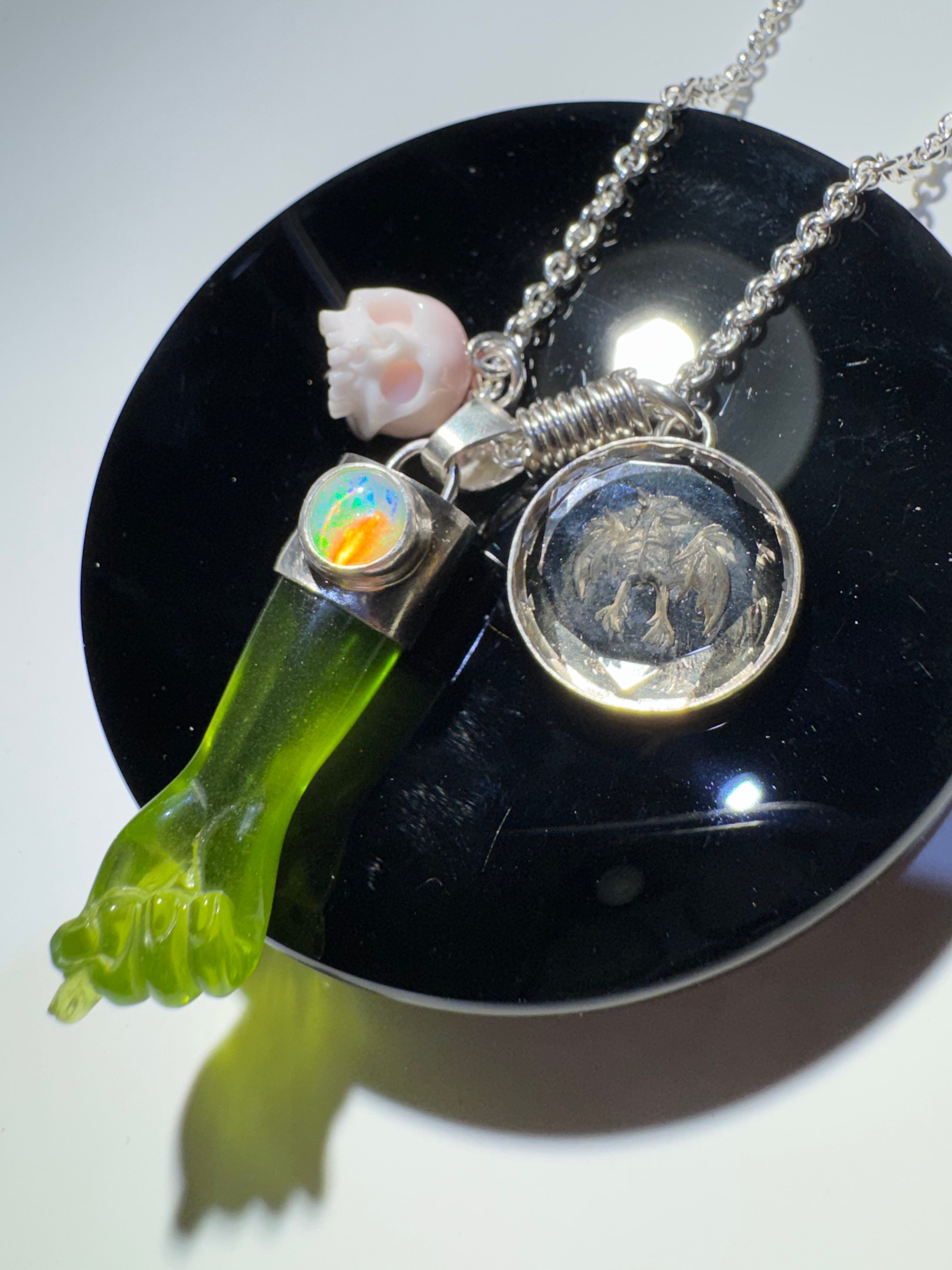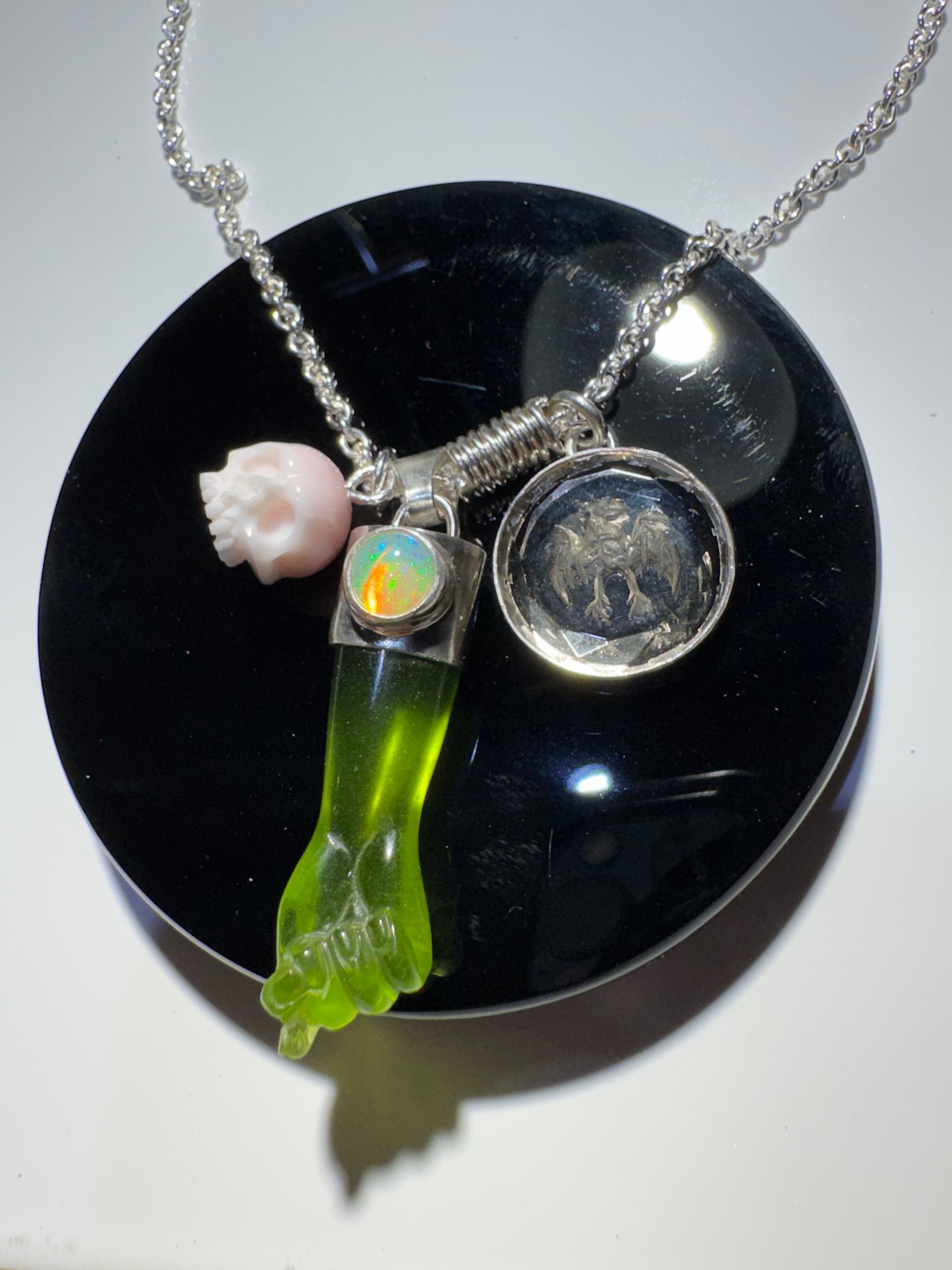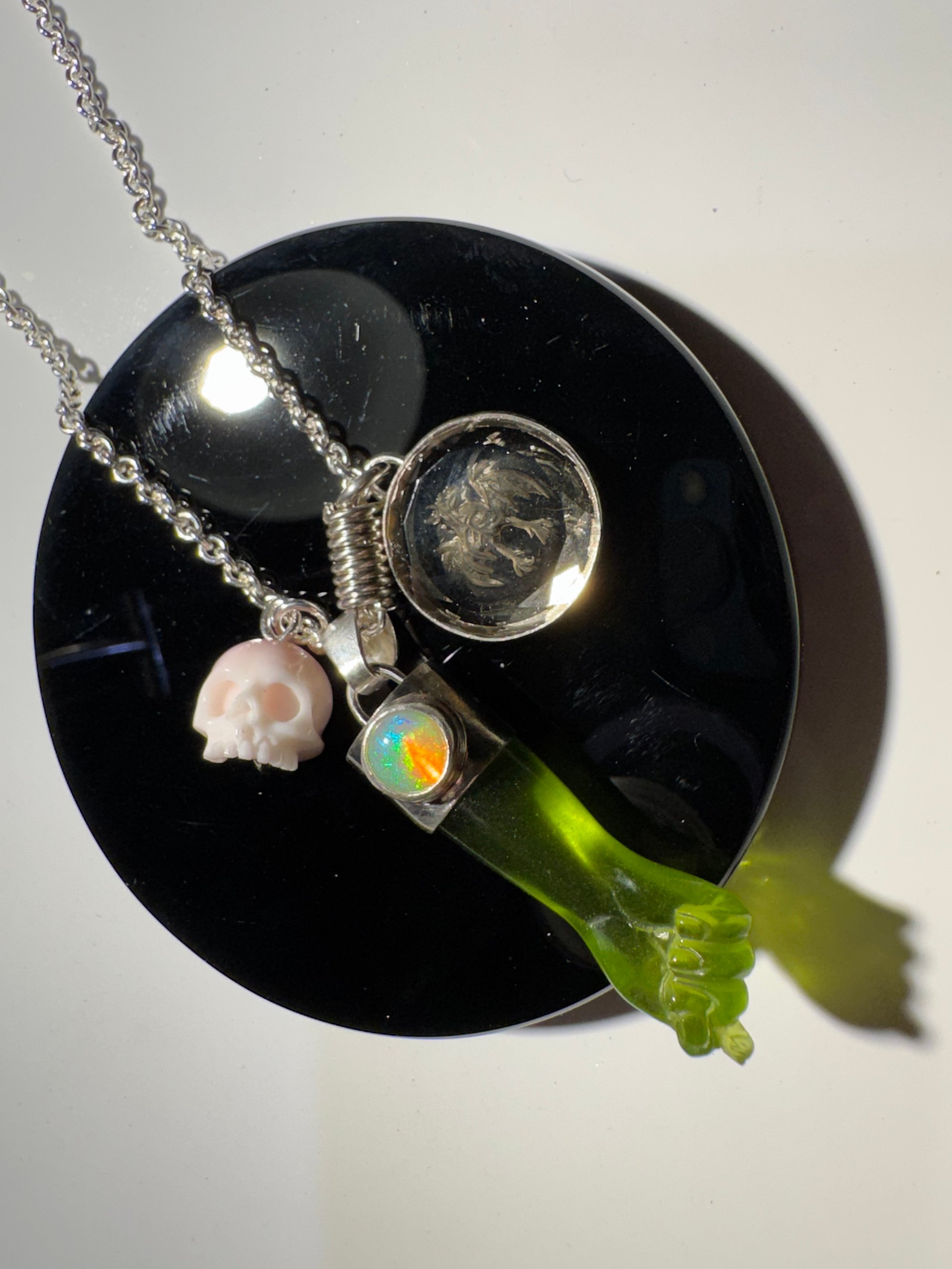 Green chalcedony mano figa with opal accent, smoky quartz intaglio dragon, coil, conch shell skull. Argentium and sterling silver. On 21” chain with lobster clasp.