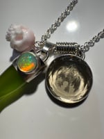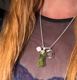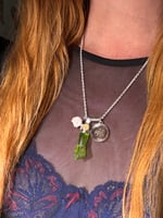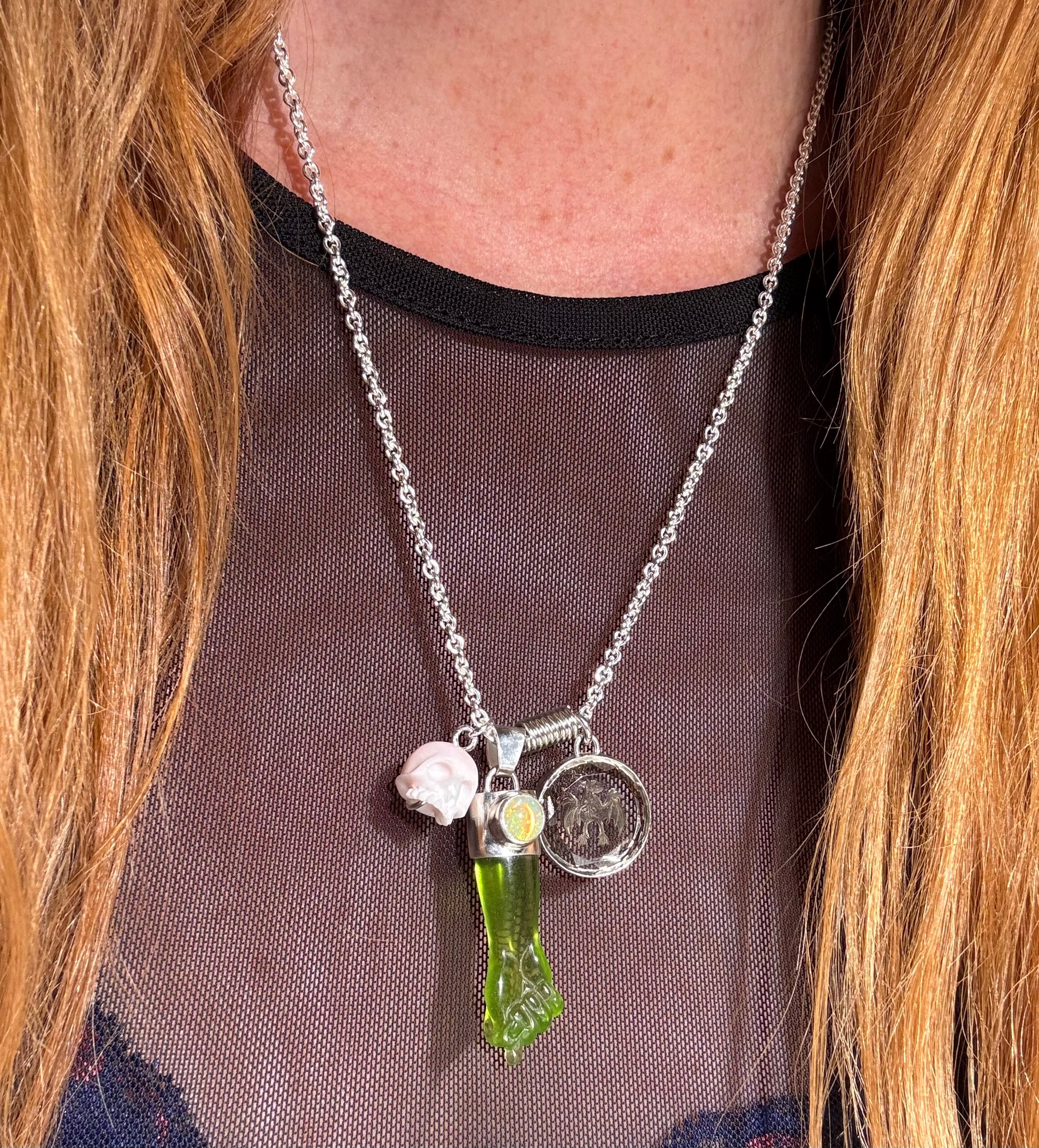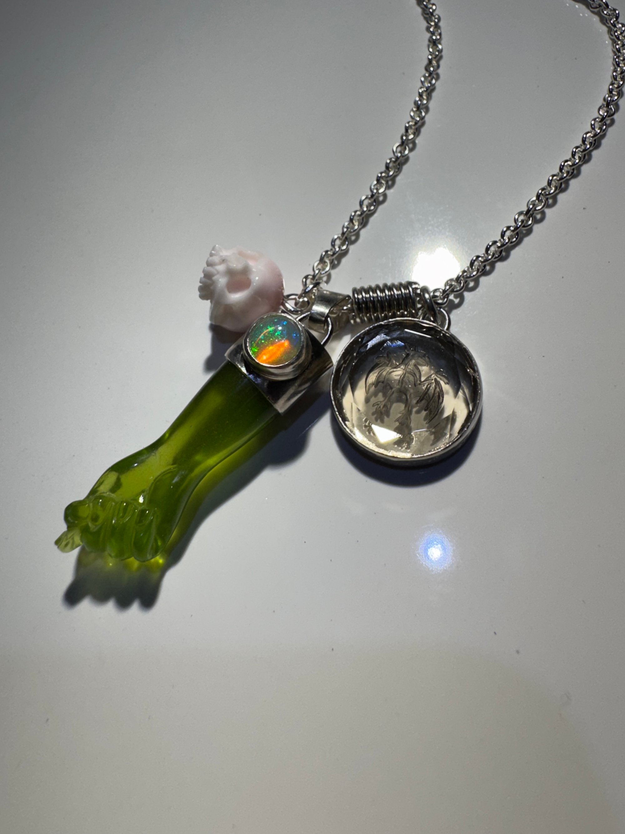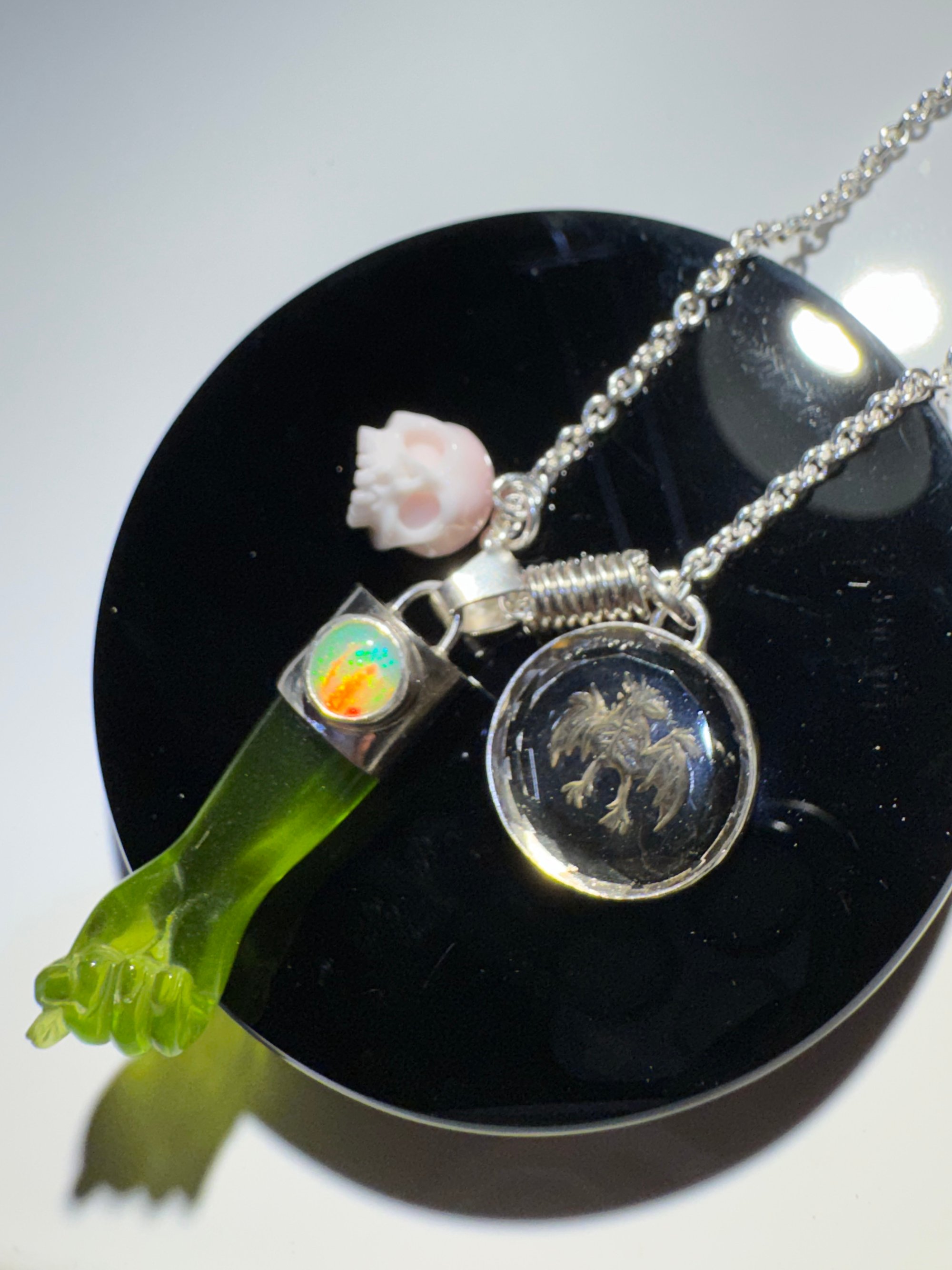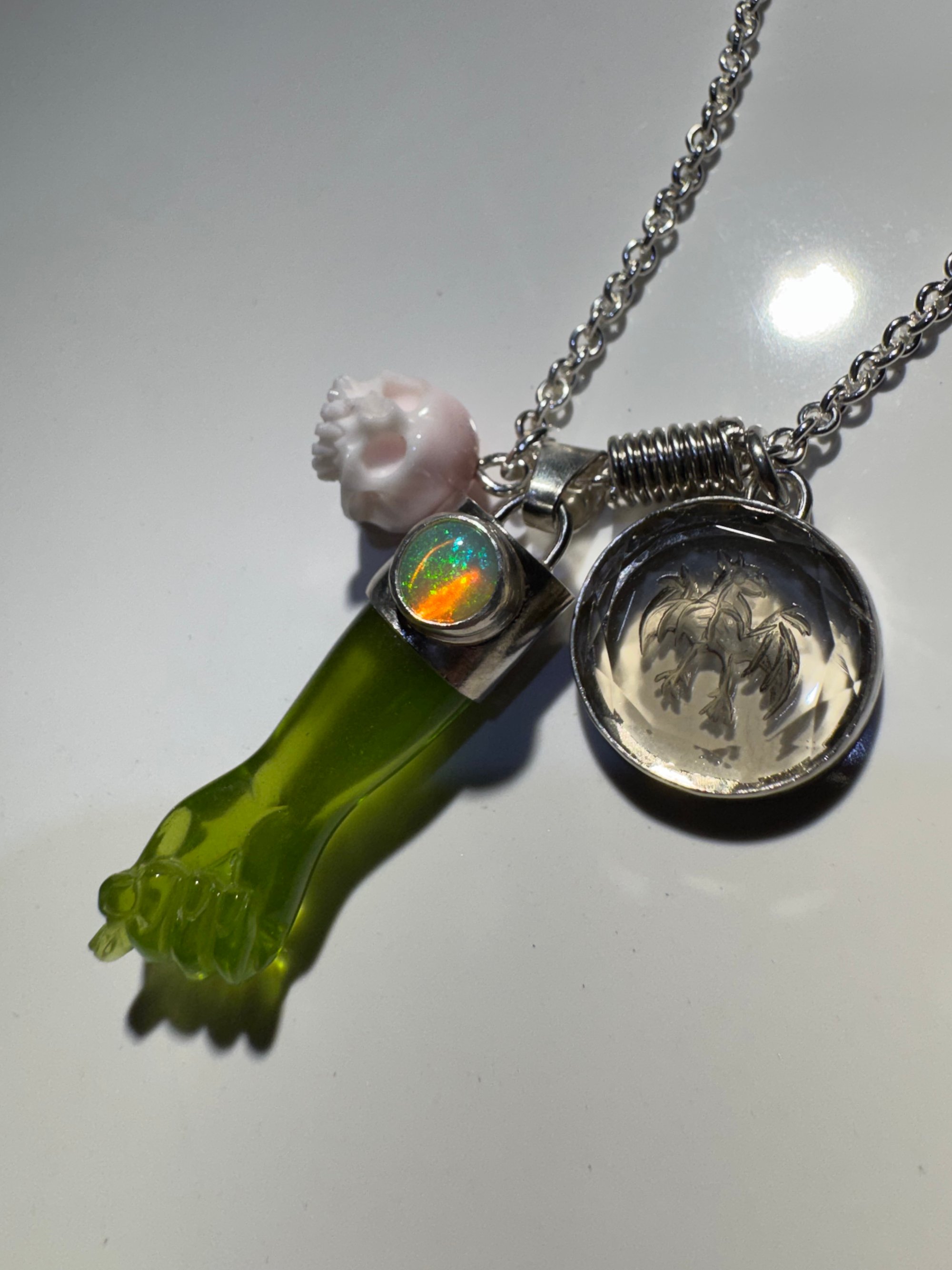 Green chalcedony mano figa with opal accent, smoky quartz intaglio dragon, coil, conch shell skull. Argentium and sterling silver. On 21” chain with lobster clasp.