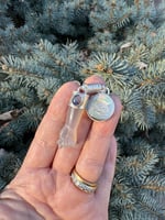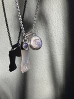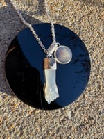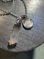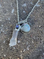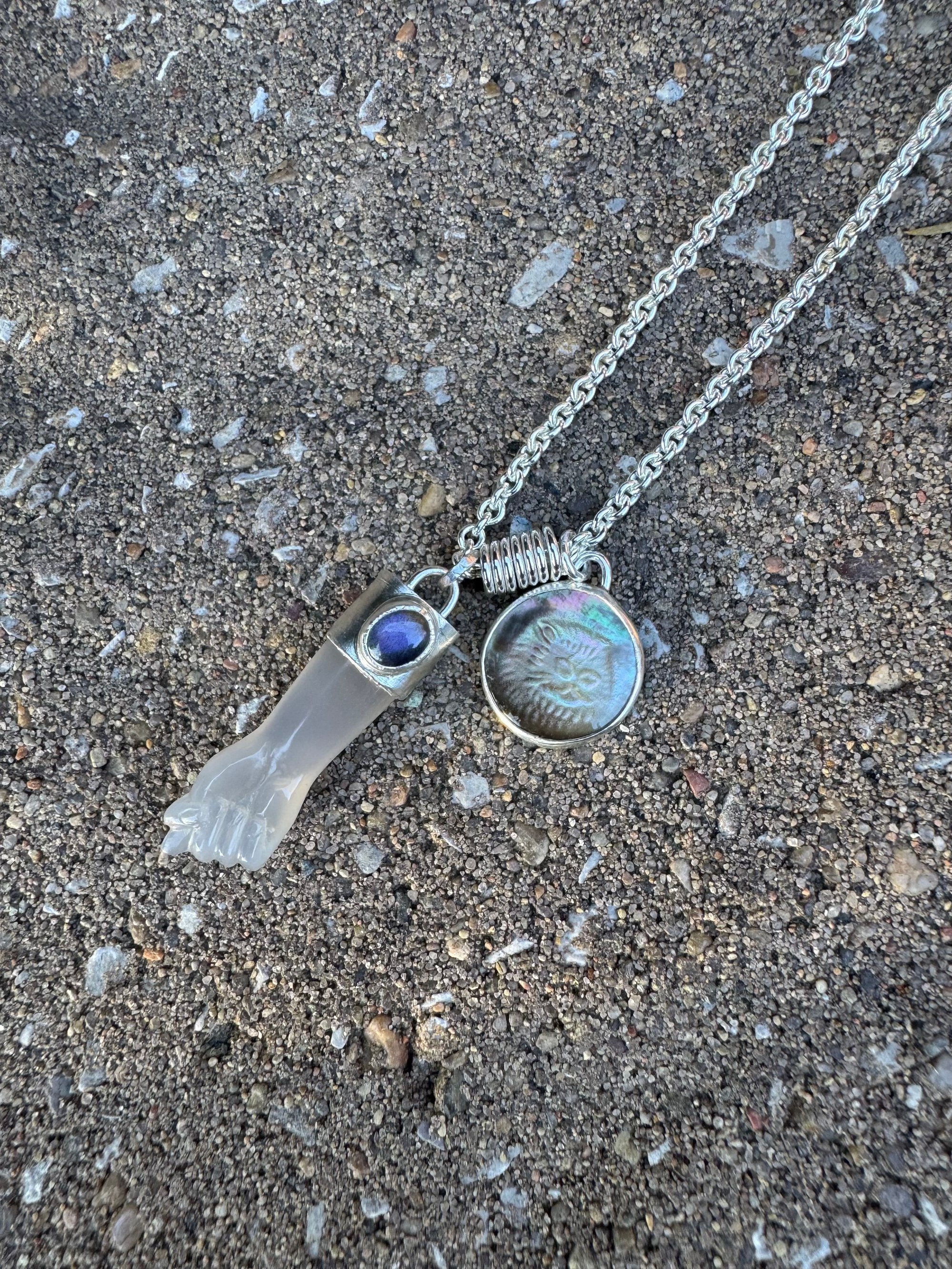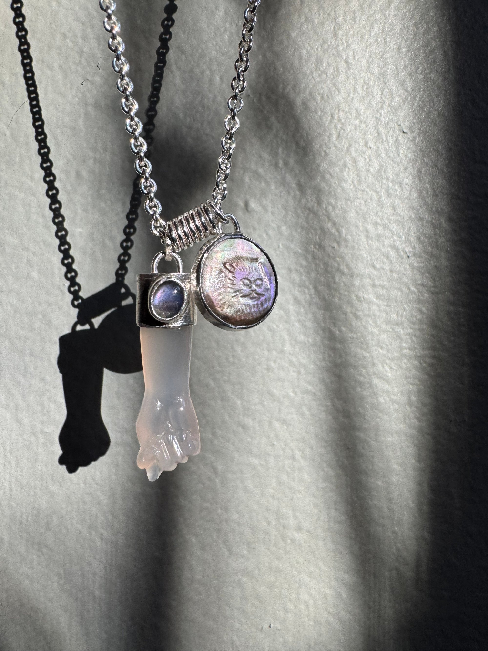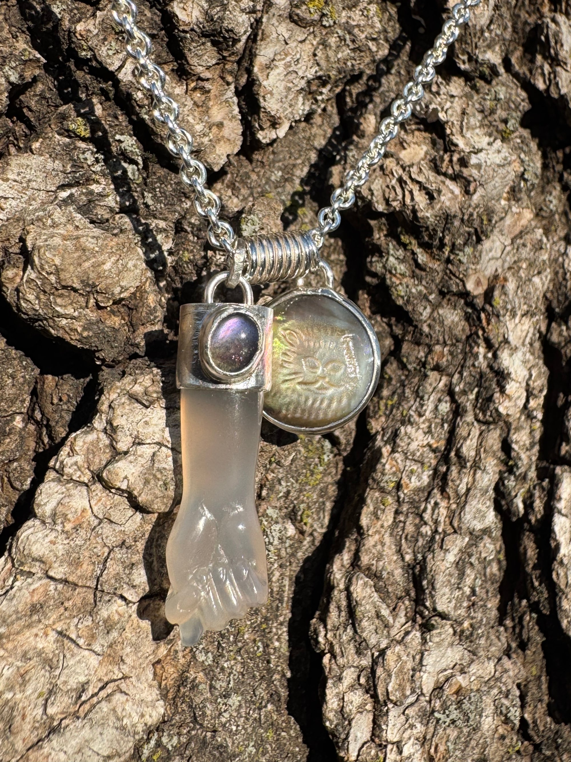 White chalcedony mano figa with glowing labradorite accent and mother of pearl cat cameo. Sterling and argentium silver. Hangs on 21” chain with lobster clasp. Mano figa symbolism has been around for over 2500 years. Translating as “fig hand”, the gesture is used for protection and is said to ward off the evil eye. Its resemblance to genitalia is supposed to catch bad spirits off guard, and get them to leave you alone. The cat symbolizes mystery, independence, magic, and cleverness. The coil is a symbol of transformation and a bridge between this world and the beyond. Together these things form a talisman to carry you through the ages.