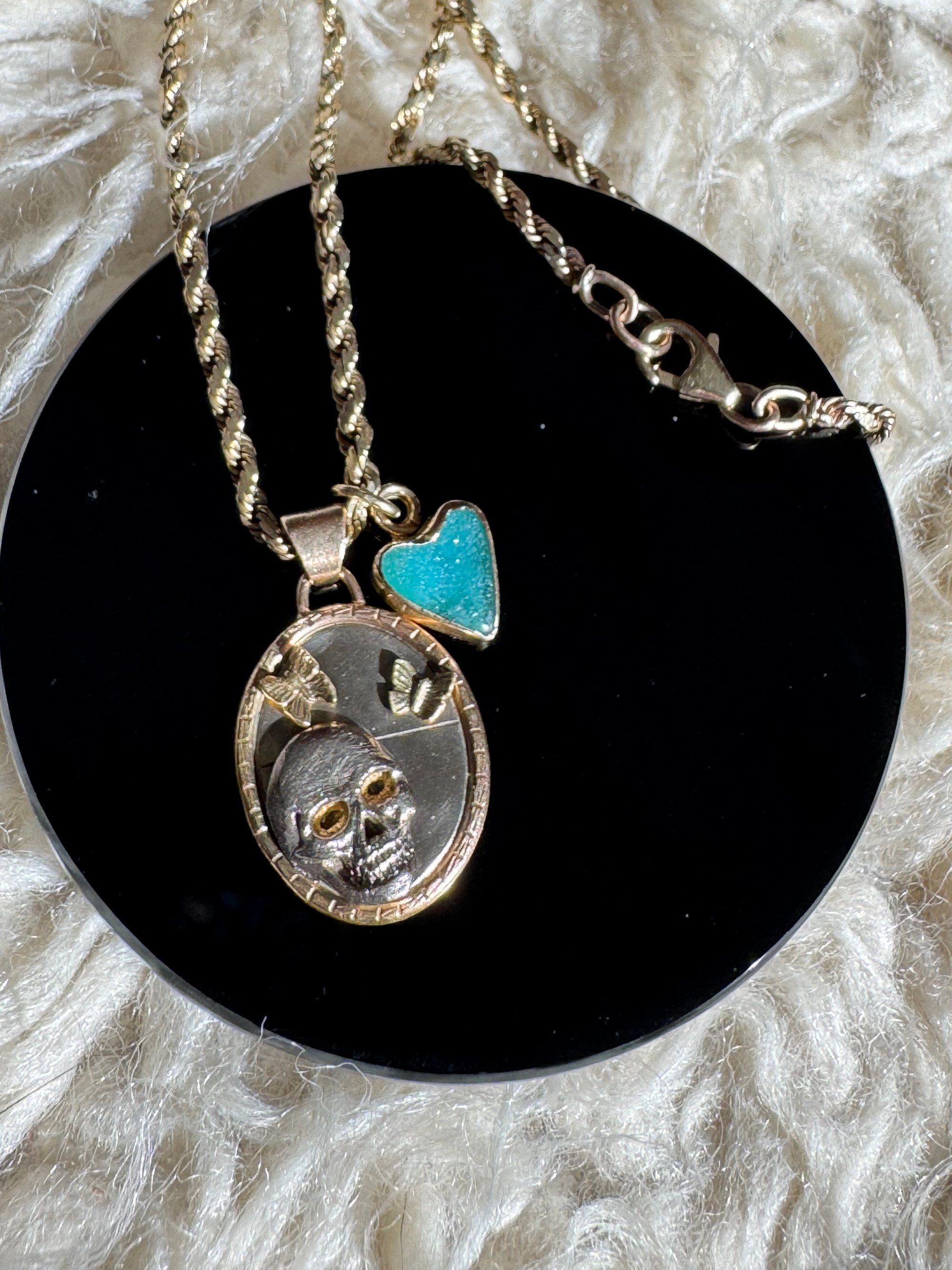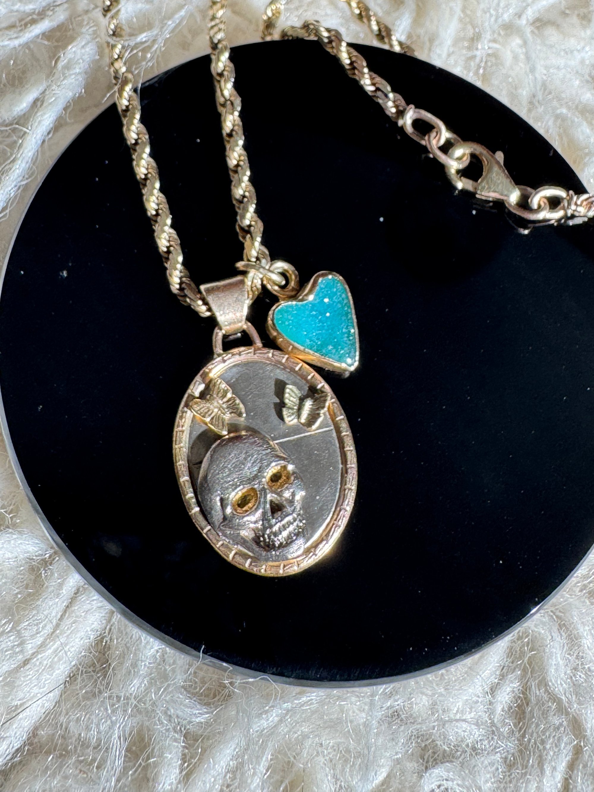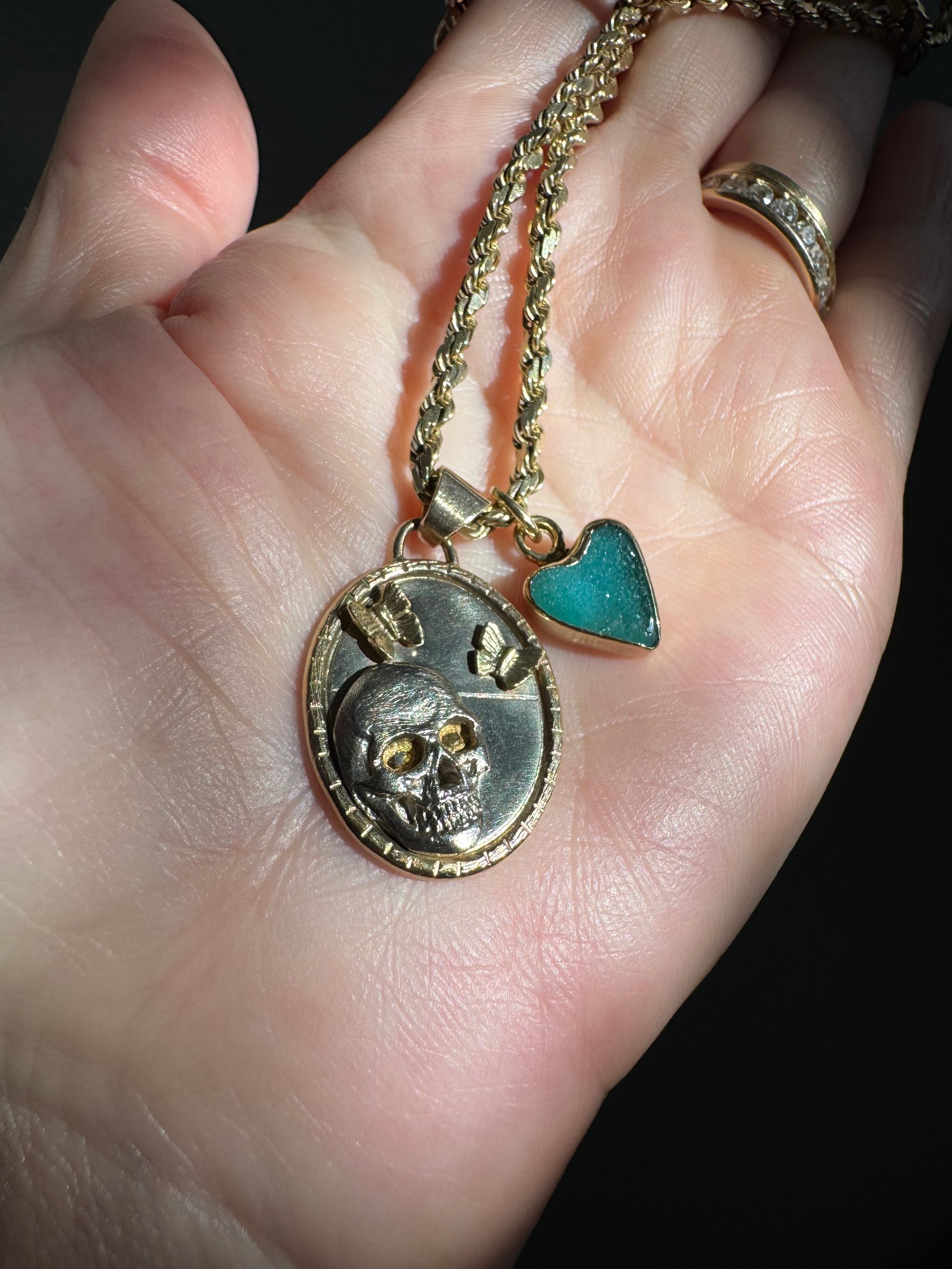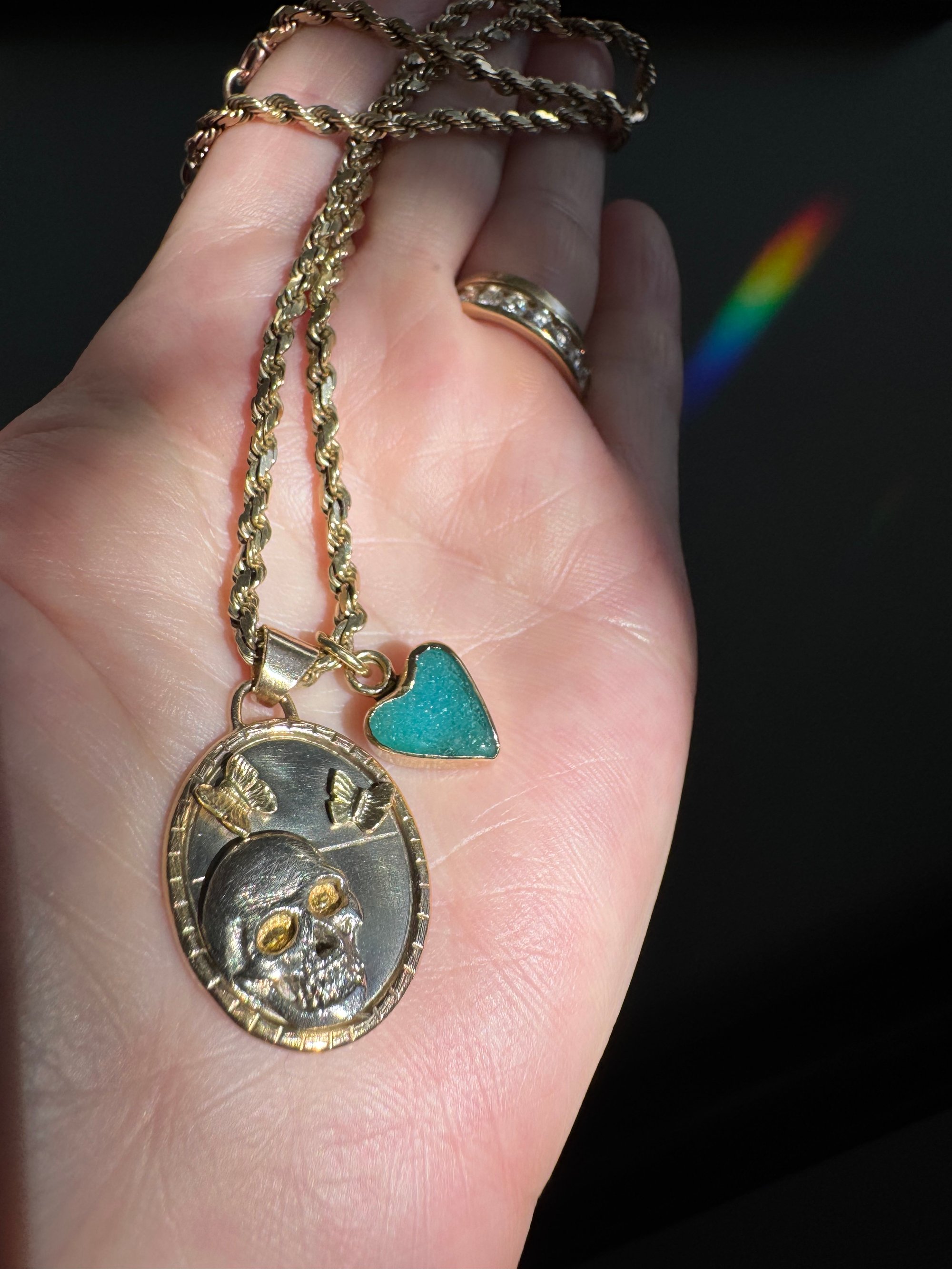 Hand fabricated 14k palladium alloy white gold with 14k and 24k yellow gold, sapphires, and Inspiration Mine gem silica drusy (heart charm by Tessa Rand). I’ve been wearing this necklace for over two years, and I love it. I got an offer I couldn’t refuse for it, so now I am passing it on to a new life and caretaker. I carved the skull from a chunk of white gold and spent months nit picking it to perfection. This necklace has traveled all over the world with me and is full of experiences. Xx