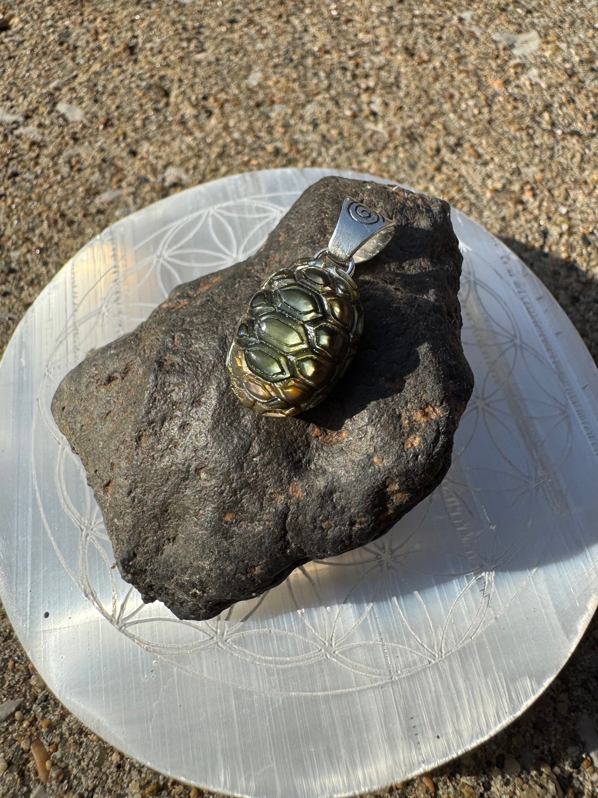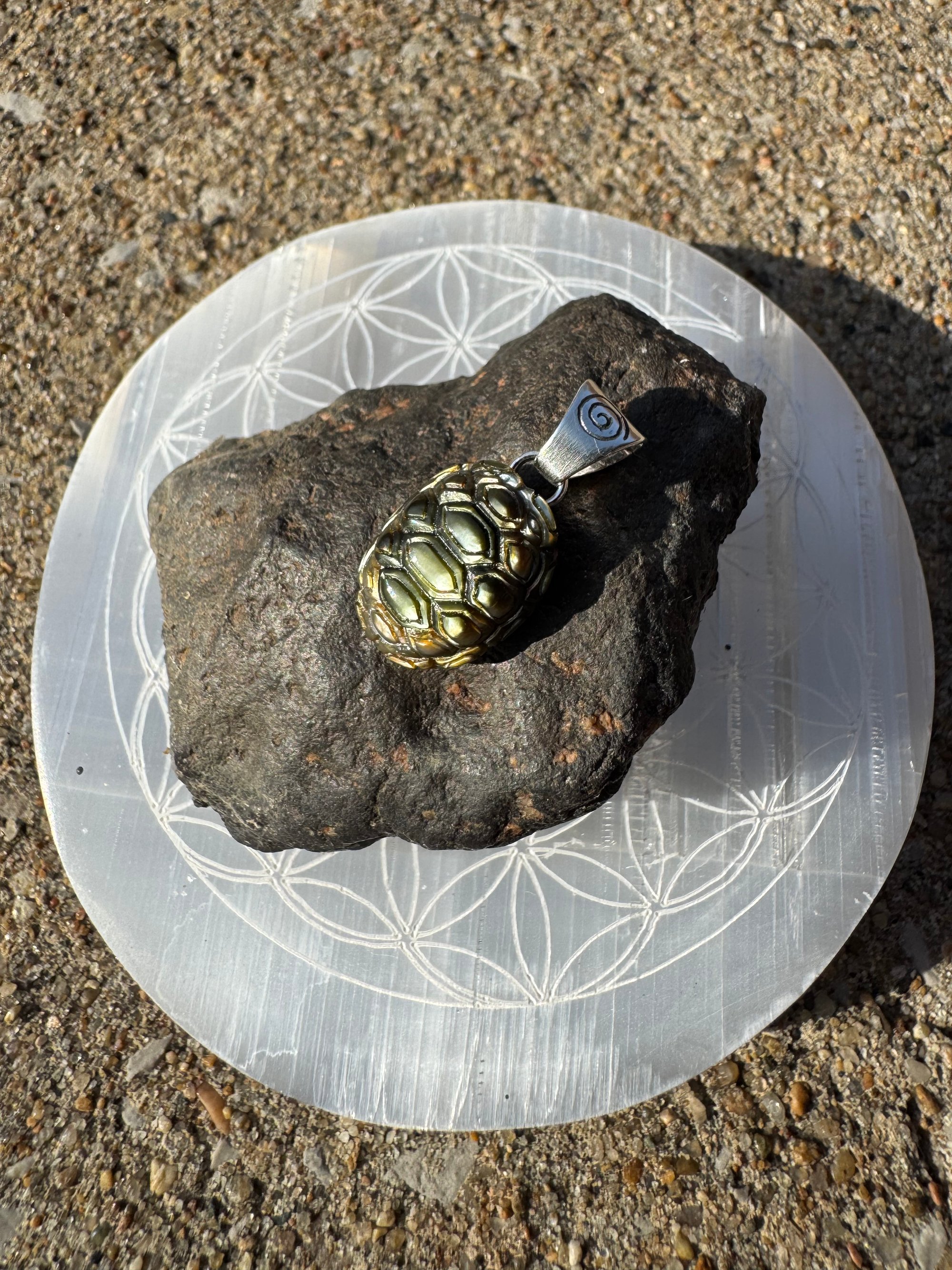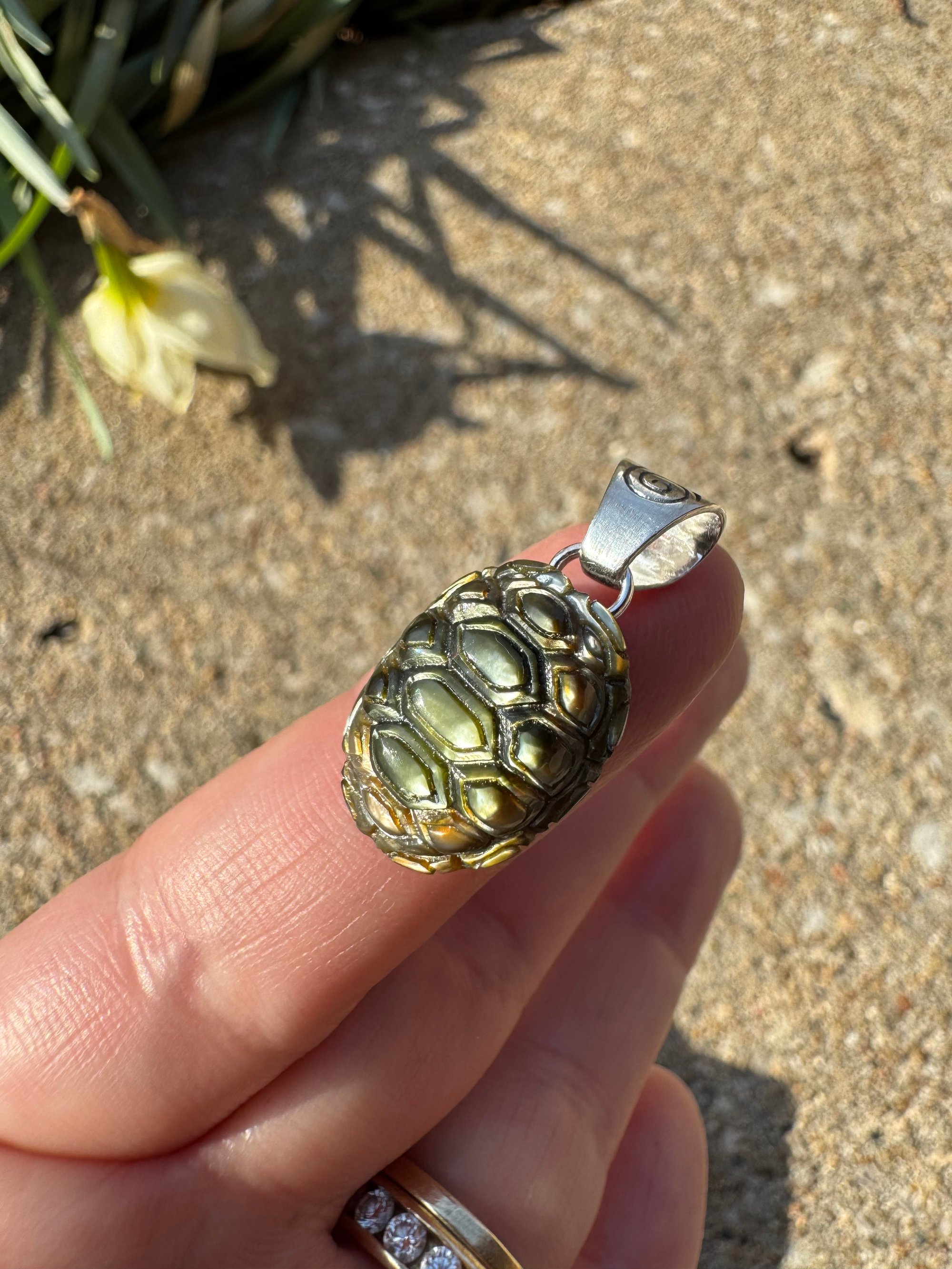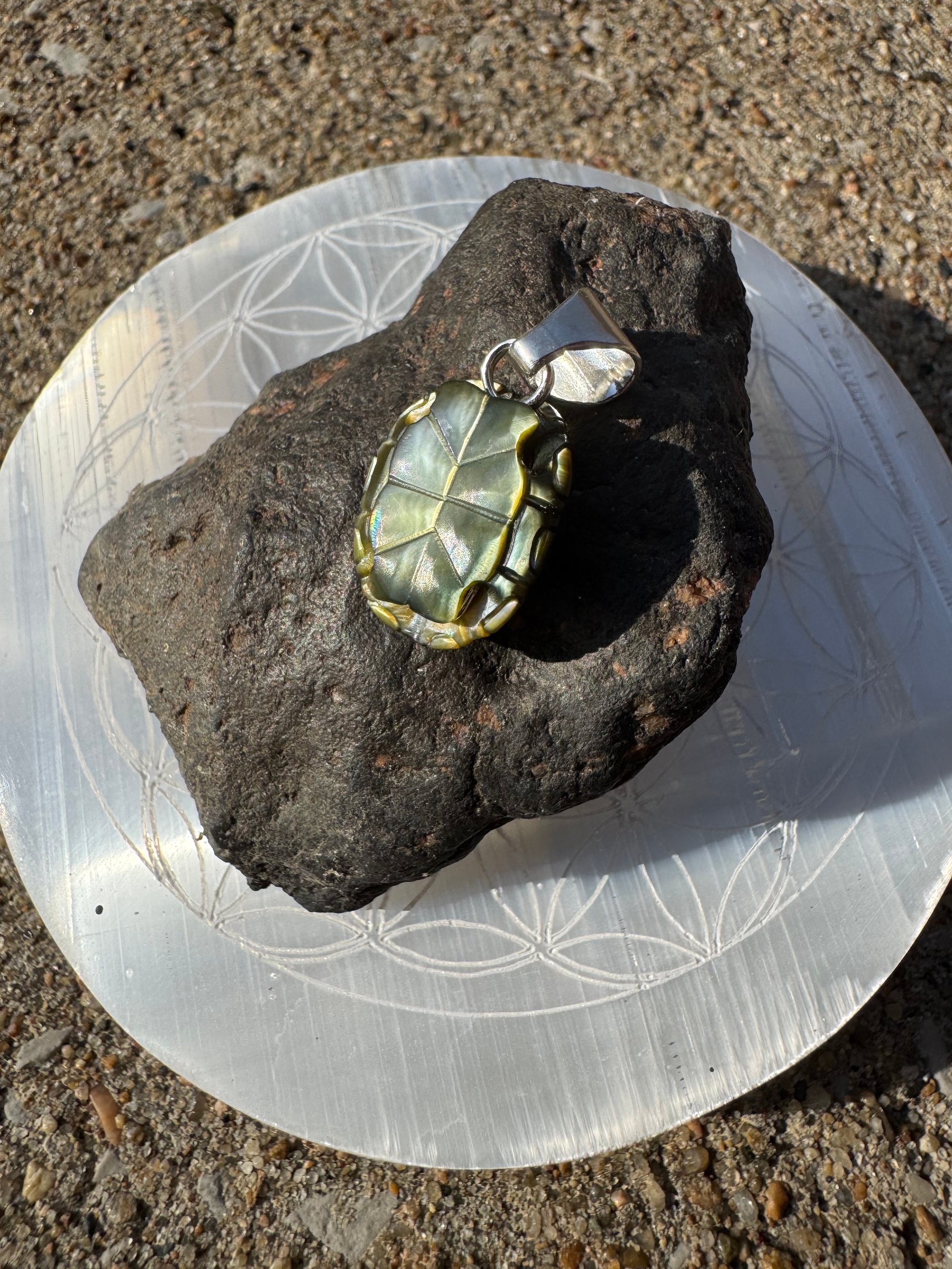 Mother of pearl turtle shell charm set in Argentium silver. Measures approximately 1” x 1/2”