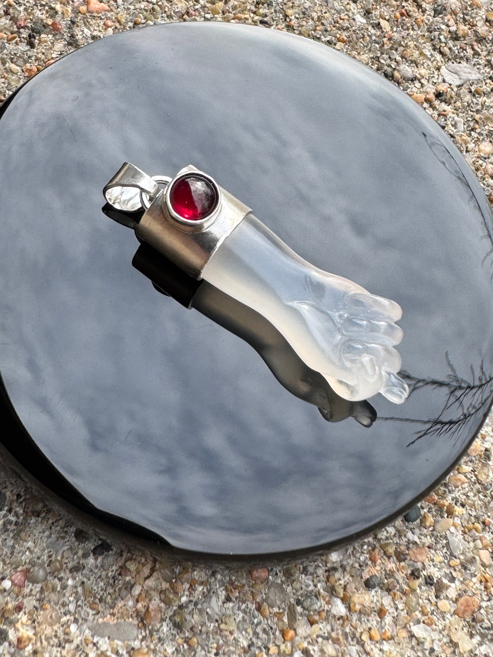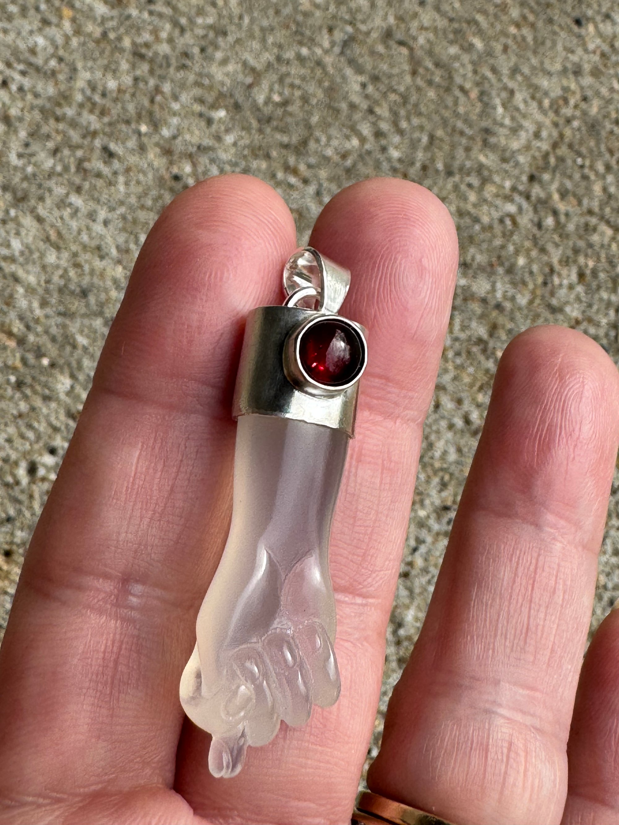 White chalcedony mano figa with garnet accent. Set in Argentium silver. Measured approximately 1 7/8” x 1/2”