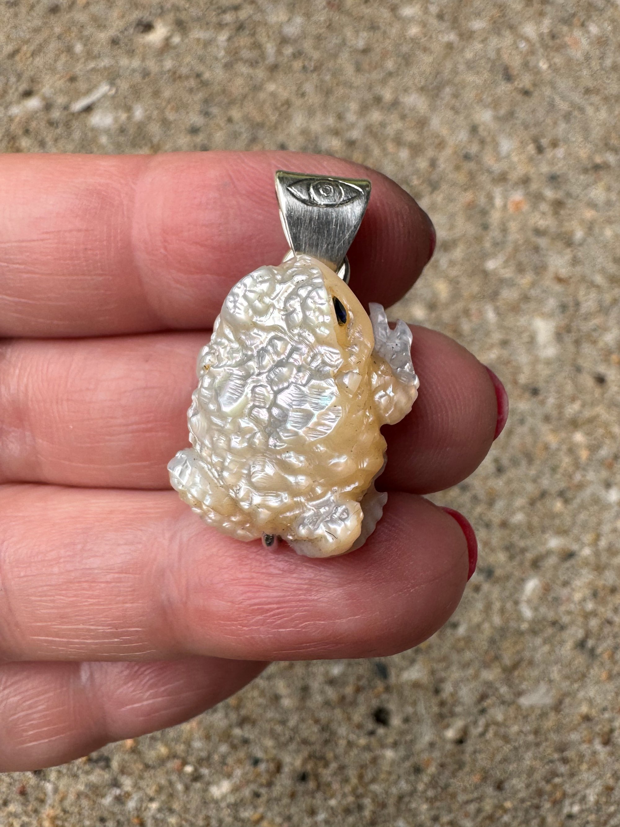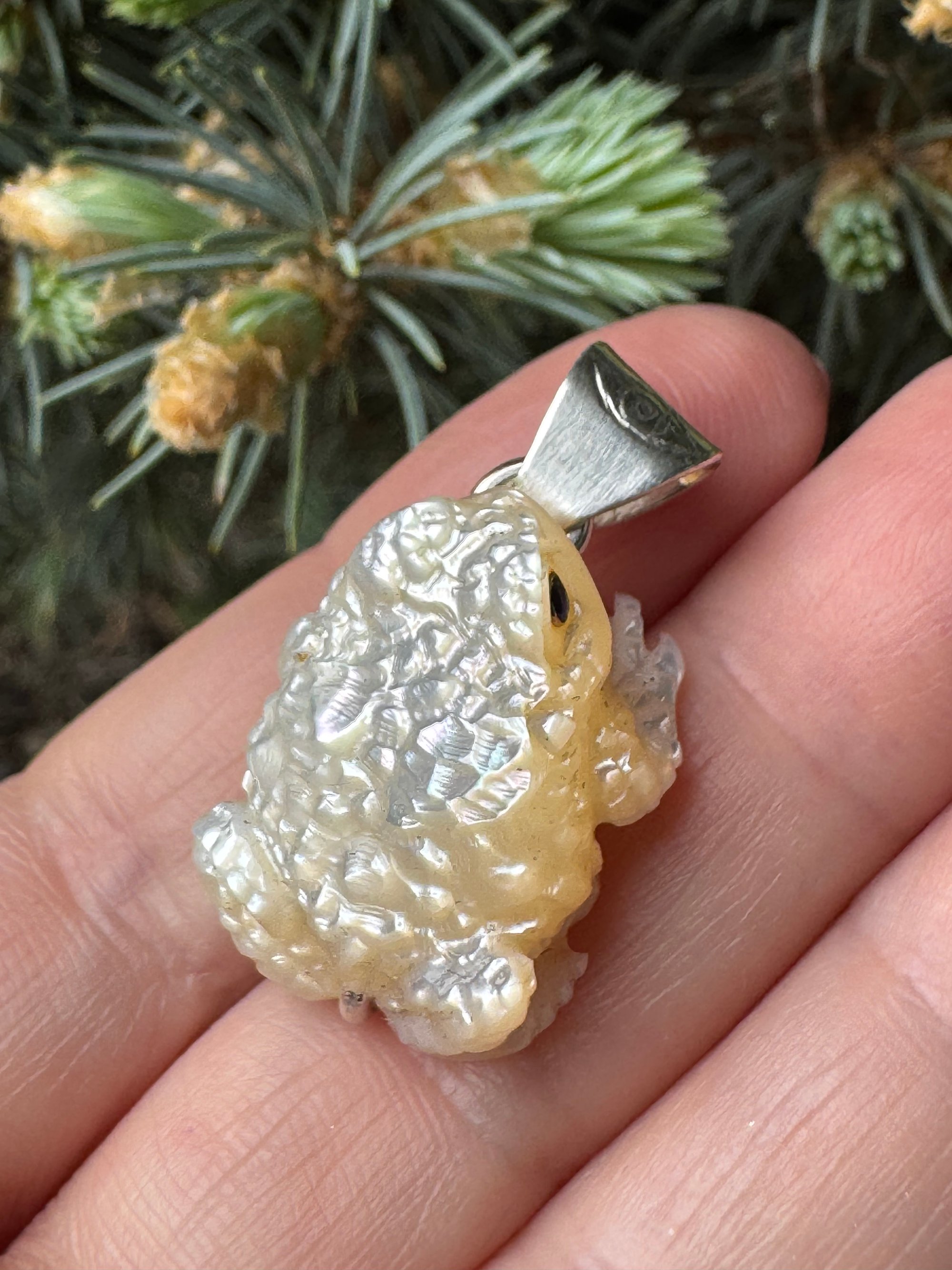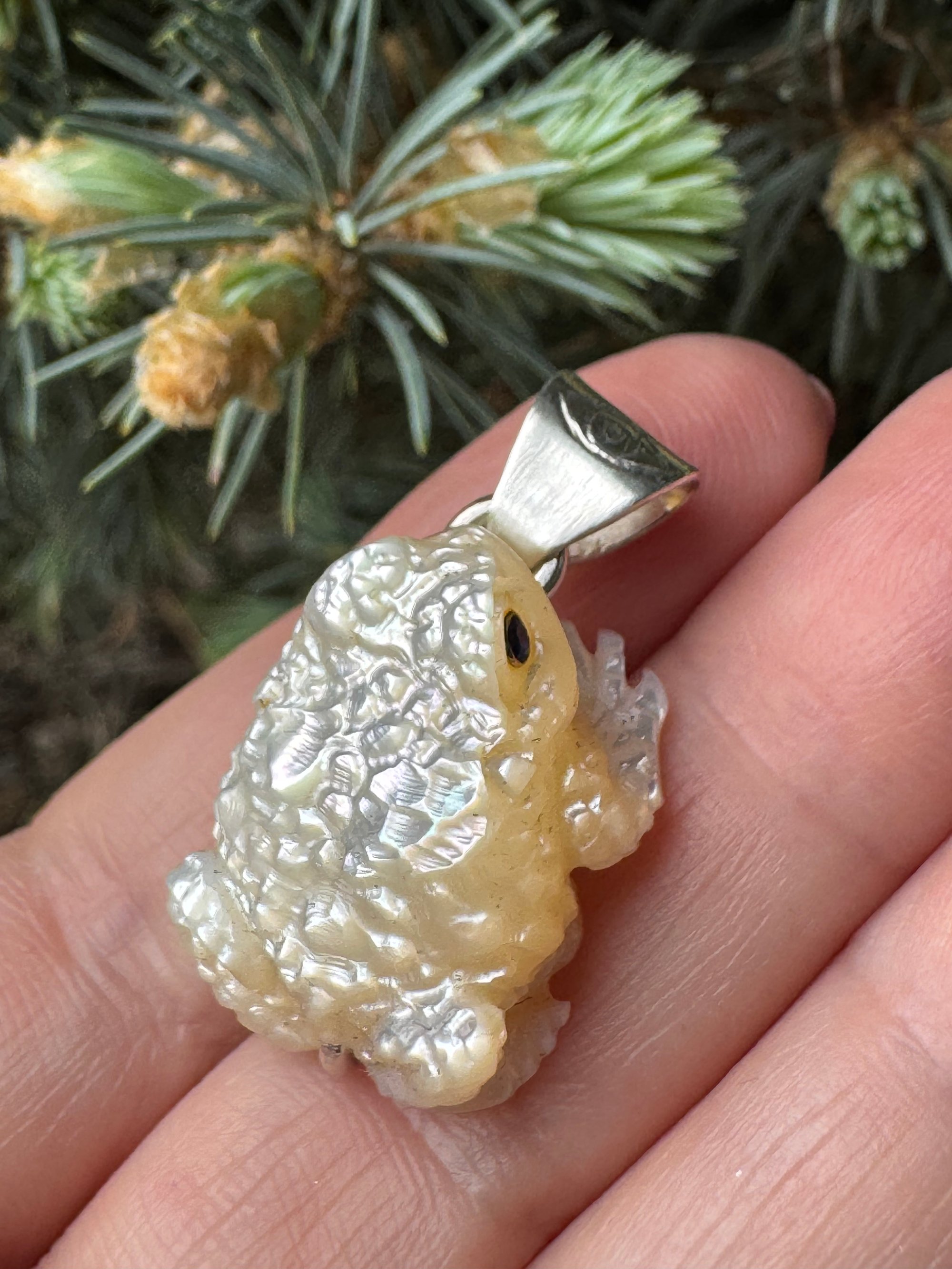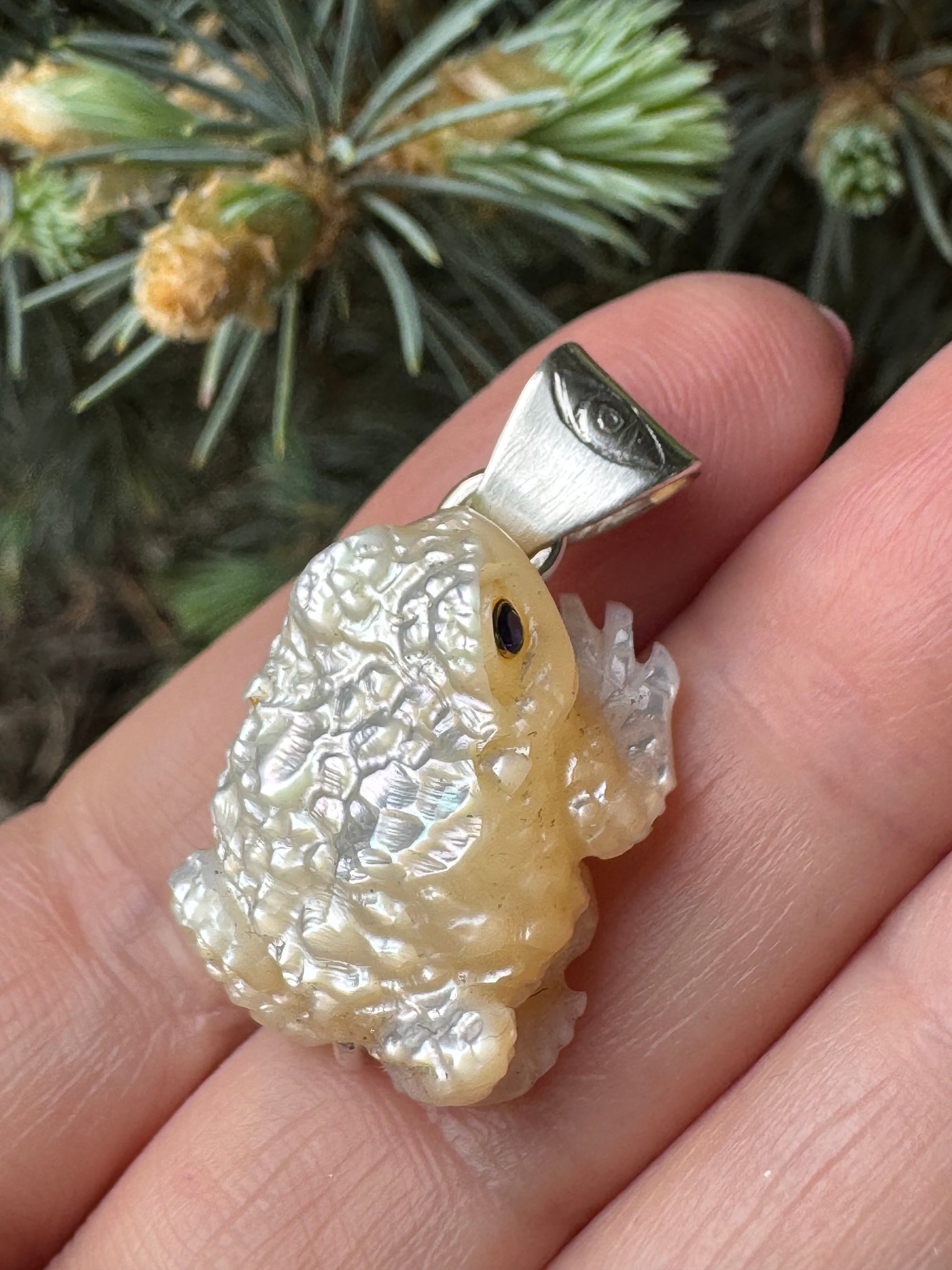 Iridescent white mother of pearl toad with sapphire eyes. Argentium silver setting with carved eye detail.