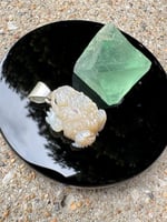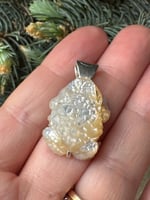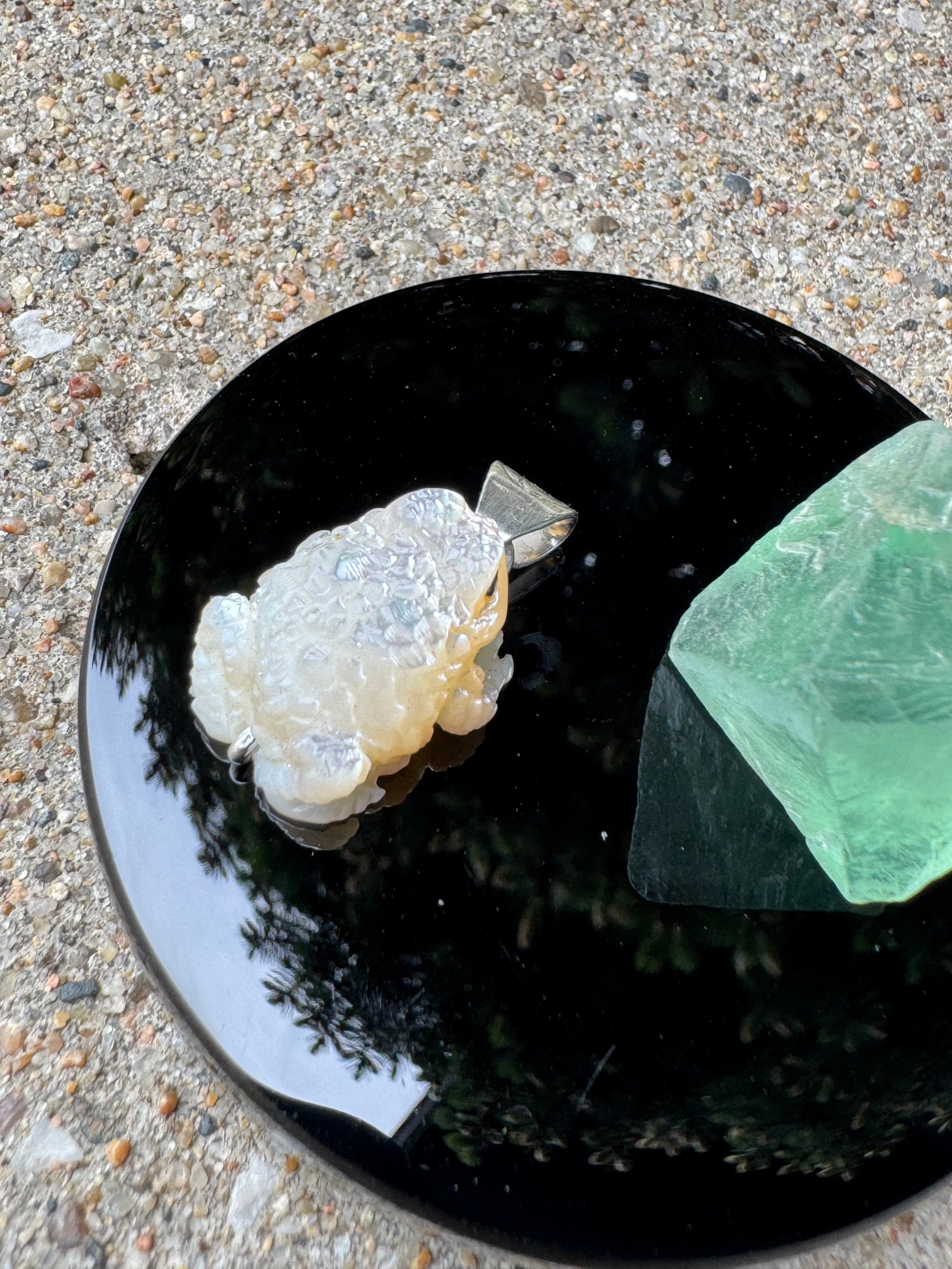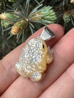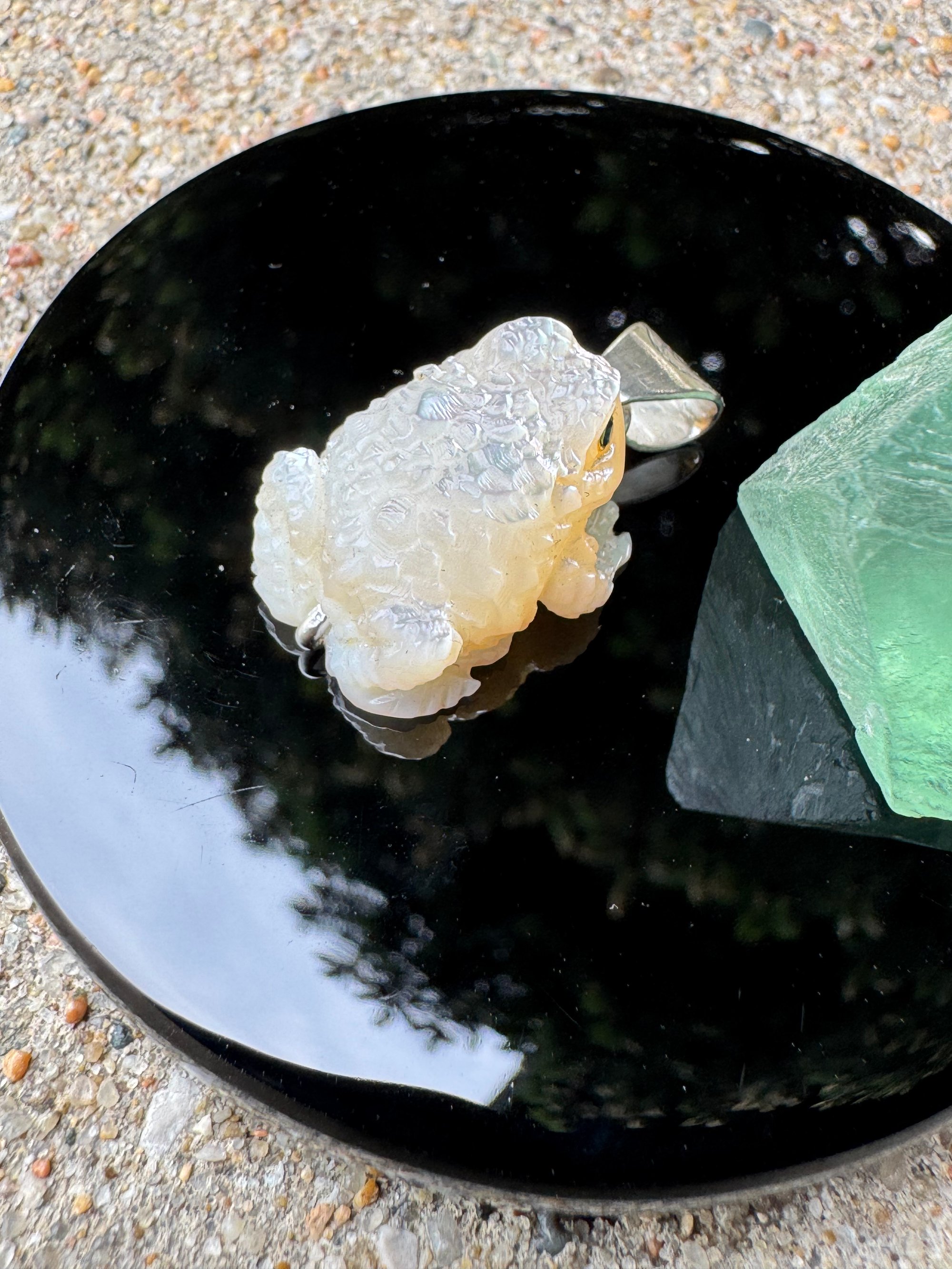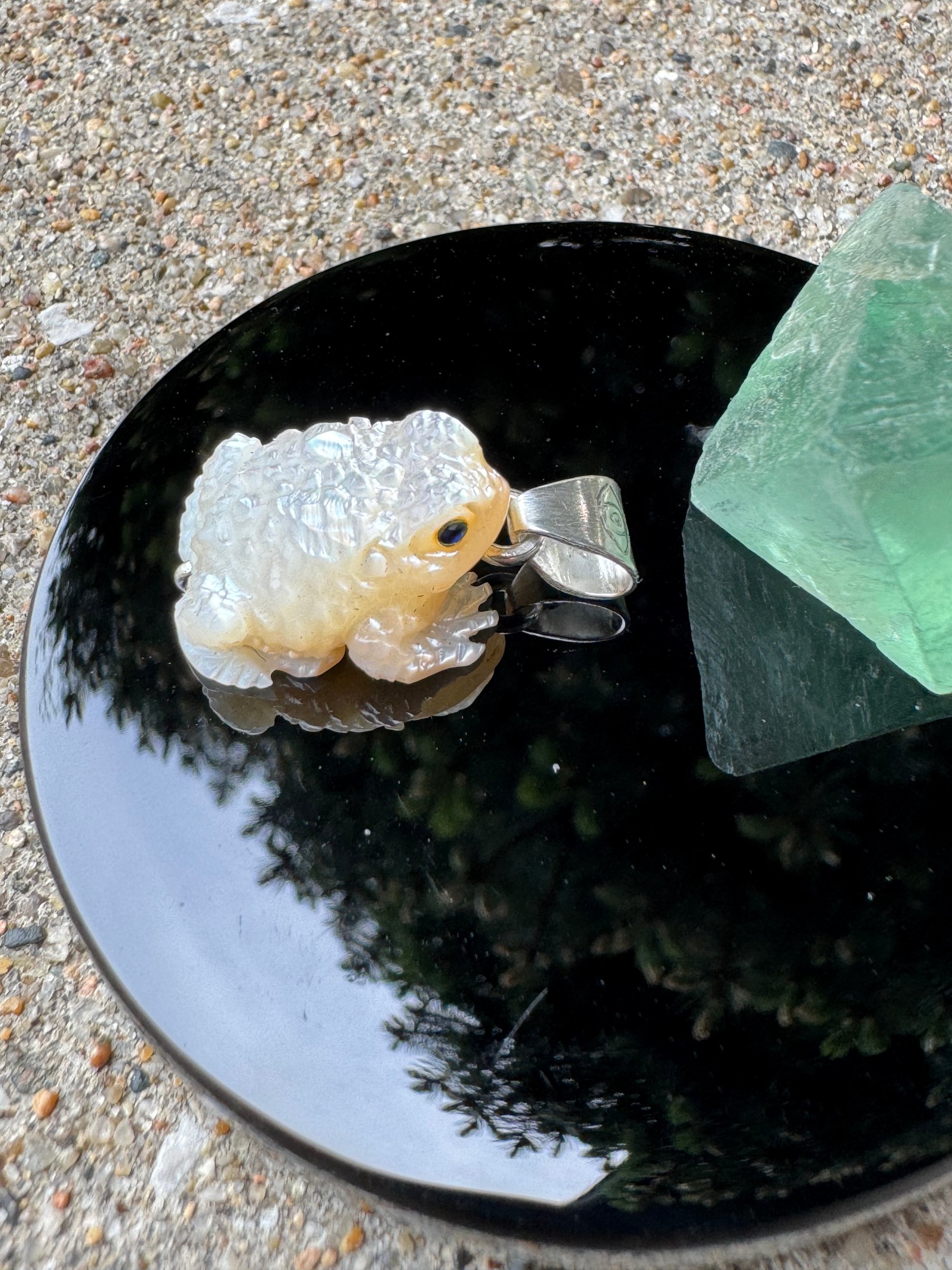 Iridescent white mother of pearl toad with sapphire eyes. Argentium silver setting with carved eye detail.